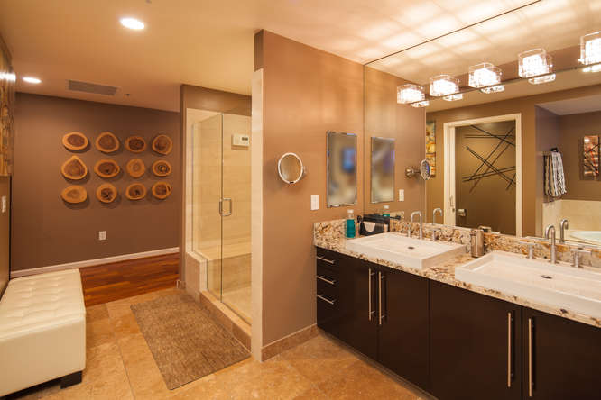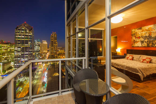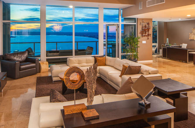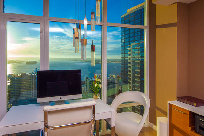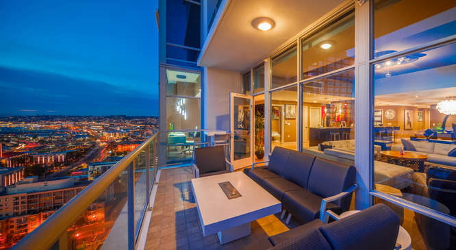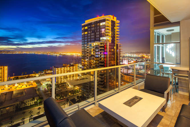 Sweeping walls of glass offer dramatic views of the San Diego Bay, Coronado and Pacific Ocean from this beautiful luxury penthouse property. Enjoy private elevator entry, two generous balconies & tremendous great room for entertaining. Designer features include honed travertine & hardwood floors, electric window coverings, custom designed doors, custom lighting & wall treatments and built-in closets in the master. Floor to ceiling 10 ft windows amplify light and make for amazing views from every room of this exclusive property that occupies half of the 24th floor.