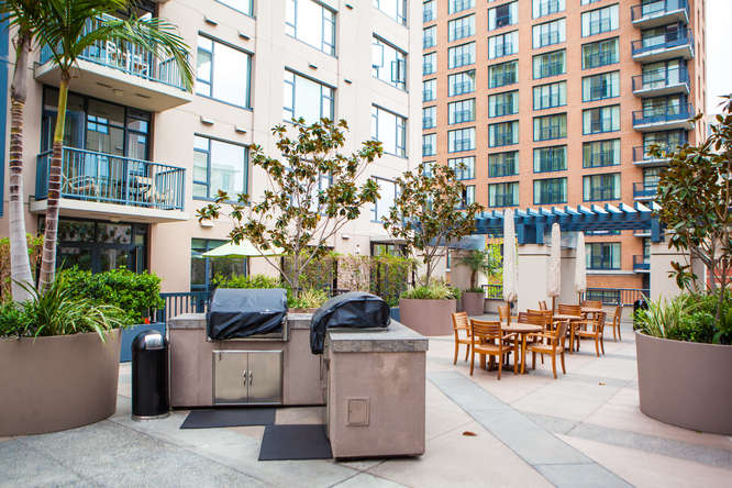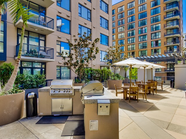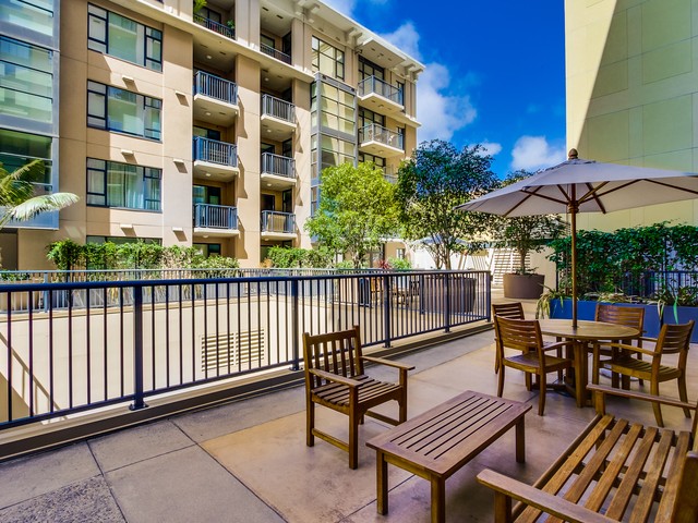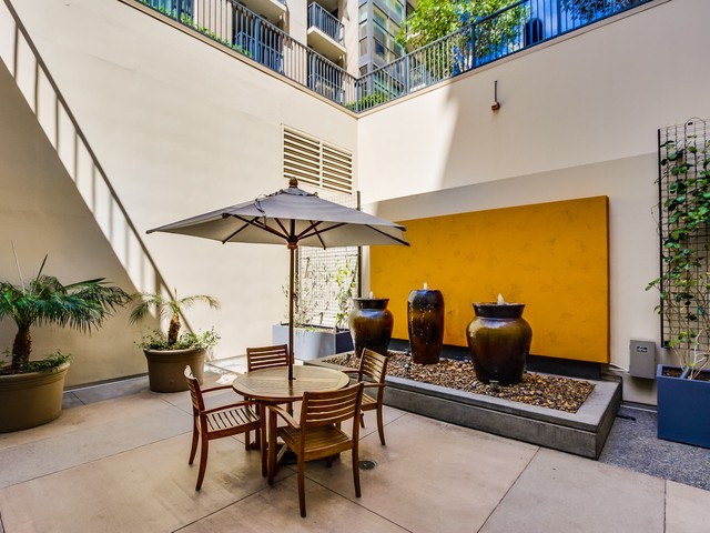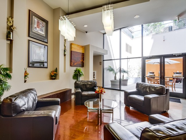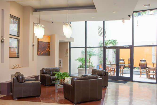 The Trellis San Diego tower to the west includes 8 stories and features great city views as well as views into the common area terrace with its tropical landscaping, BBQ’s and outdoor lounging area. The lobby is bright and contemporary and features a small lounge reception area.