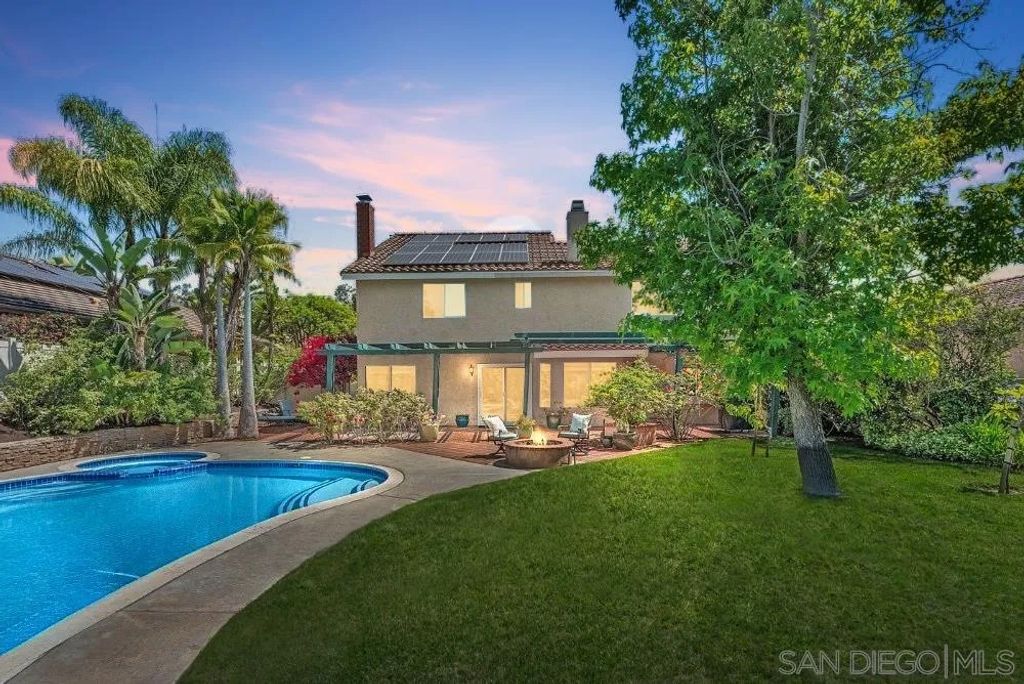 Pride of ownership is prevalent throughout this immaculate and inspiring Polo model with owned 16-panel 5.7 kW solar system. This tranquil home is nestled in the Rancho Arbolitos neighborhood of Poway, which boasts of no Mello-Roos and no HOA. Feel the splendor of this lush green landscape filled with fragrant roses and colorful flowers. Upon the first step in to this beautiful home, one will appreciate the soaring ceilings, rich walnut and Italian gres porcellanato flooring, 3 custom fireplaces, with iron doors, that set the tone of quality throughout the home. New AC condenser installed in July 2024. Plantation shutters, neutral colors upgraded finishes and fixtures. First floor bedroom and full bathroom complete with private backyard access/entryway. Gourmet kitchen complete with granite countertops, bar top seating, Viking gas cooktop, LED/recessed lighting, double-ovens, and designated breakfast area.