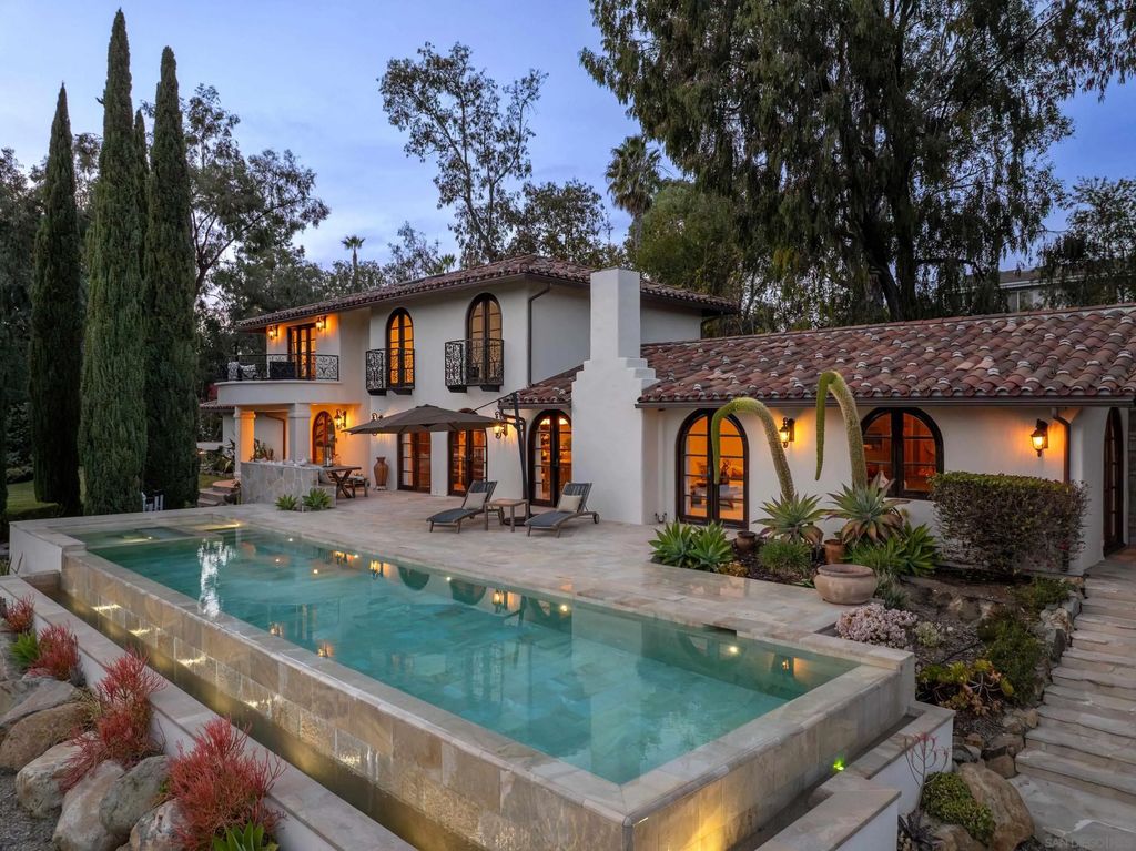 Introducing one of the most private property locations within the highly coveted community of Rancho Santa Fe, featuring a brand new European-tiled lap pool and spa with stunning sunset views. Situated on a sprawling one-acre lot with a level lower lot for a value ad of an ADU, Pickle Ball court, home garden or vineyard with its own access. This Spanish Colonial home offers unparalleled seclusion and expansive outdoor living spaces. Infused with classic old-world charm, the 4-bedroom, 3-bathroom residence was completely renovated during 2003 room additions. Thoughtfully designed, the main level boasts Spanish tile and hardwood plank flooring, a cozy sitting room/library or downstairs guest bedroom. The open floor plan features a tiled grand entry foyer, a gourmet's galley kitchen and dining area, a great room with fireplace, and an intimate lounge connecting to an outdoor kitchen and entertainment BBQ patio. Upstairs, the primary suite exudes timeless elegance, complete with a sitting balcony and serene views. Two additional bedrooms with a shared bath showcase stunning sunset vistas over the pool and surrounding hillsides of Rancho Santa Fe.The property's appeal is further enhanced by access to the private HOA lake, tennis courts, walking trails and picnic areas, ideal for family gatherings. A large play area on the lower level provides ample space for children or pets, making this retreat perfect for families seeking both luxury and functionality.