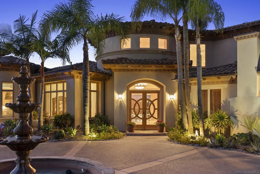 Experience timeless elegance at this luxurious estate in the exclusive guard-gated community of The Farms, Rancho Santa Fe. Set on a private corner lot with a circular driveway and a grand tiered fountain, this custom 7,470 sq. ft. home defines resort-style living. A grand rotunda entrance with wood-inlaid flooring and a three-tier chandelier sets the tone for refined sophistication. The step-down living room features a concave glass wall seamlessly connecting to the outdoors, an infinity-edge pool, panoramic views, a coffered ceiling, and a stone fireplace. The gourmet kitchen is a chef's dream with Sub-Zero appliances, a large island, walk-in pantry, and granite countertops. The adjacent family room offers a custom bar, raised-hearth fireplace, and access to the expansive outdoor kitchen with Viking appliances, a fire pit, and dining spaces. The main-level primary suite includes a cozy fireplace, sitting area, custom blinds, and a spa-like bath with dual closets and a soaking tub. Two upper-level wings offer additional ensuite bedrooms, one with a private balcony and serene golf course views. Additional highlights include a maple-paneled library, wine room, large laundry, solar panels, zoned HVAC, and a three-car garage. Indulge in unparalleled craftsmanship and design at 6906 Royal Birkdale.