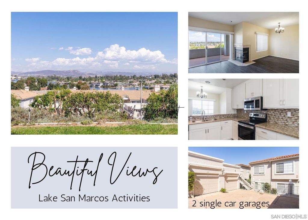 Enjoy resort style living at this 2 bedroom, 2 full bath condo in the highly sought after development of Panorama at Lake San Marcos!! The Lake, Mountain and City Lights views are yours from the kitchen, dining room, living room, primary bedroom and oversized patio!! And the cozy fireplace makes it so relaxing.