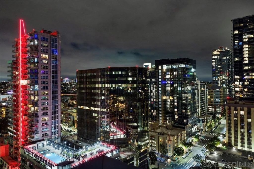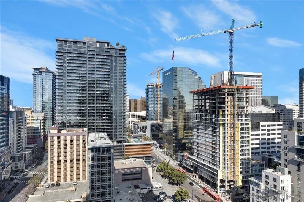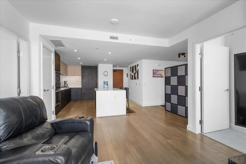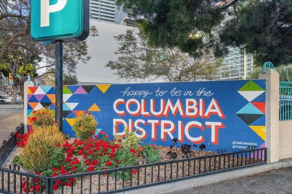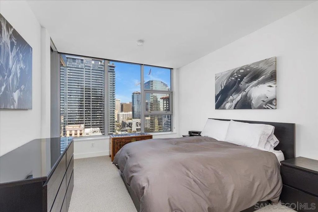 CITY VIEWS! Welcome to Savina! Downtown San Diego's newest and most luxurious condo high-rise. Perched on the 20th floor, this stunning east-facing residence offers an ideal split-bedroom layout (no shared wall), perfect for privacy and functionality. Located at the vibrant intersection of Little Italy and the Columbia District, Savina is one of Bosa's premier developments renowned for exceptional design and quality craftsmanship. Step inside to find an open-concept floor plan filled with natural light, hardwood flooring, and expansive windows that frame the panoramic city skyline views. The gourmet kitchen is a chef's dream with a large waterfall-edge quartz island, hidden paneled Thermador refrigerator, and soft-close cabinetry. The dining area is currently used as a home office, making the most of the versatile layout. Both bedrooms feature blackout shades and the private balcony is perfect for enjoying San Diego's cityscape and watching planes fly in. Additional highlights include a large private storage unit and one of the most amenity-rich offerings in Downtown: 24-hour concierge and security, resort-style pool and spa, state-of-the-art fitness center, steam and sauna rooms, resident lounge with a full kitchen and BBQ area, EV charging, dog run and pet spa, bicycle tune-up station, and more. Experience high-rise living at its finest!