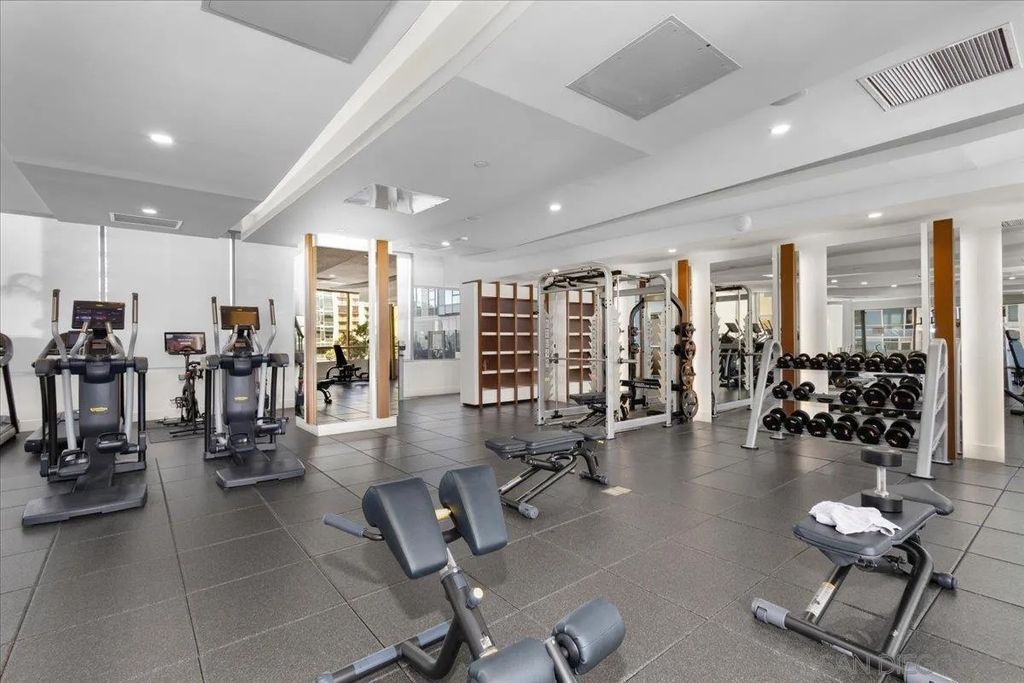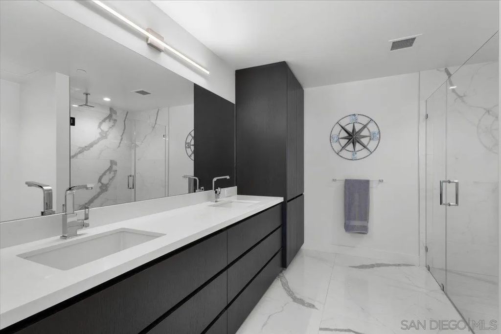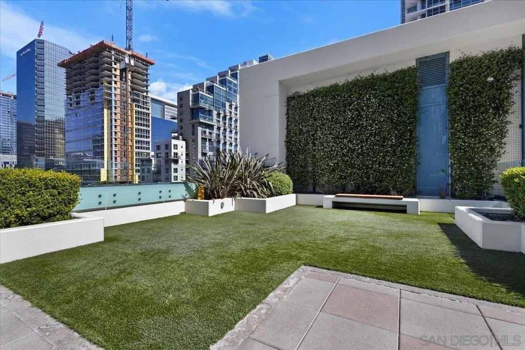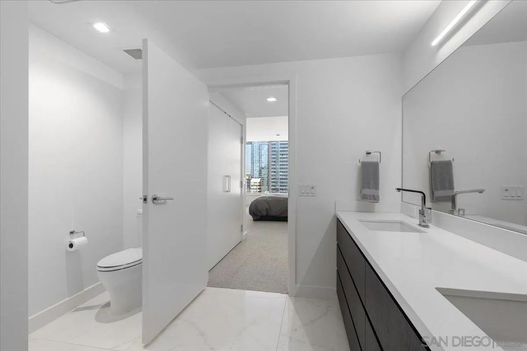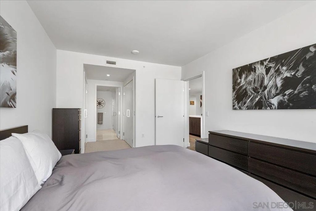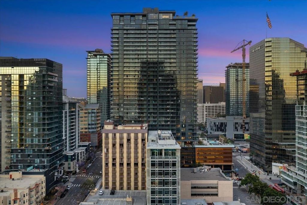 CITY VIEWS! Welcome to Savina! Downtown San Diego's newest and most luxurious condo high-rise. Perched on the 20th floor, this stunning east-facing residence offers an ideal split-bedroom layout (no shared wall), perfect for privacy and functionality. Located at the vibrant intersection of Little Italy and the Columbia District, Savina is one of Bosa's premier developments renowned for exceptional design and quality craftsmanship. Step inside to find an open-concept floor plan filled with natural light, hardwood flooring, and expansive windows that frame the panoramic city skyline views. The gourmet kitchen is a chef's dream with a large waterfall-edge quartz island, hidden paneled Thermador refrigerator, and soft-close cabinetry. The dining area is currently used as a home office, making the most of the versatile layout. Both bedrooms feature blackout shades and the private balcony is perfect for enjoying San Diego's cityscape and watching planes fly in. Additional highlights include a large private storage unit and one of the most amenity-rich offerings in Downtown: 24-hour concierge and security, resort-style pool and spa, state-of-the-art fitness center, steam and sauna rooms, resident lounge with a full kitchen and BBQ area, EV charging, dog run and pet spa, bicycle tune-up station, and more. Experience high-rise living at its finest!