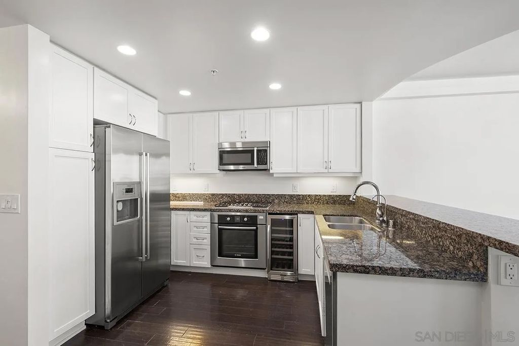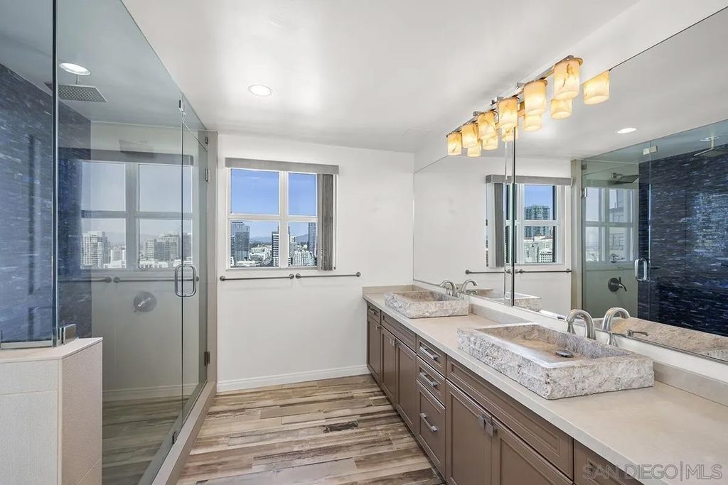 Perched high above the city on the 22nd floor, this sophisticated northeast corner residence at Horizons captures panoramas of the bay, ocean, city skyline, and even distant mountaintops. Expansive windows flood the space with natural light, perfectly framing the ever-changing scenery, while the private balcony"”accessible from the living area and both bedrooms"”offers a front-row seat to San Diego's dazzling skyline. Inside, the open and airy floor plan is designed for both comfort and style. Gleaming wood floors extend through the living area, where an ambient fireplace adds warmth and charm. The entertainer's kitchen is a showstopper, featuring stainless appliances, granite countertops, freshly painted cabinetry, recessed lighting, and a built-in wine chiller. Retreat to the primary suite, where stunning views, and direct balcony access. The spa-inspired ensuite bath elevates relaxation with a dual vanity and a step-in shower adorned with exquisite mosaic tile. The second bedroom, also with balcony access, is ideal for guests or a home office with a view. Complete with two parking spaces and a dedicated storage unit, this fully turnkey residence offers effortless upscale living. Experience the best of the Marina District's premier high-rise"”where sparkling city lights and endless blue water views become part of your everyday life. The Horizons boasts an unbeatable location in the Marina District, placing you steps from the New Children's Museum, the scenic Martin Luther King Jr. Promenade, and Seaport Village. And with both a children's park and a dog park right behind the community, fun is always within easy reach for kids and furry friends alike. Resort-style amenities include a pool, spa, fitness center, concierge, security, billiard room, conference room, and guest parking. Convenience is built in, with an array of retailers just an elevator ride away"”a bank, tanning salon, dry cleaners, Postal Annex, and a coffee/sandwich shop. Plus, you're within walking distance of bus and trolley lines, top-rated restaurants, shopping, and a 24-hour Ralphs Signature Market just around the corner.