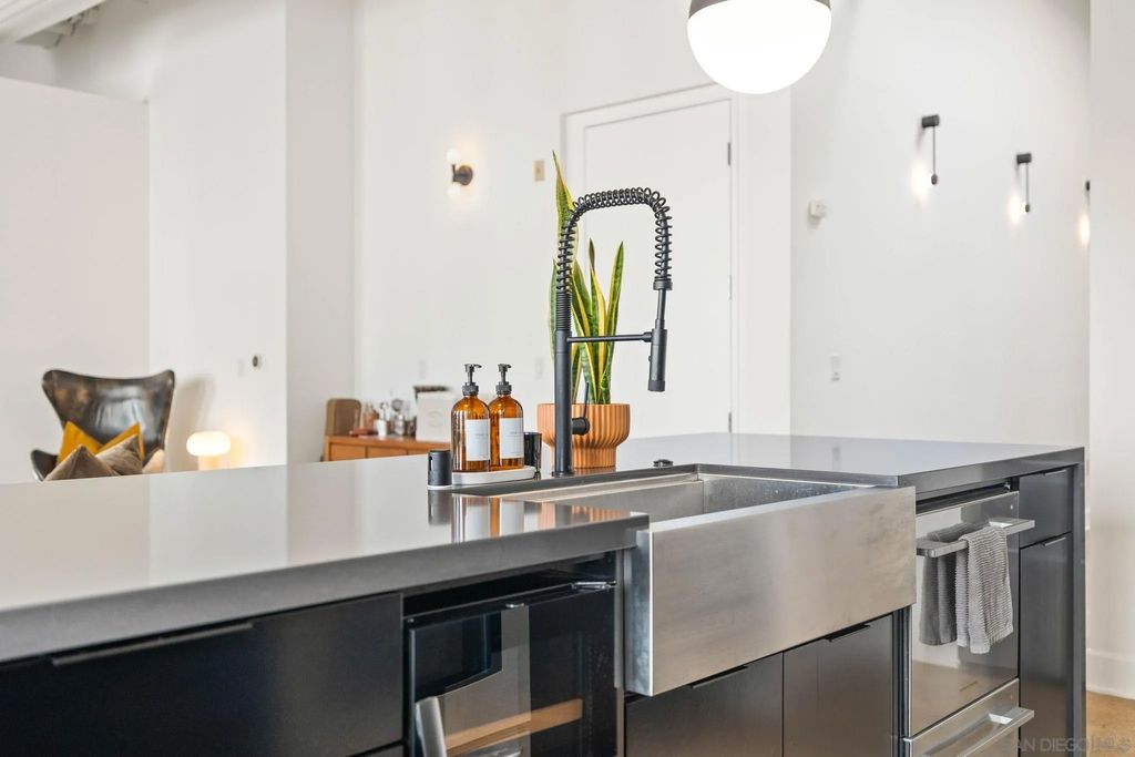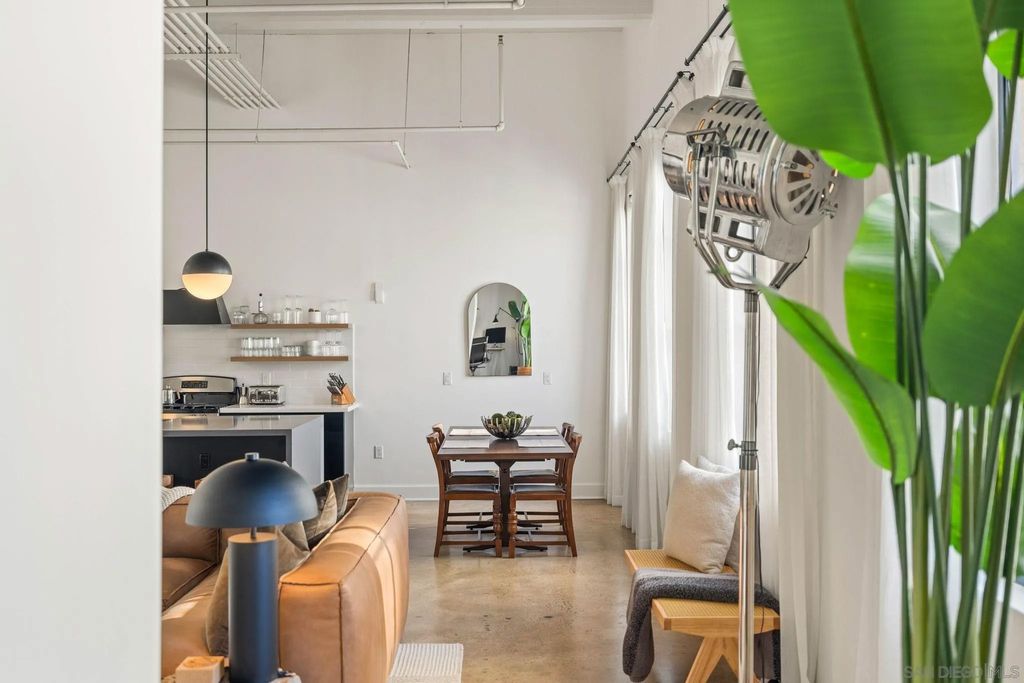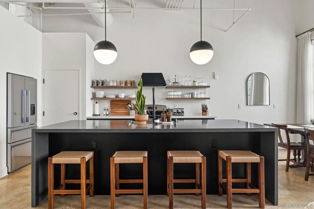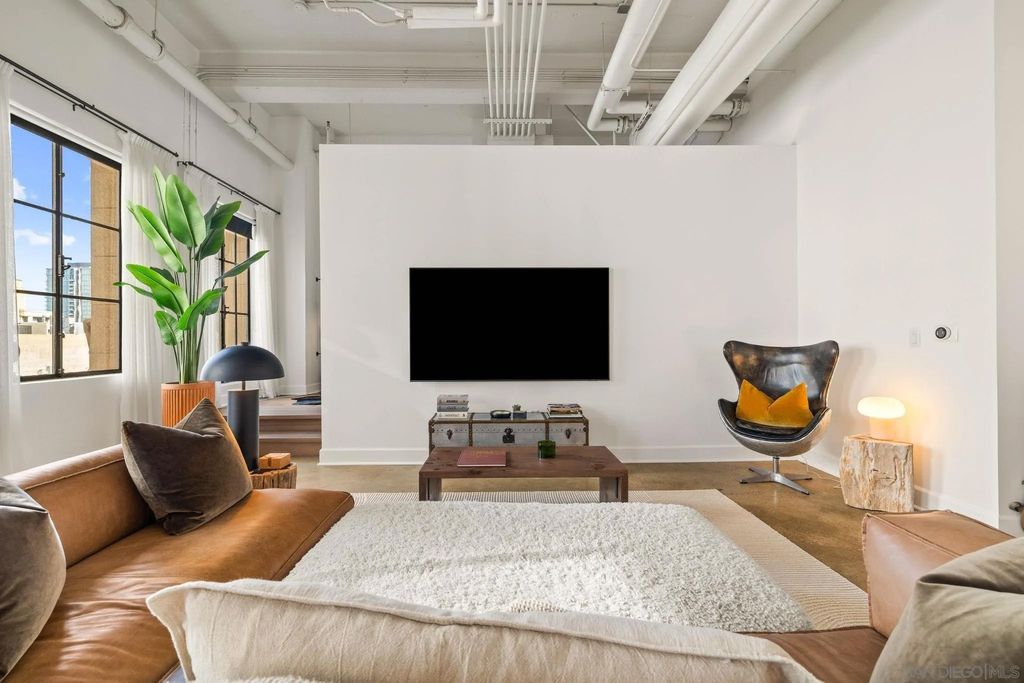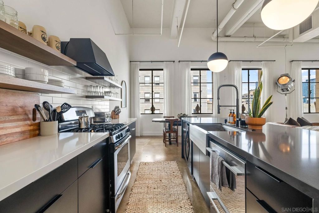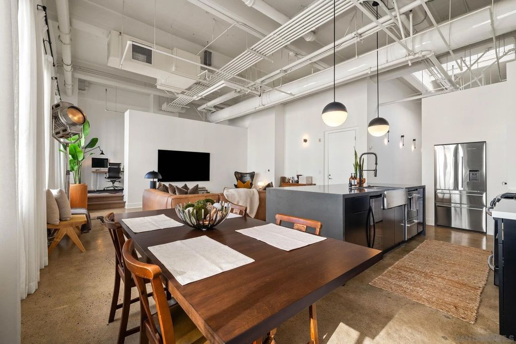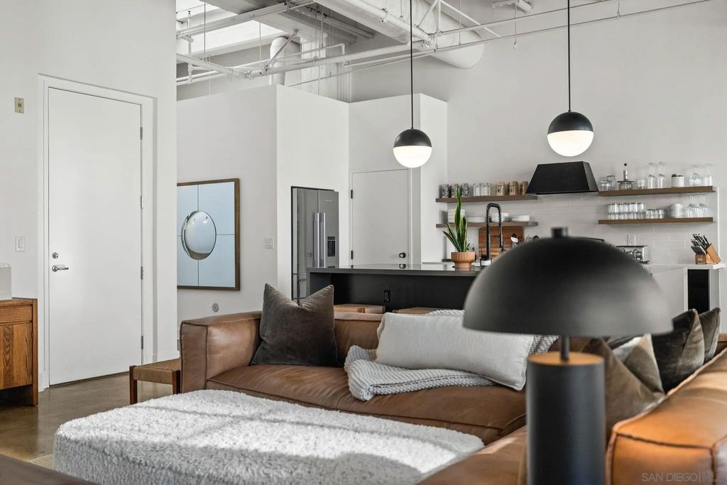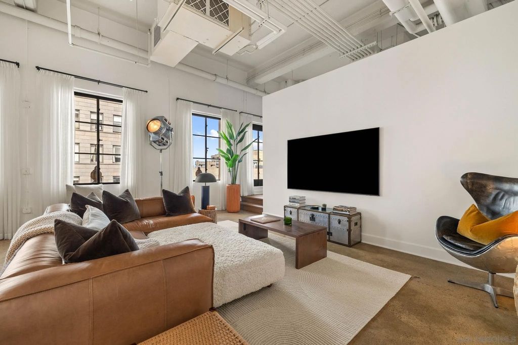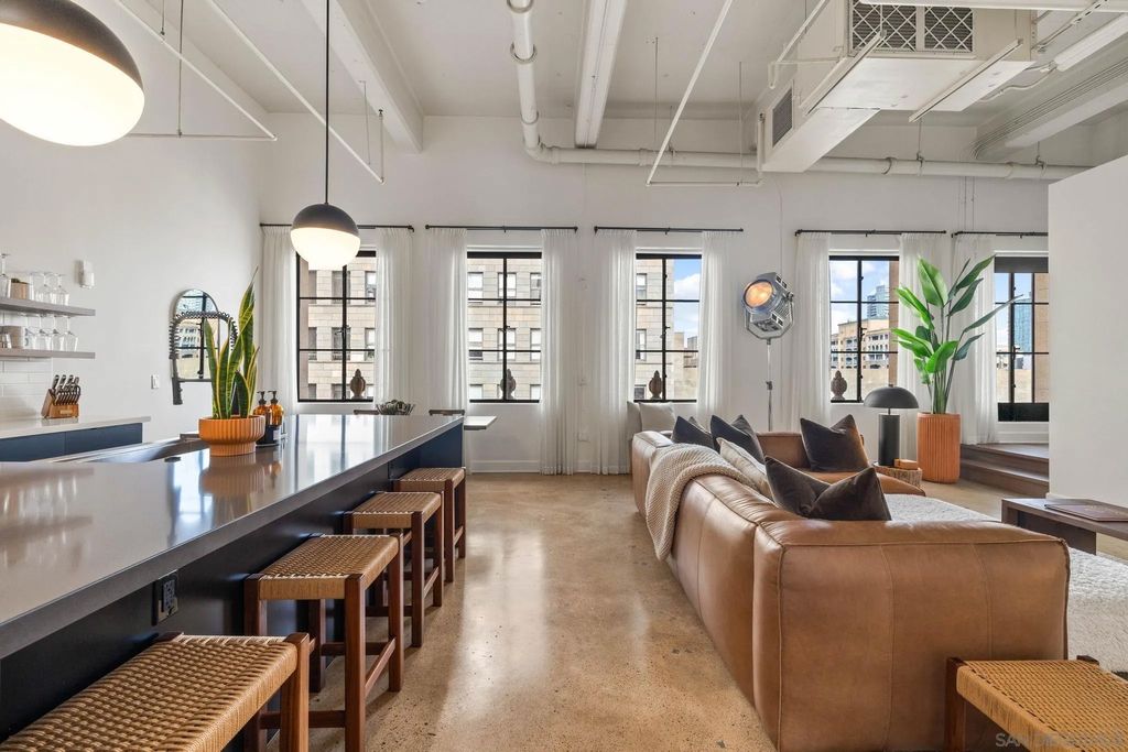 A rare offering in the architecturally renowned Samuel Fox Lofts. This turnkey, fully furnished, 1,201 SF residence blends historic architecture with modern, high-end design ready for immediate move in or your next luxury rental investment. With soaring 15-foot ceilings, expansive windows, and two skylights, natural light floods this top-floor unit with downtown city views. Meticulously remodeled with custom upgrades, the chef's kitchen features an expansive waterfall island, pantry with appliance storage, open shelving, wine fridge, and brand-new Fisher & Paykel appliances. A thoughtfully designed elevated alcove creates defined zones for sleeping and working, a unique feature for true loft living. The spa-like bathroom offers a dual vanity, luxury shower with dual showerheads, private water closet, and personal sauna down the hall. Polished concrete floors, curated lighting, and modern decor throughout the home creates an exceptional level of comfort for a loft layout. Located in the historically designated 1920s building by William Templeton Johnson, residents can enjoy panoramic skyline views on the rooftop deck featuring community garden, fire pit, and grilling station. Other amenities include 2 assigned garage parking spots, storage unit, high speed Google Fiber internet, and full-size brand-new washer/dryer in unit. Enjoy city living at its finest in this historic, pedestrian-friendly neighborhood overflowing with diverse restaurants, shopping, nightlife, and entertainment at Petco Park!