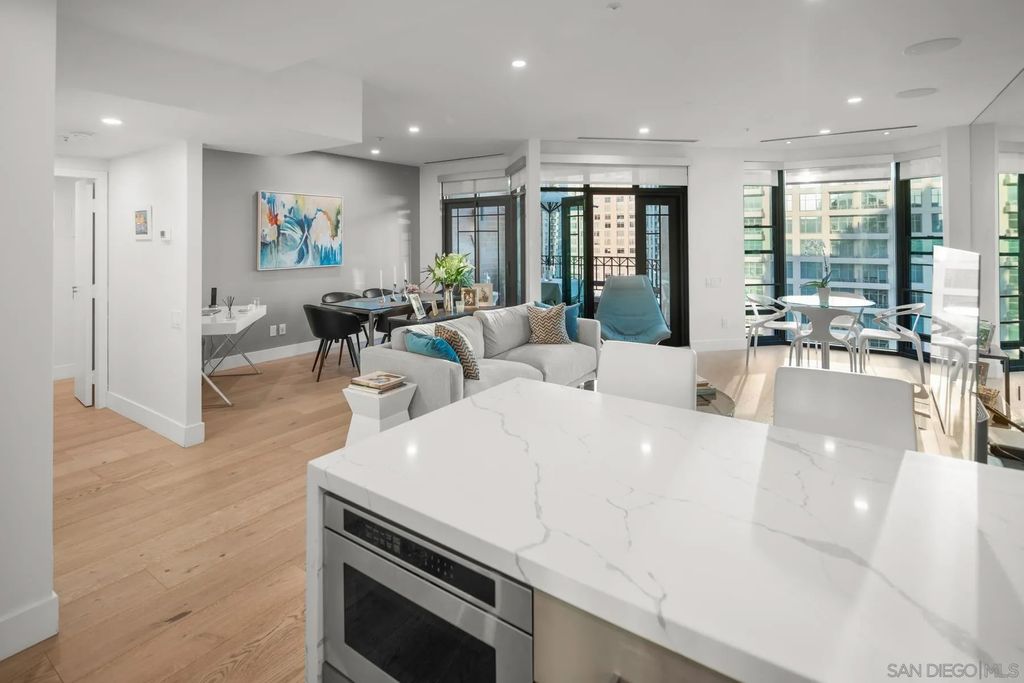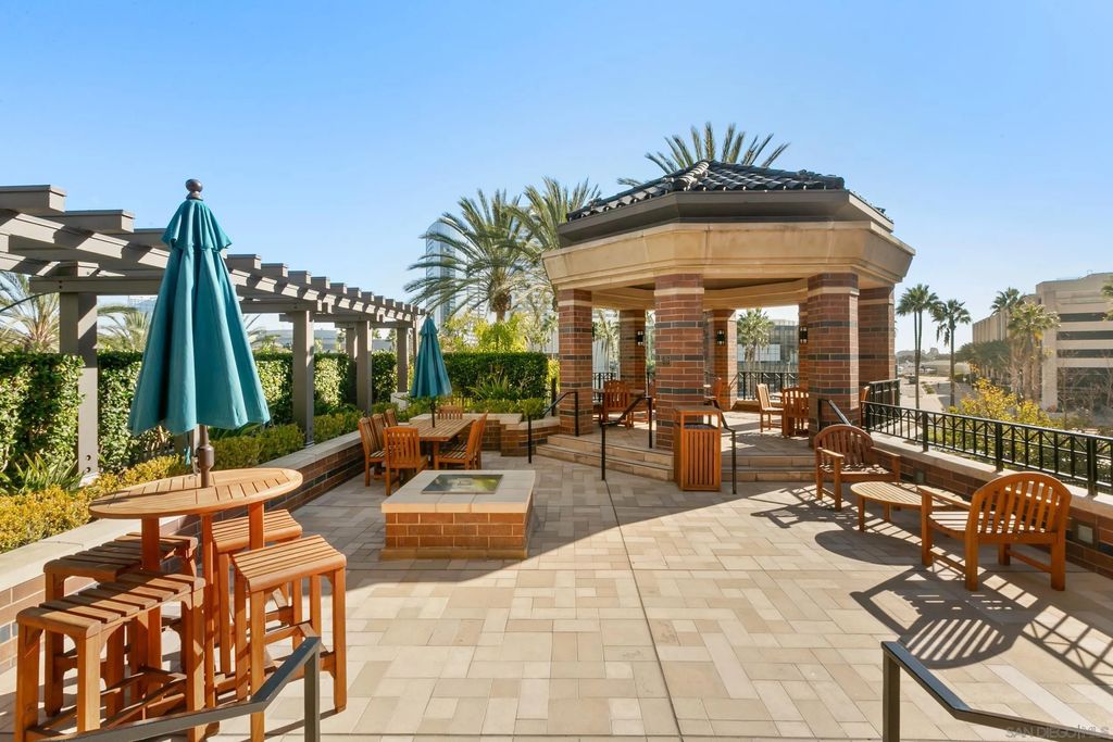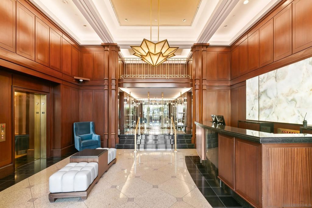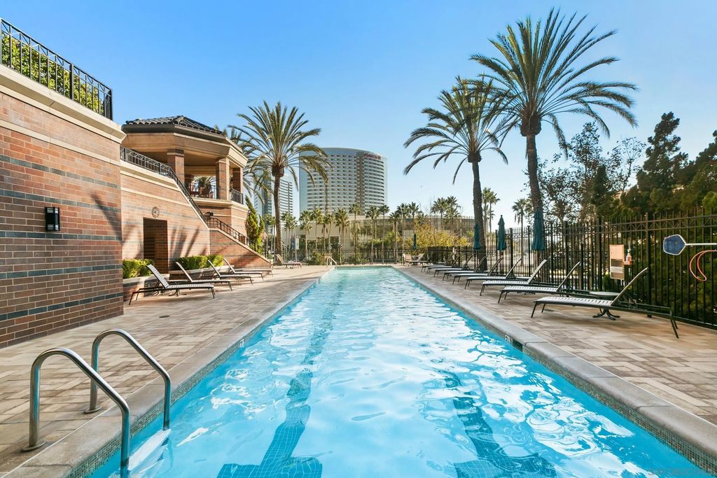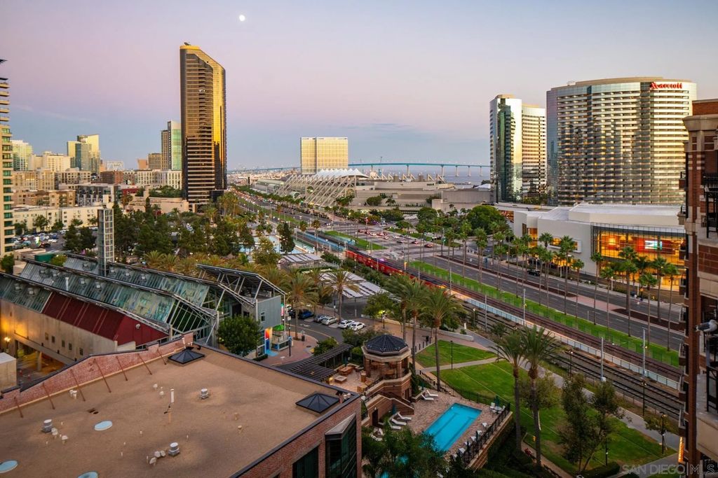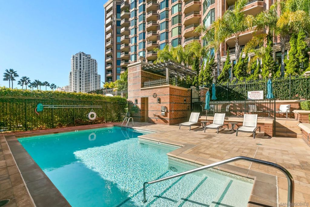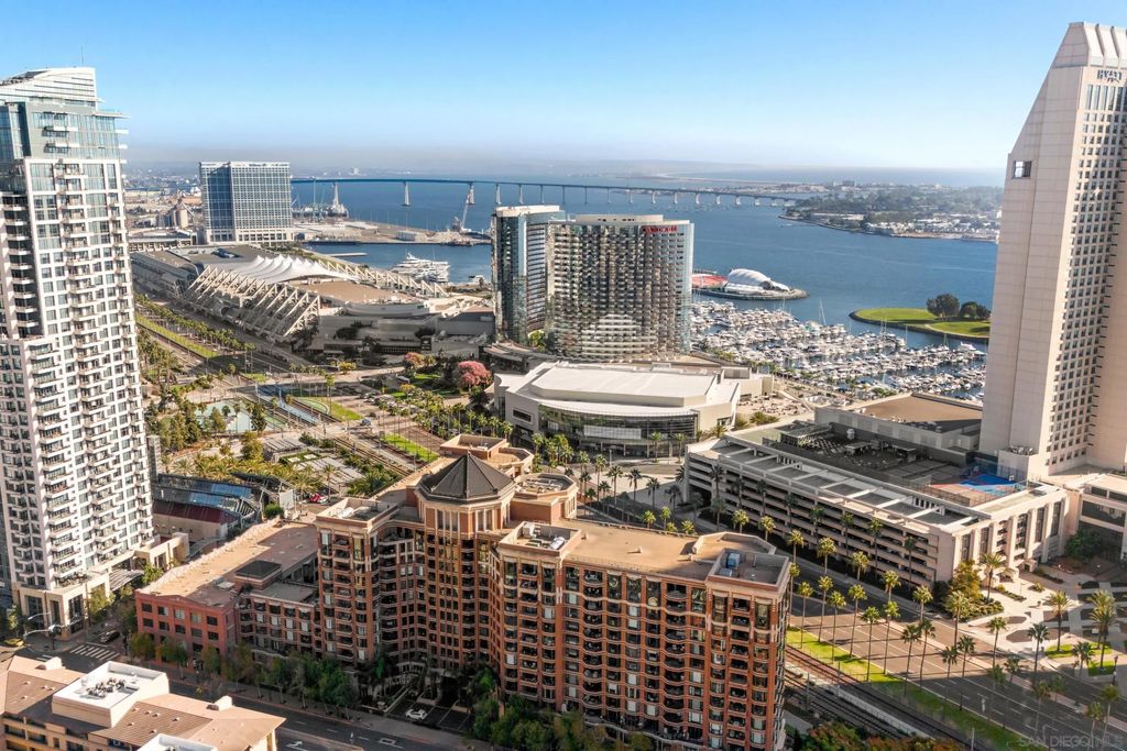 Discover contemporary luxury in this fully reimagined 1-bedroom, 2-bath penthouse at the iconic CityFront Terrace. Once a 2-bedroom, this sleek and spacious home can easily be converted back, or enjoyed as an expansive 1-bedroom retreat with open, light-filled living areas that frame stunning city and bay views. A spacious view balcony adjoins the living area, creating seamless indoor/outdoor living and the perfect space to relax or entertain. A state-of-the-art kitchen boasts quartz waterfall counters, custom cabinetry, and premium stainless appliances, while both baths impress with stone tile, smart mirrors, and designer fixtures for a spa-like ambiance. Hardwood floors, surround sound, recessed lighting, and thoughtful upgrades elevate the home's modern design. Parking is effortless with a prime garage space just steps from the elevator (self-park or valet) plus a private storage unit. CityFront Terrace seamlessly blends modern living with historic charm as part of the restored Citrus Soap Factory. Residents enjoy 2 heated pools, spa, BBQ pavilion, outdoor dining, firepit, entertainment lounge, fitness center, sauna, business facilities, and 24/7 front desk service"”all with remarkably low HOA fees. Stroll through the serene urban courtyard with its tranquil water feature, the perfect retreat in the heart of downtown. Situated in the Marina District, this home offers unmatched access to San Diego's waterfront, Gaslamp Quarter, Little Italy, Petco Park, dining, shopping, and vibrant nightlife.