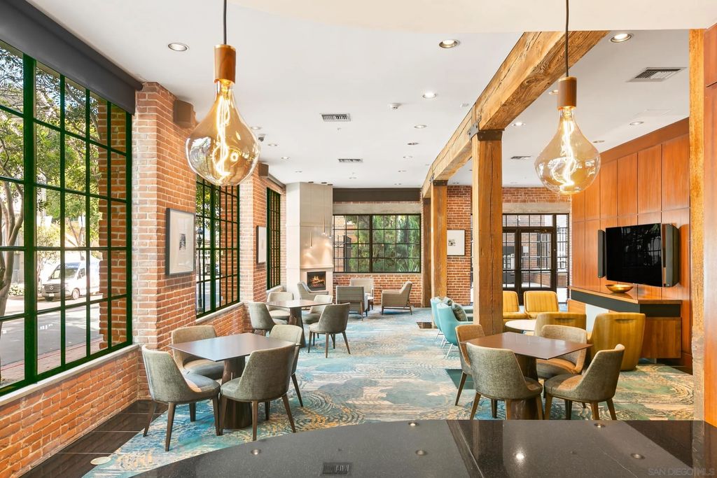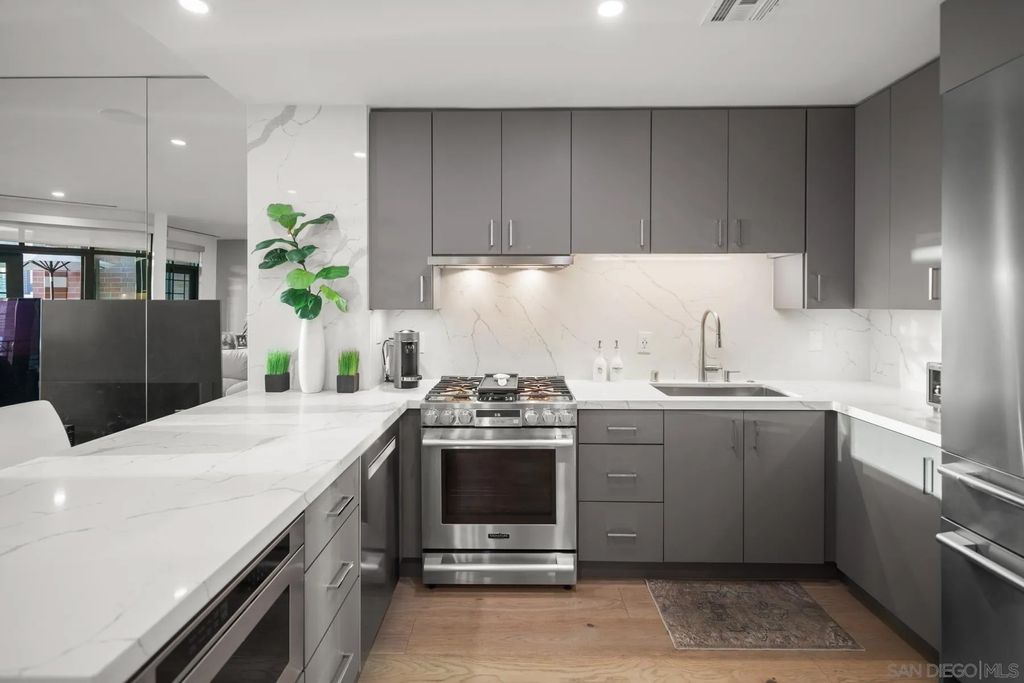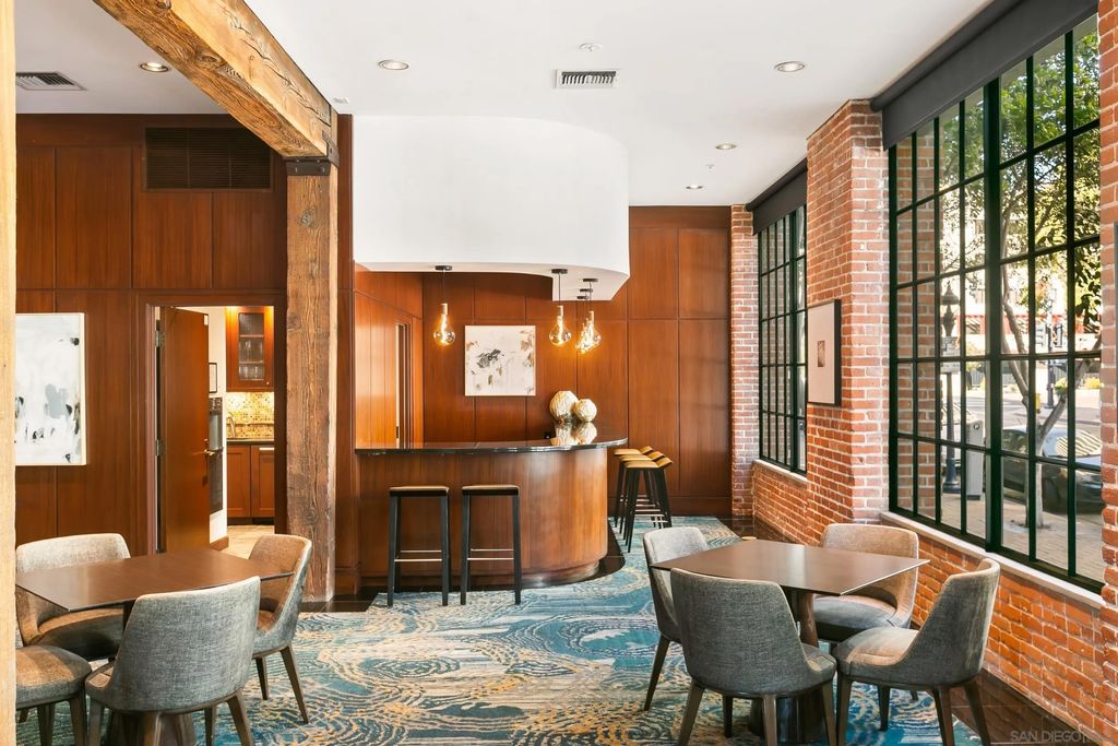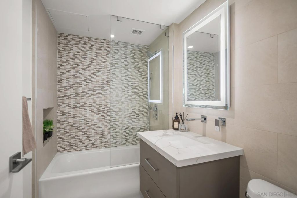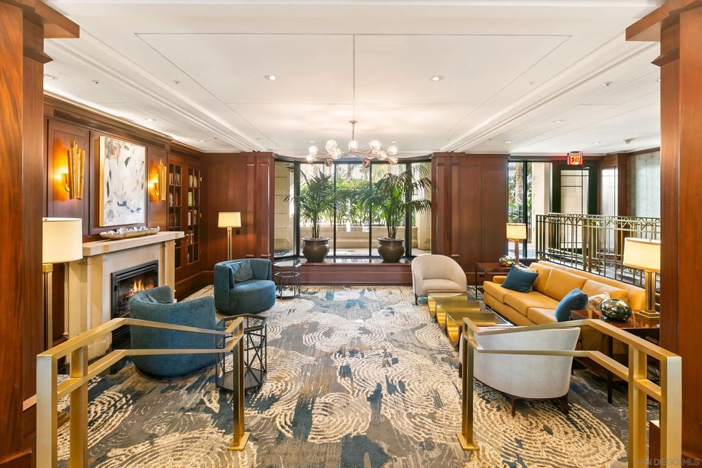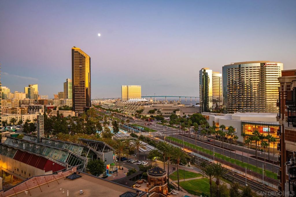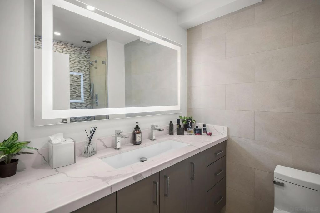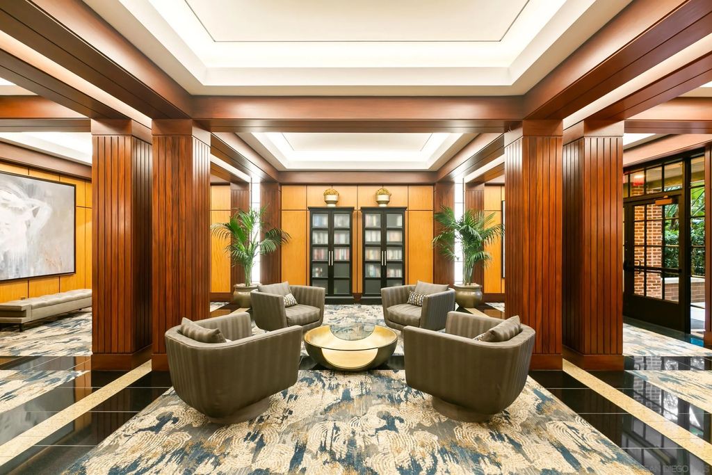 Discover contemporary luxury in this fully reimagined 1-bedroom, 2-bath penthouse at the iconic CityFront Terrace. Once a 2-bedroom, this sleek and spacious home can easily be converted back, or enjoyed as an expansive 1-bedroom retreat with open, light-filled living areas that frame stunning city and bay views. A spacious view balcony adjoins the living area, creating seamless indoor/outdoor living and the perfect space to relax or entertain. A state-of-the-art kitchen boasts quartz waterfall counters, custom cabinetry, and premium stainless appliances, while both baths impress with stone tile, smart mirrors, and designer fixtures for a spa-like ambiance. Hardwood floors, surround sound, recessed lighting, and thoughtful upgrades elevate the home's modern design. Parking is effortless with a prime garage space just steps from the elevator (self-park or valet) plus a private storage unit. CityFront Terrace seamlessly blends modern living with historic charm as part of the restored Citrus Soap Factory. Residents enjoy 2 heated pools, spa, BBQ pavilion, outdoor dining, firepit, entertainment lounge, fitness center, sauna, business facilities, and 24/7 front desk service"”all with remarkably low HOA fees. Stroll through the serene urban courtyard with its tranquil water feature, the perfect retreat in the heart of downtown. Situated in the Marina District, this home offers unmatched access to San Diego's waterfront, Gaslamp Quarter, Little Italy, Petco Park, dining, shopping, and vibrant nightlife.