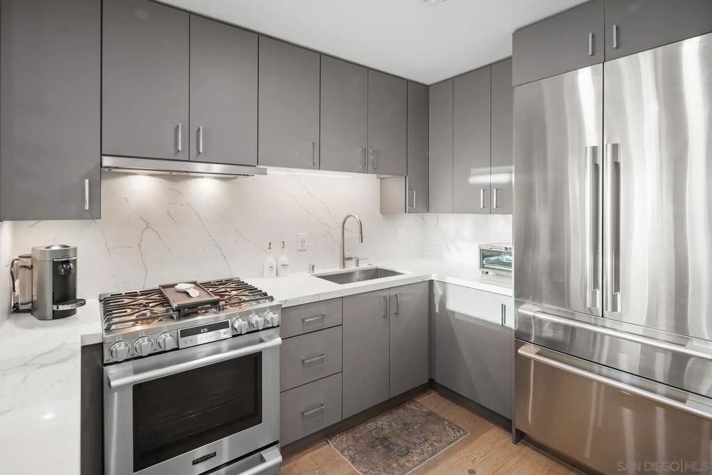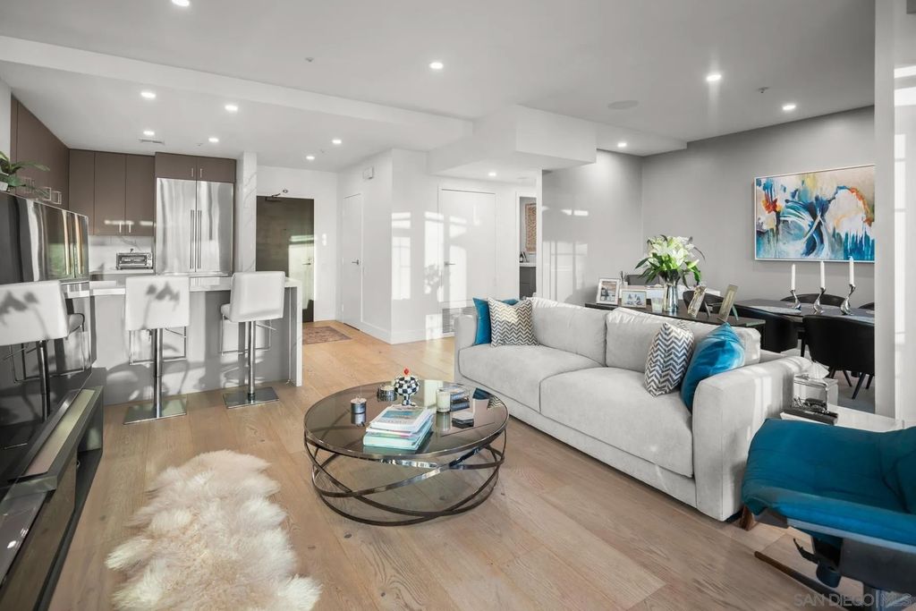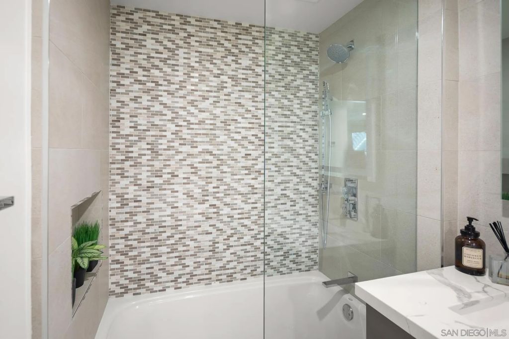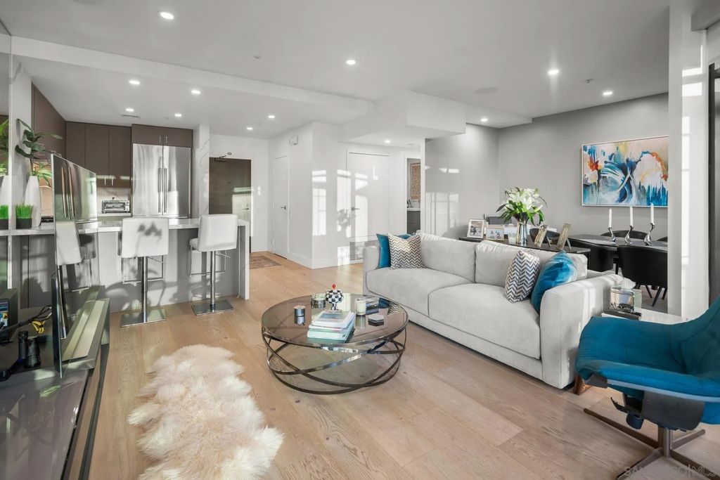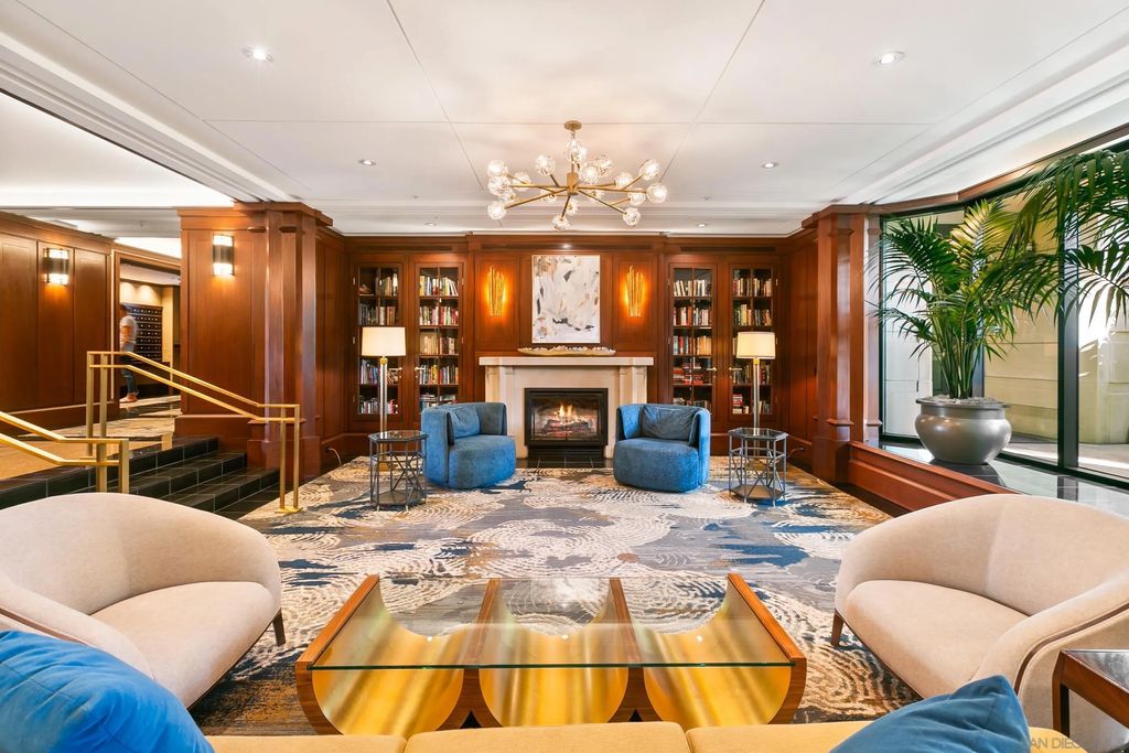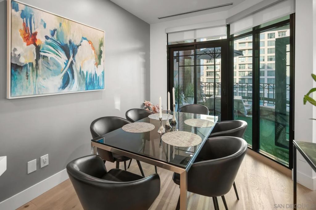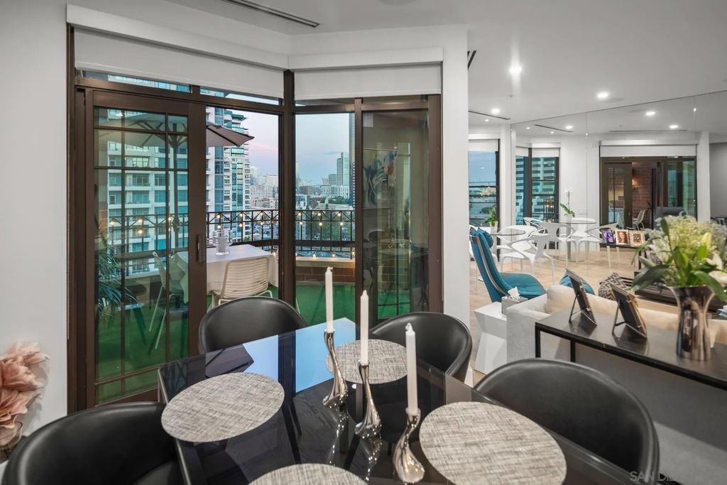 Discover contemporary luxury in this fully reimagined 1-bedroom, 2-bath penthouse at the iconic CityFront Terrace. Once a 2-bedroom, this sleek and spacious home can easily be converted back, or enjoyed as an expansive 1-bedroom retreat with open, light-filled living areas that frame stunning city and bay views. A spacious view balcony adjoins the living area, creating seamless indoor/outdoor living and the perfect space to relax or entertain. A state-of-the-art kitchen boasts quartz waterfall counters, custom cabinetry, and premium stainless appliances, while both baths impress with stone tile, smart mirrors, and designer fixtures for a spa-like ambiance. Hardwood floors, surround sound, recessed lighting, and thoughtful upgrades elevate the home's modern design. Parking is effortless with a prime garage space just steps from the elevator (self-park or valet) plus a private storage unit. CityFront Terrace seamlessly blends modern living with historic charm as part of the restored Citrus Soap Factory. Residents enjoy 2 heated pools, spa, BBQ pavilion, outdoor dining, firepit, entertainment lounge, fitness center, sauna, business facilities, and 24/7 front desk service"”all with remarkably low HOA fees. Stroll through the serene urban courtyard with its tranquil water feature, the perfect retreat in the heart of downtown. Situated in the Marina District, this home offers unmatched access to San Diego's waterfront, Gaslamp Quarter, Little Italy, Petco Park, dining, shopping, and vibrant nightlife.