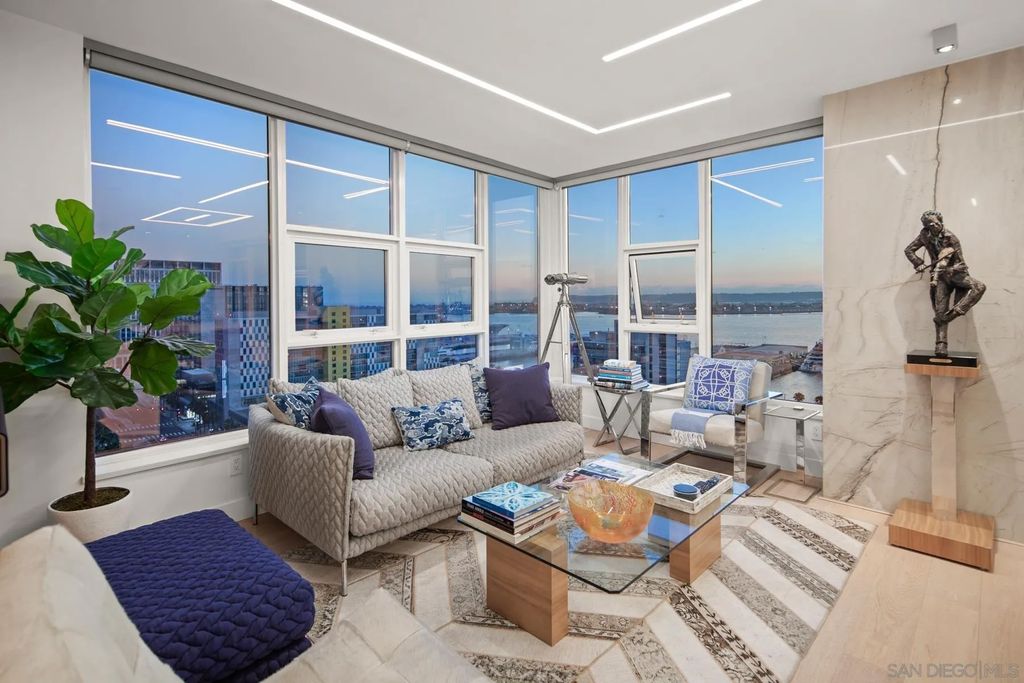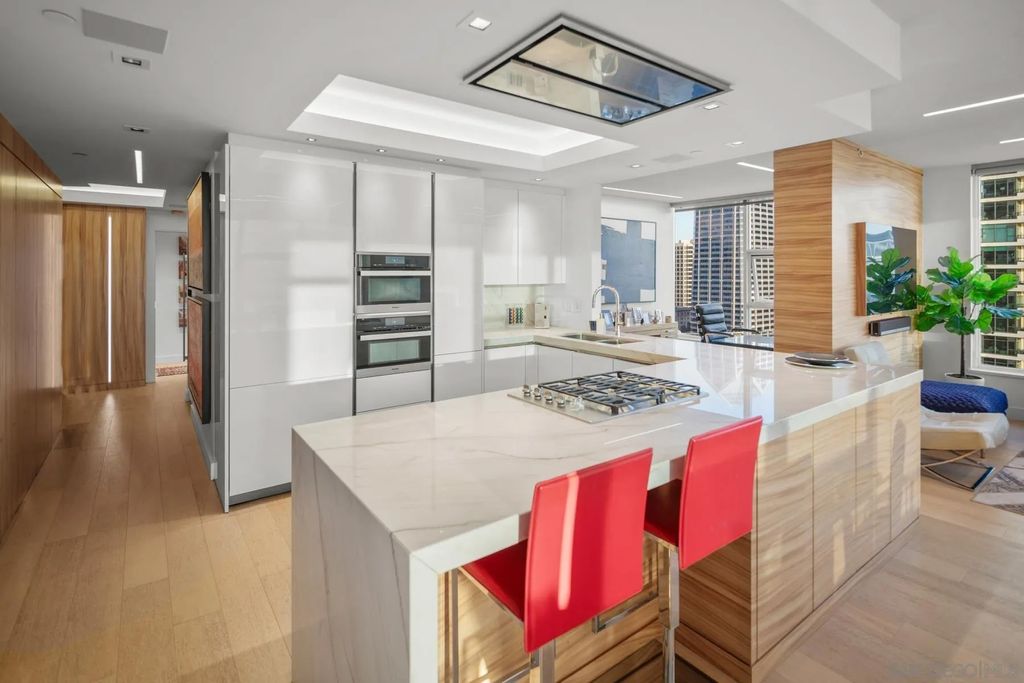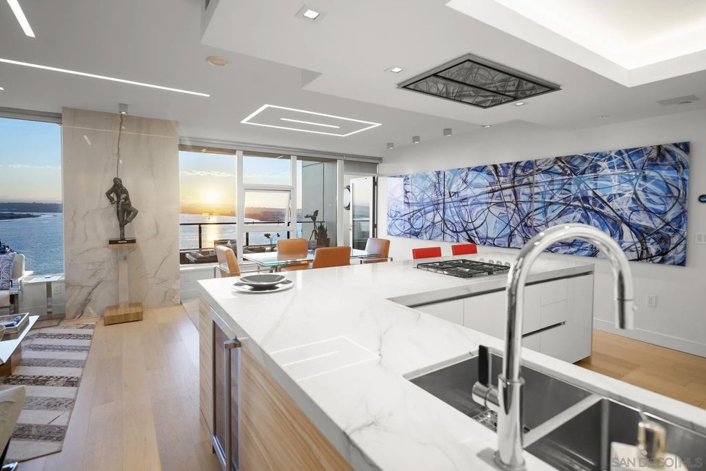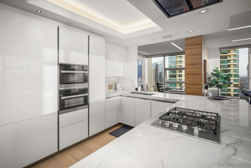 Truly one-of-a-kind, thoroughly upgraded residence in one of San Diego's premier luxury high-rises"”Bayside on Millionaire's Row. No expense was spared in this extraordinary southwest-facing corner unit, offering sweeping views of the bay, city skyline, and unforgettable sunsets over the Pacific. Meticulously maintained by the original owner, this home underwent a complete down-to-the-studs remodel in 2018 with over $500,000 in ultra-premium upgrades, all designed to maximize the views and floorplan and elevate the living experience to an exceptional level. Step inside through a dramatic formal entry featuring coffered ceilings, custom wood storage and closets fabricated from Koa wood imported from Hawaii, designer lighting, and a full-length wine fridge. The open-concept living, dining, and kitchen areas have been thoughtfully reconfigured to maximize natural light and frame the incredible views from every angle. A private balcony extends the living space, perfect for entertaining or simply soaking in the beauty of San Diego's waterfront. Custom ceilings with sleek modern lighting, Duchateau flooring, Koa wood accents throughout, and carefully selected quartzite natural stone finishes provide elegance and cohesion throughout. The chef's kitchen is a showpiece, complete with a coffered ceiling, custom German cabinetry, breakfast seating, Miele appliances, and quartzite natural stone counters. The living and dining rooms feature Koa storage and quartzite natural stone accent walls that highlight the home's artistry. ...See Supplement... Retreat to the serene primary suite with its own private balcony, custom Koa furnishings, and a larger than original walk-in closet with a California Closet system and custom built-ins. The spa-inspired bath offers dual sinks, a walk-in shower, and striking custom stonework. A flexible floor plan includes a home office and guest bedroom with a custom Zoom bed, while the guest bath offers a freestanding soaking tub and designer finishes. Additional highlights include power blinds throughout (blackout in bedrooms), ample storage, and two side-by-side premium parking spaces with a dedicated electric charger for your Tesla or other electric vehicle, conveniently located just outside the elevator with separate storage. Bayside residents enjoy a newly renovated lobby, 24-hour concierge, pool, spa, sauna, steam room, movie theater, conference room, wine lounge with oversized chiller, BBQ areas, library, and more. Perfectly located, you're steps from Little Italy, the Gaslamp, Waterfront Park, Petco Park, the Rady Shell, and San Diego's best dining, shopping, and entertainment. This residence represents the very best in luxury downtown living on the front row to the waterfront.