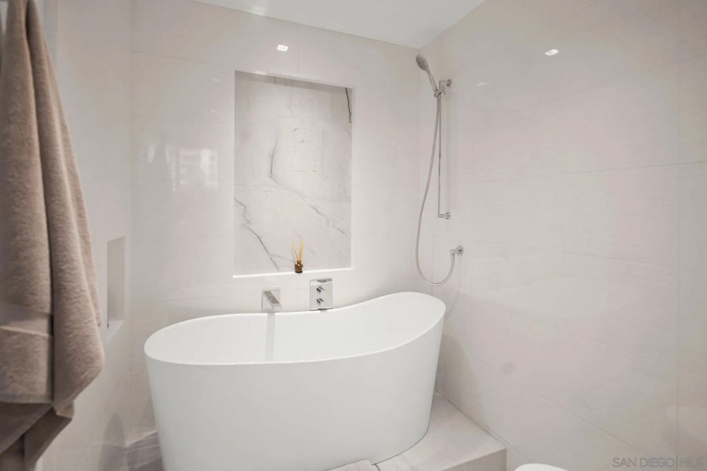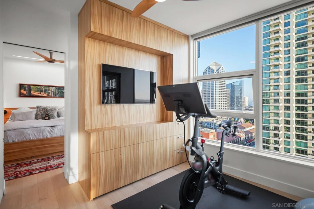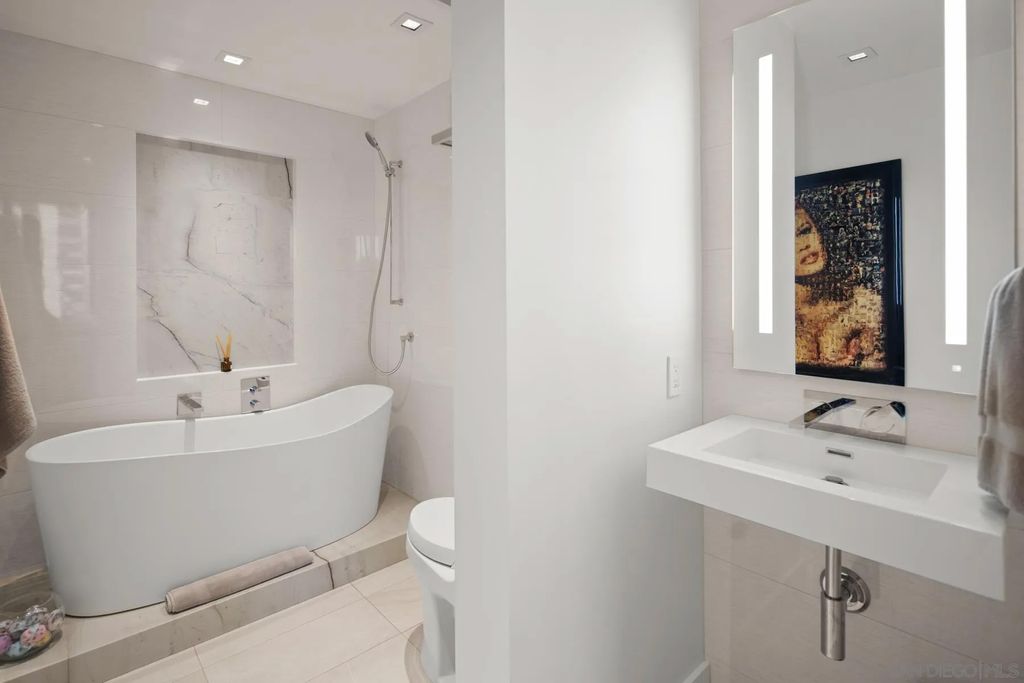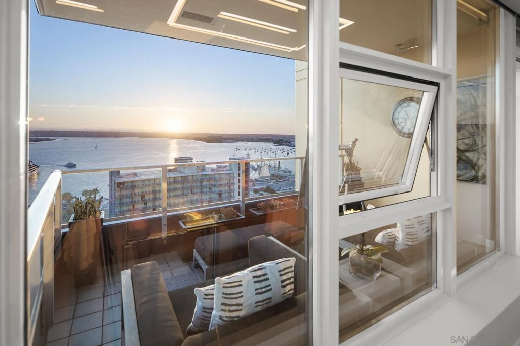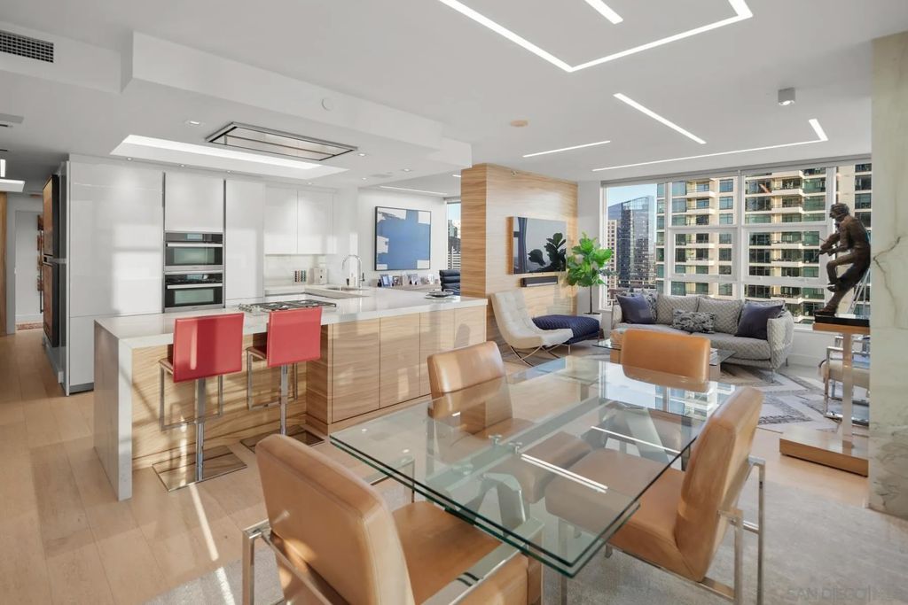 Truly one-of-a-kind, thoroughly upgraded residence in one of San Diego's premier luxury high-rises"”Bayside on Millionaire's Row. No expense was spared in this extraordinary southwest-facing corner unit, offering sweeping views of the bay, city skyline, and unforgettable sunsets over the Pacific. Meticulously maintained by the original owner, this home underwent a complete down-to-the-studs remodel in 2018 with over $500,000 in ultra-premium upgrades, all designed to maximize the views and floorplan and elevate the living experience to an exceptional level. Step inside through a dramatic formal entry featuring coffered ceilings, custom wood storage and closets fabricated from Koa wood imported from Hawaii, designer lighting, and a full-length wine fridge. The open-concept living, dining, and kitchen areas have been thoughtfully reconfigured to maximize natural light and frame the incredible views from every angle. A private balcony extends the living space, perfect for entertaining or simply soaking in the beauty of San Diego's waterfront. Custom ceilings with sleek modern lighting, Duchateau flooring, Koa wood accents throughout, and carefully selected quartzite natural stone finishes provide elegance and cohesion throughout. The chef's kitchen is a showpiece, complete with a coffered ceiling, custom German cabinetry, breakfast seating, Miele appliances, and quartzite natural stone counters. The living and dining rooms feature Koa storage and quartzite natural stone accent walls that highlight the home's artistry. ...See Supplement... Retreat to the serene primary suite with its own private balcony, custom Koa furnishings, and a larger than original walk-in closet with a California Closet system and custom built-ins. The spa-inspired bath offers dual sinks, a walk-in shower, and striking custom stonework. A flexible floor plan includes a home office and guest bedroom with a custom Zoom bed, while the guest bath offers a freestanding soaking tub and designer finishes. Additional highlights include power blinds throughout (blackout in bedrooms), ample storage, and two side-by-side premium parking spaces with a dedicated electric charger for your Tesla or other electric vehicle, conveniently located just outside the elevator with separate storage. Bayside residents enjoy a newly renovated lobby, 24-hour concierge, pool, spa, sauna, steam room, movie theater, conference room, wine lounge with oversized chiller, BBQ areas, library, and more. Perfectly located, you're steps from Little Italy, the Gaslamp, Waterfront Park, Petco Park, the Rady Shell, and San Diego's best dining, shopping, and entertainment. This residence represents the very best in luxury downtown living on the front row to the waterfront.