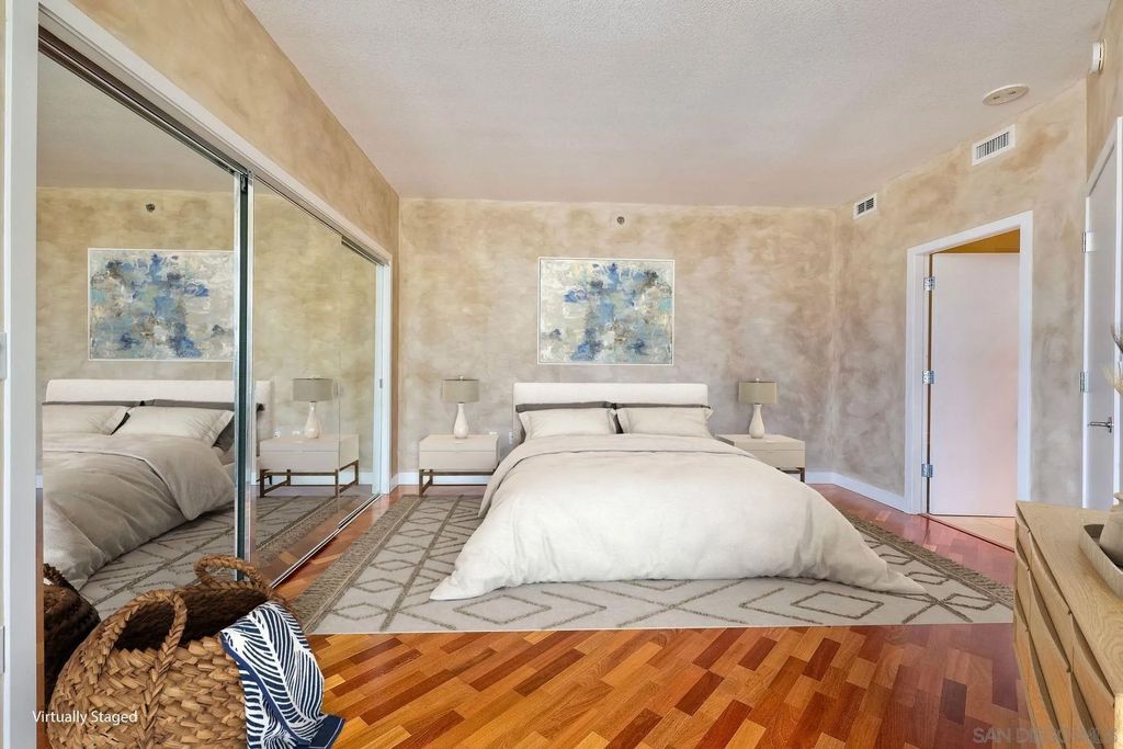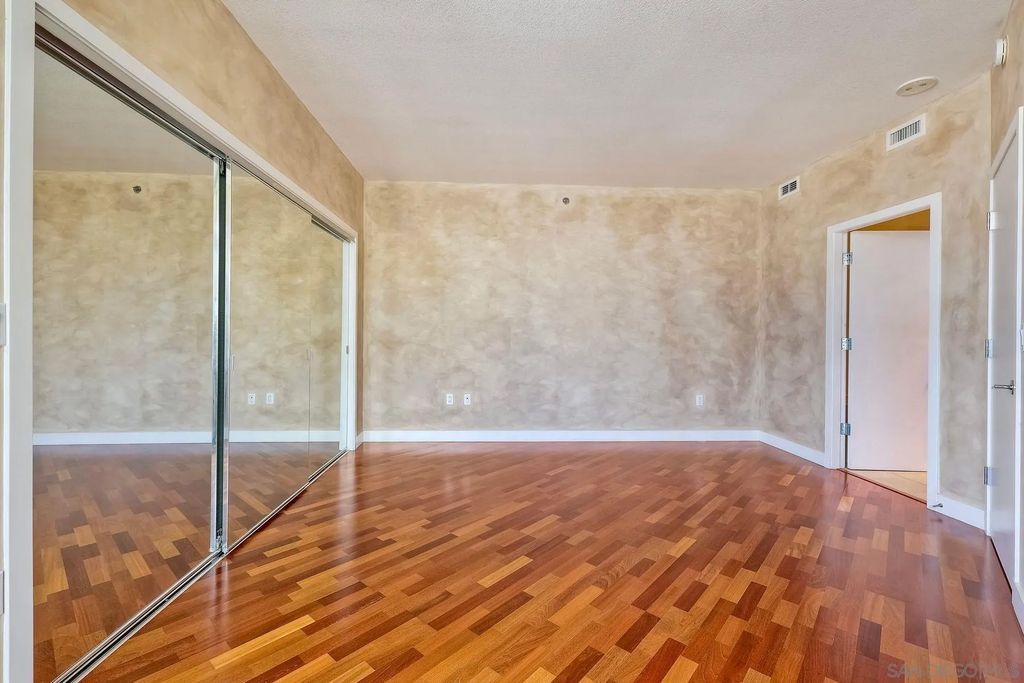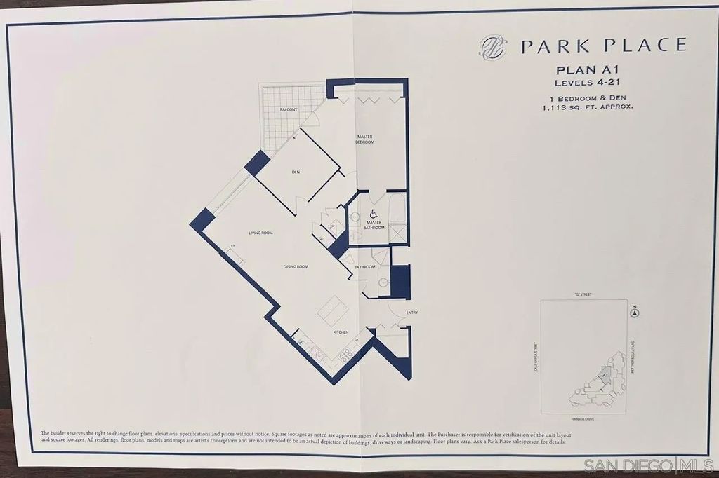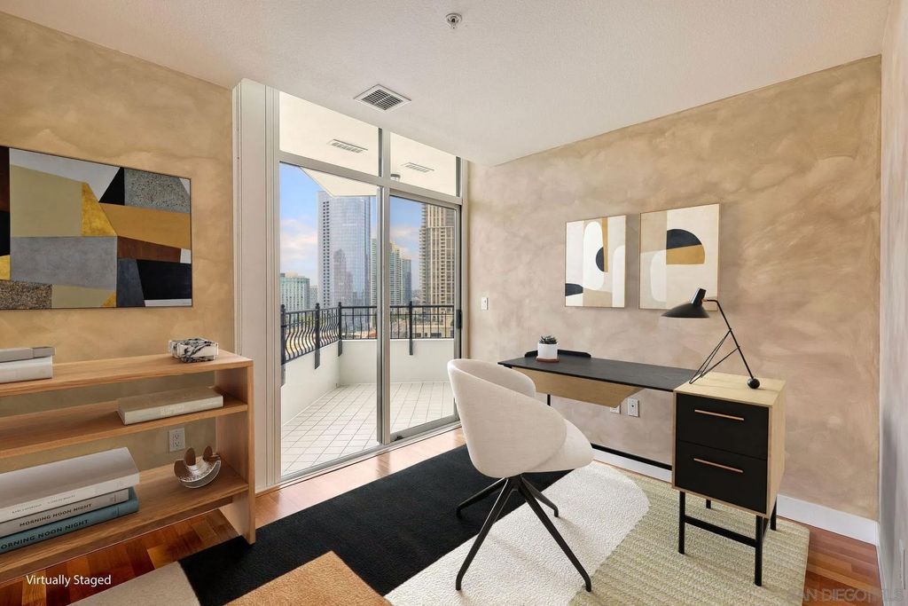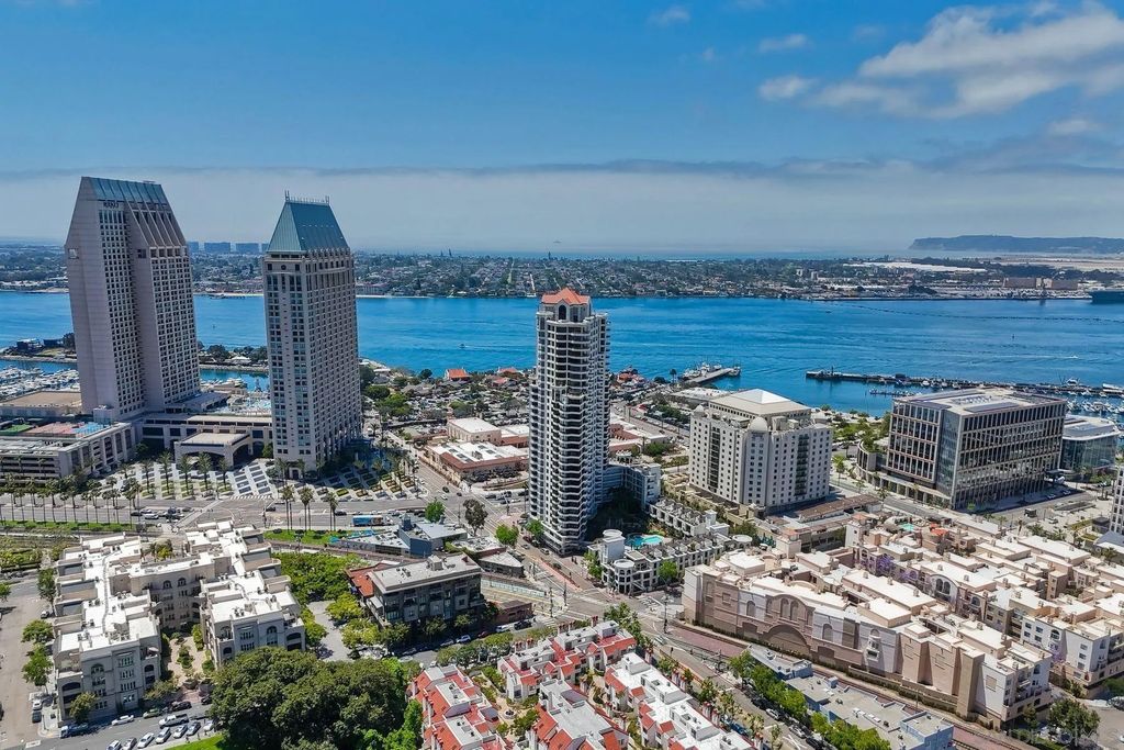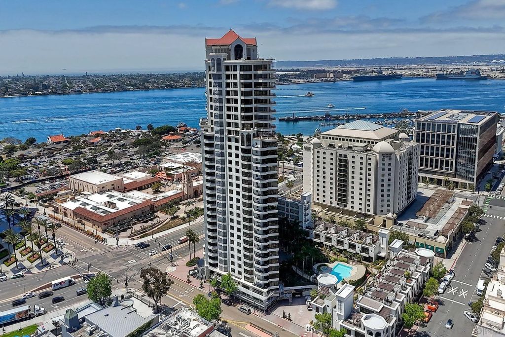 Discover elevated urban living on the 13th floor of Park Place, located in San Diego's prestigious Marina District. This stunning 1-bedroom + den/office (easily used as a second bedroom) comes with HOA credits and sweeping panoramic views of the bay & city skyline. Inside, this home features elegant cherry wood flooring and custom faux-finish walls throughout the main living areas, bedroom, and den"”creating a warm, designer-inspired ambiance. The gourmet kitchen is appointed with stainless steel appliances, a Sub-Zero refrigerator, granite countertops, and a central island with bar seating"”ideal for entertaining. The spacious primary suite boasts triple mirrored closets and a luxurious en-suite bath with a soaking tub and walk-in shower. Step onto your private balcony"”accessible from both the primary bedroom and the den"”to take in breathtaking views morning and night. A second full bathroom provides added flexibility, especially if the den is converted into a guest room or second bedroom. Additional features include two tandem parking spaces, a private storage unit, and access to world-class amenities: a striking lobby, 24-hour concierge, gated security, pool, spa, fitness center, resident lounge, and guest parking. Enjoy resort-style living just steps from Seaport Village, the Convention Center, Petco Park, and Downtown's vibrant dining and nightlife.