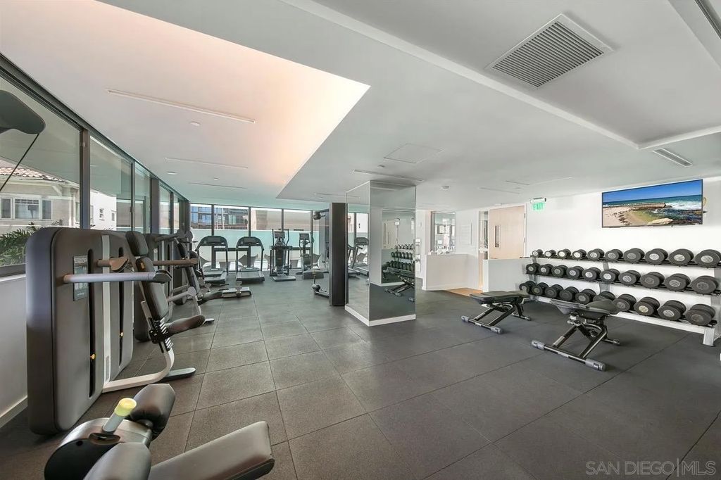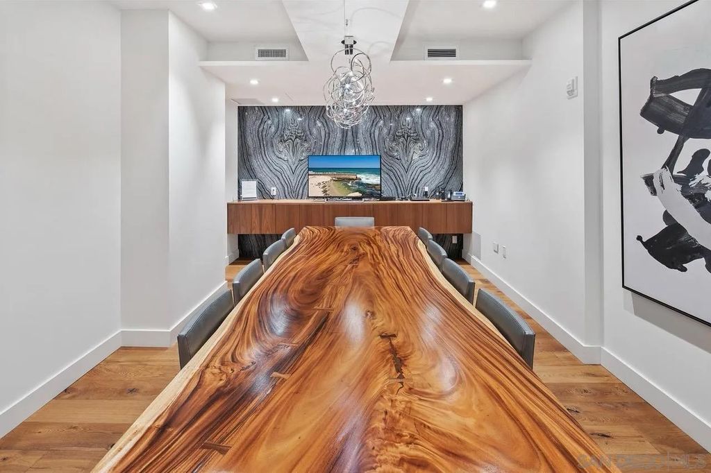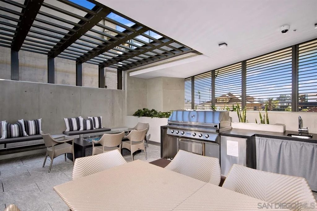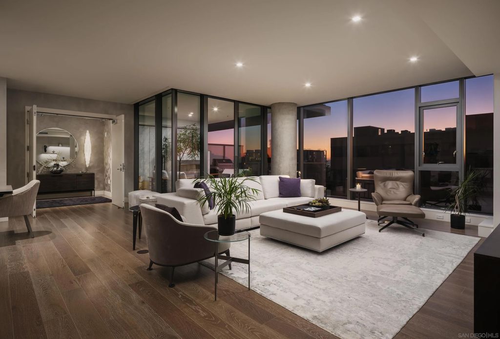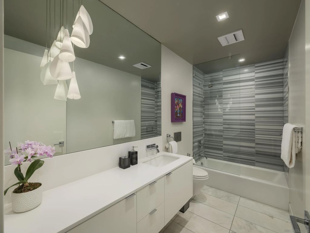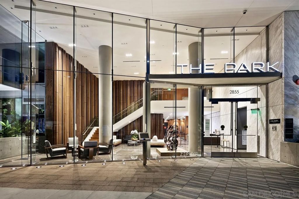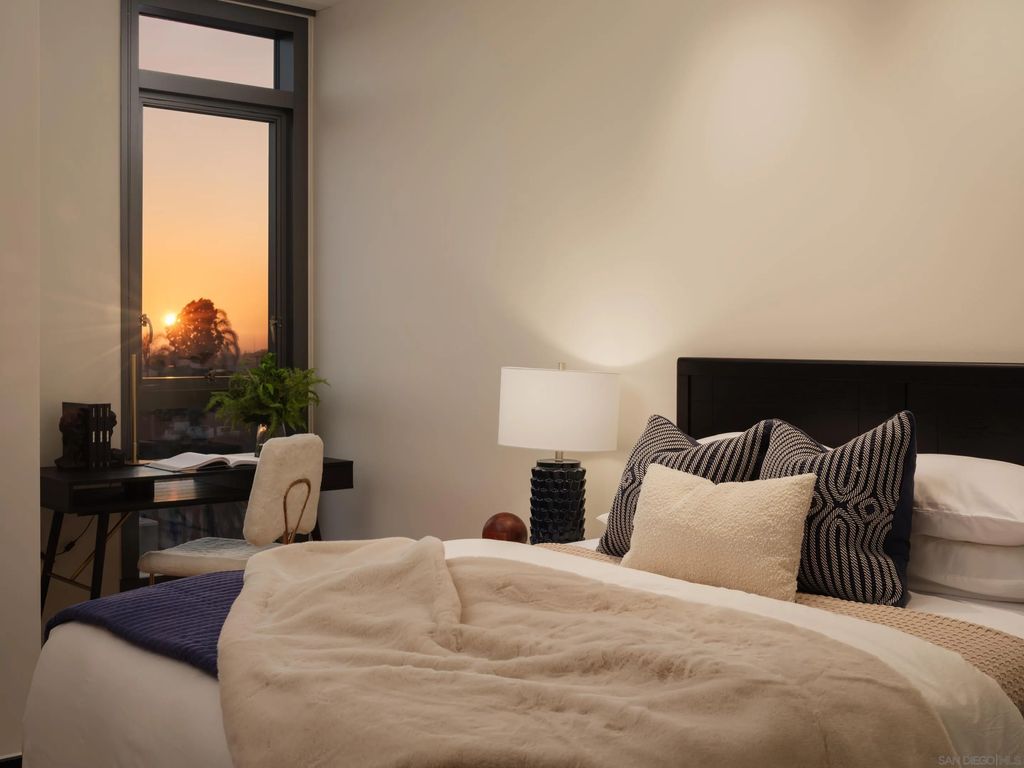 In the heart of one of San Diego's most prestigious neighborhoods, this designer residence at The Park Bankers Hill embodies the pinnacle of contemporary luxury, with interiors curated to perfection and an atmosphere of timeless sophistication. Upon arrival through your dedicated direct-access elevator, this 1,875-square-foot home reveals a world of meticulous craftsmanship and design. Floor-to-ceiling glass walls flood the interiors with natural light and frame the surrounding cityscape, while two private terraces totaling more than 320 square feet create an effortless connection to the outdoors. Every element of the residence has been thoughtfully elevated by JB Noble Interiors, one of Southern Californias most celebrated luxury design firms, whose vision infuses the home with understated glamour. Venetian plaster walls, Phillip Jeffries designer wallpaper, and sculptural selenite sconces set a refined tone, while a statement Bocci 18 chandelier crowns the dining space with luminous artistry. Lutron electric shades and custom built-ins complement the interiors, blending beauty and function in equal measure. At the heart of the home, the chef's kitchen is both dramatic and functional, showcasing Italian Boffi cabinetry, a striking Caesarstone waterfall-edge island, and top-tier Miele appliances. The open-concept living and dining spaces unfold across DuChâteau hardwood floors, soaring ceilings, and seamless transitions to a private terrace adorned with a Valakas marble encased fireplace, designed to transform the surrounding views into living art. The primary suite is a sanctuary of serenity, featuring a custom California Closets wardrobe and expansive closet, spa-inspired marble slab-encased ensuite with dual vanities, and blackout electric shades that ensure restful tranquility. The secondary bedroom mirrors the same elevated finishes, perfectly suited for guests or a private office. As a resident of The Park, you'll enjoy an unparalleled suite of world-class amenities: a resort-style pool and spa, expansive fitness center and yoga studio, club room, wine room, dog wash room, billiards and poker lounge, and a private outdoor owner's terrace with fire pits and BBQs. Homeowners are granted exclusive access to two fully furnished guest suites five nights a month, completely included for a nominal $275 cleaning fee. Additional upgrades include two side-by-side parking spaces with EV charging and a large storage unit. Perfectly situated in the heart of historic Bankers Hill, this residence places you moments from Downtown's vibrant energy and San Diego's finest dining, while Balboa Park's world-class museums, botanical gardens, and scenic trails lie just steps away. More than a home, this residence offers a rare opportunity to experience a lifestyle where luxury, design, and location converge in perfect harmony.