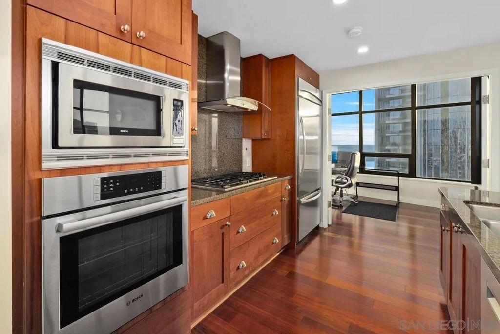 Behold a one of a kind exclusive retreat, perched majestically on the 35th floor of the iconic Electra, high above San Diego's vibrant heartbeat. This coveted northwest-corner residence unveils a sweeping panorama of the bay and city skyline, as though the horizon itself were framed just for you. Step inside"”and be captivated by lustrous Cherry hardwood floors that flow beneath expansive windows, flooding every room with radiant daylight. A cozy fireplace infuses the space with soft warmth and an intimate ambiance. Two balconies beckon"”the western terrace your private stage for nightly sunset dance over the bay. Culinary artistry awaits in your gourmet kitchen, outfitted with stainless-steel Bosch and Thermador appliances, polished granite counters, and a chic breakfast bar perfect for casual gatherings. Outside your front door, the excitement of downtown life is yours to embrace"”just a short stroll to Waterfront Park, Seaport Village, and the eclectic energy of Little Italy. Here, luxury is not an afterthought"”it is a way of life. A dedicated concierge attends to your needs, serene steam room, resort-style pool and spa, and fully equipped fitness center await your indulgence. On the tranquil 5th floor, Electra Park and BBQ terraces offer serene garden escapes amidst the urban hum with two parking spaces flanking a built-in EV charging station and a private storage. Ascend to new heights"”experience life among the clouds in a residence that effortlessly elevates luxury and lifestyle into one sublime experience. Must see!