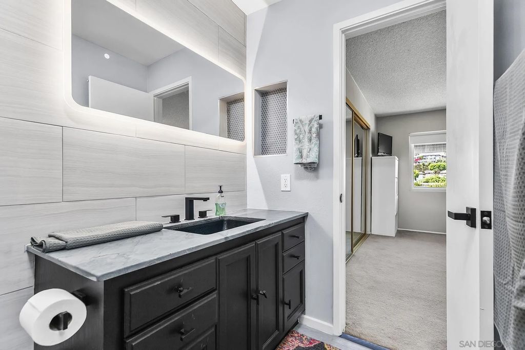 Welcome to Bay Park! Perched in one of the neighborhood's best locations, this home offers sweeping Views and stunning sunsets. A designer renovation features an open-concept floor plan that seamlessly connects the oversized living room, dining, and kitchen. Highlights include: New upper cabinets with open shelving natural quartzite countertops, Induction cooktop/range, striking 32-inch hammered stainless steel sink. Freestanding peninsula island "” perfect for casual dining and entertaining Additional upgrades include fresh paint, luxury vinyl tile flooring, a custom-built fireplace, and a spa-like bathroom with a beautifully tiled walk-in shower. With 864 sq. ft. plus an enclosed patio (total approx. 924 sq. ft.), this home blends style, comfort, and convenience. Just minutes from Mission Bay, local restaurants, shopping, the I-5 freeway, and the San Diego Trolley line with direct service to UCSD and downtown. Fresh, Modern & Ready for You in Bay Park! Move right in and enjoy a bright open floor plan, quartzite counters, induction cooktop, and beautifully tiled walk-in shower. Close to shopping, and coastal adventures. With 864 sq. ft. plus an enclosed patio (total approx. 924 sq. ft.), this home blends style, comfort, and convenience. Enjoy Bay views and night lights from your extended enclosed patio and bedroom. You will love the comfort of this home.
