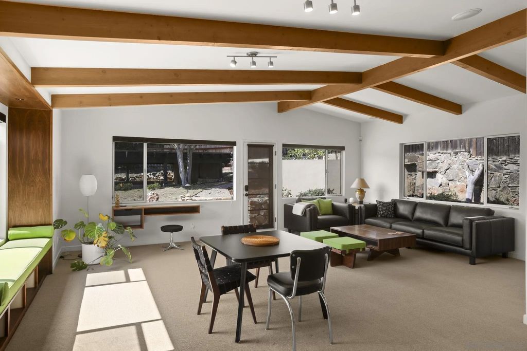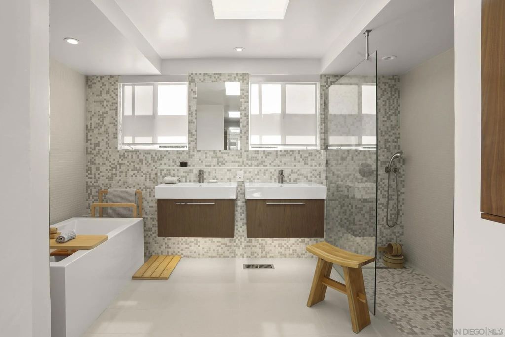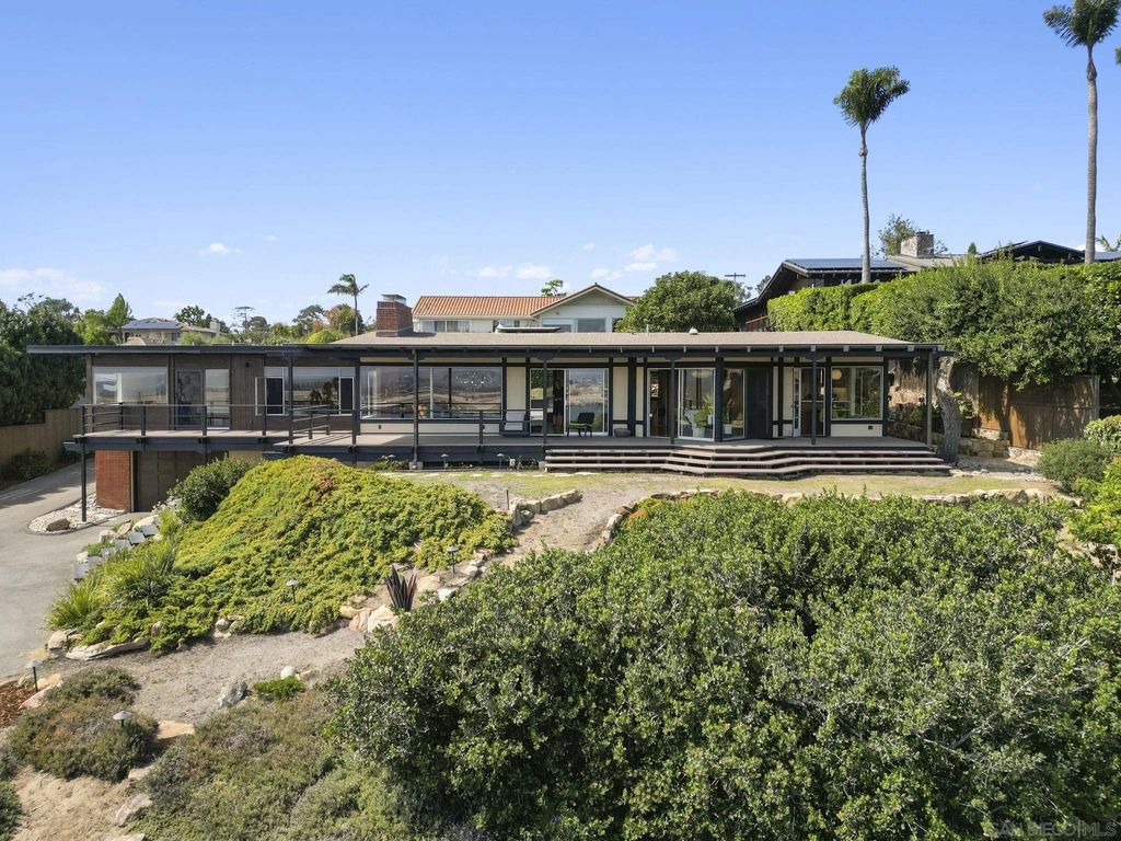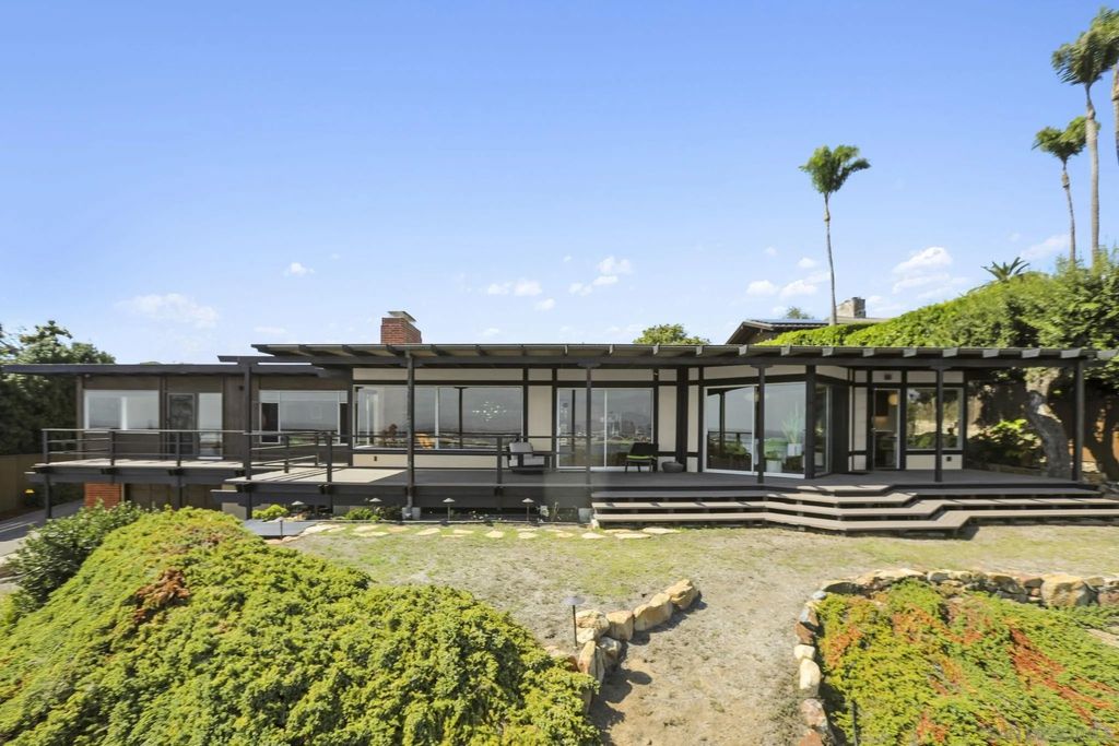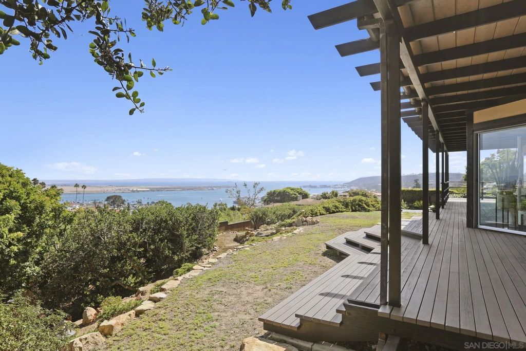 Exquisite mid-century modern home with hypnotic views across the bay and Pacific to Downtown, Coronado and the Channel Islands, is a masterwork of timeless style married with contemporary living. Gracefully sited at the pinnacle of a premier Point Loma cul-de-sac, the home sublimely integrates with its natural surroundings and maximizes the beauty and movement of the extraordinary views. Expansive windows and sliding glass doors, a blend of textures and shape, and perfected elements of Japanese and zen design inform the home's authentic reimagining. Interior spaces maximize natural light and encourage both socialization and quiet respite. Exterior decks offer both extended entertaining space or privacy. This meticulous and thoughtfully-created home is a testament to the highest standard of mid-century modern design.
