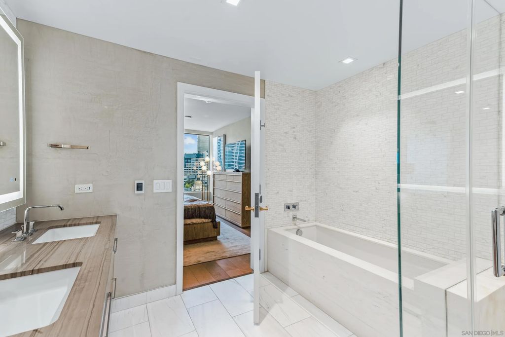 Experience the ultimate in luxury high-rise living at Pacific Gate, San Diego's iconic waterfront address. Residence 1106 is a stunning 2-bedroom, 2-bath home spanning 1,390 sq. ft., offering an elegant blend of modern design and urban comfort. Expansive glass walls fill the home with natural light, showcasing dynamic city views framed by the downtown skyline. The open-concept living space features sophisticated upgrades like new wall coverings, fresh paint, and stylish lighting enhancements for added comfort and style. A split-bedroom layout ensures privacy and flexibility, while the private covered terrace extends your living area outdoors. The generous primary suite offers an elegant walk-in closet by California Closet Systems and a spa-inspired bath with heated floors, a walk-in shower, a soaking tub, and an anti-fog electric mirror with an integrated 10" TV screen. Automated blinds and a Smart Home system with climate control add convenience throughout the residence. The second bedroom offers flexibility as a home office or guest retreat. Residents enjoy unparalleled resort-style amenities including a private yacht share, luxury car fleet, chef concierge, guest suite, state-of-the-art fitness center with sauna and steam room, residents' lounge, and an on-site restaurant led by a celebrity chef. Ideally located just steps from the bay, this residence is moments from Seaport Village, the Rady Shell, the new RaDD development, and San Diego's finest dining, shopping, and entertainment. The first all-glass Super Prime residential tower in San Diego offers an unprecedented waterfront lifestyle with sky-high amenities and picture-postcard views. Directly overlooking the waterfront, the 41-story tower contains an exclusive offering of homes designed by Hirsch Bedner Associates. Renowned New York-based architectural firm Kohn Pedersen Fox (KPF) created a landmark that reimaged the San Diego skyline. The custom-engineered glass walls dynamically reflect the hues of the sky and the Pacific Ocean. Pacific Gate has evolved the San Diego skyline and represents the future of the city. The building is comprised of two-nested curved glass towers that rise as a single column from a three-story ground floor retail podium on the north and west sides of the tower. Because of the building's curves and exterior glass, Pacific Gate offers a striking viewing experience from every vantage point. Residents arrive home to a beautifully landscaped motor court with a private luxury car fleet, which leads to a double-height lobby with a 24-hour concierge and porter services. Two levels of amenities boast a residents lounge ideal for events and everyday use, the fitness center contains an extensive range of state-of-the-art equipment. Adjacent to the fitness center is the steam and sauna retreats that open up to the fourth-floor pool terrace fitted with poolside cabanas and glass surround.