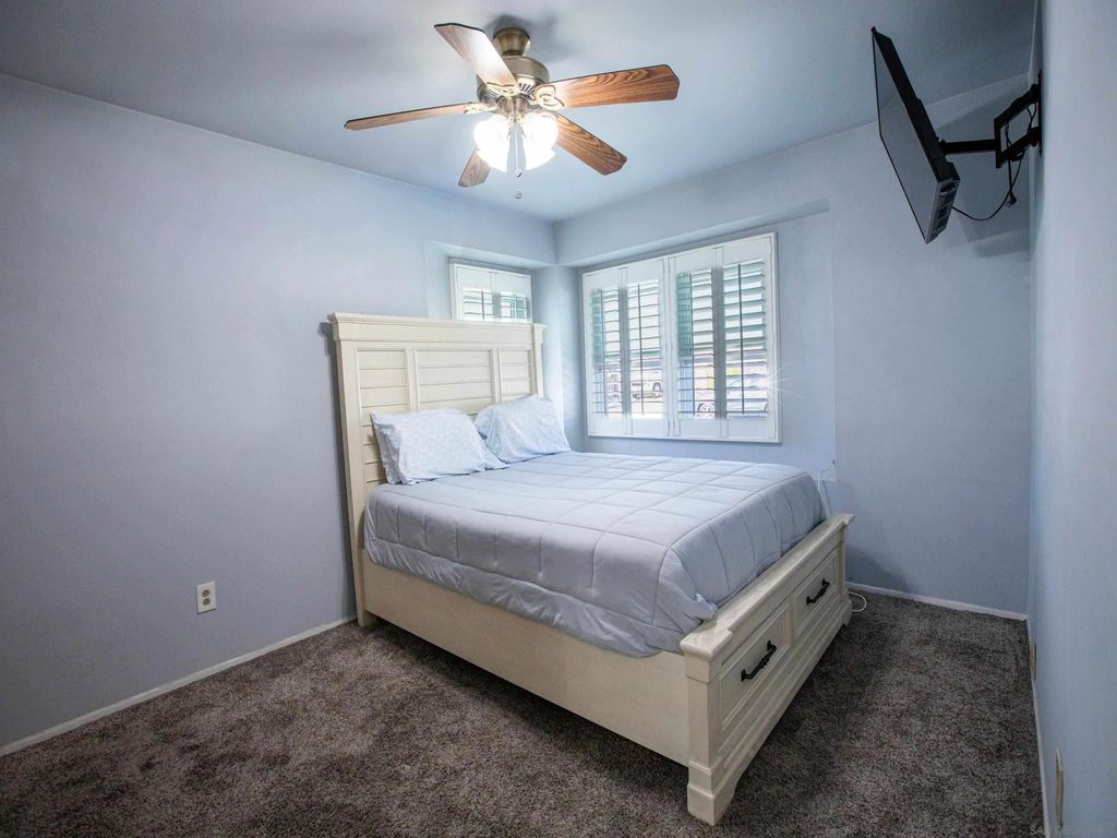 Timeless charm meets everyday comfort. Natural light fills the rooms, highlighting the blend of soft beige tones and rich wood finishes. The inviting living area connects to a dining space with views of the backyard through wood-framed sliders. The kitchen features granite counters, classic cabinetry, and a gas range for home-cooked favorites. Sunny bedrooms include ceiling fans and window shutters for year-round comfort, while a large (approx. 300 SF) bonus room offers flexibility for a den, studio, or guest bedroom. Outside, enjoy a generous and private backyard with a covered patio"”ideal for relaxing or entertaining. Solar panels provide energy efficiency and long-term savings, completing this well-cared-for home. Newer roof, newer AC condenser, updated plumbing, newer dishwasher, newer garage door. Wide driveway with 5 to 6 spaces - plenty of room for an RV. Great location, close to trolley, shopping, schools and freeways. Sheds convey. Newer roof, newer AC, updated plumbing, newer dishwasher, newer garage door. Wide driveway with 5 to 6 spaces - plenty of room for an RV. Great location, close to trolley, shopping, schools and freeways. Sheds convey.