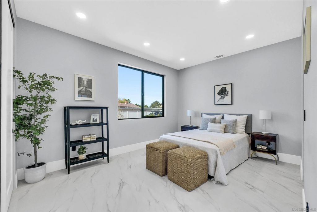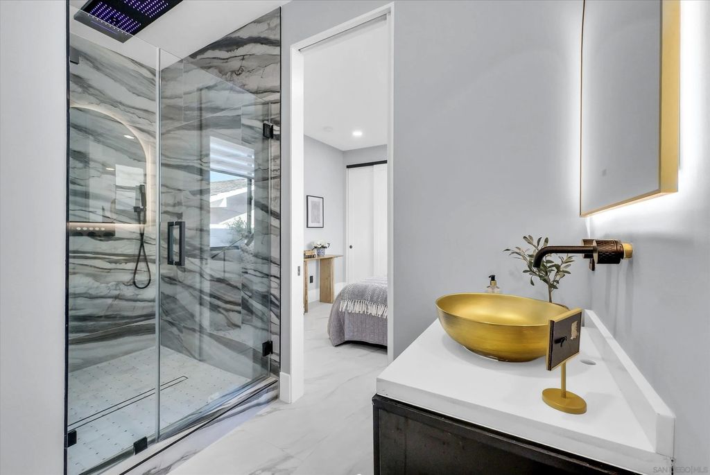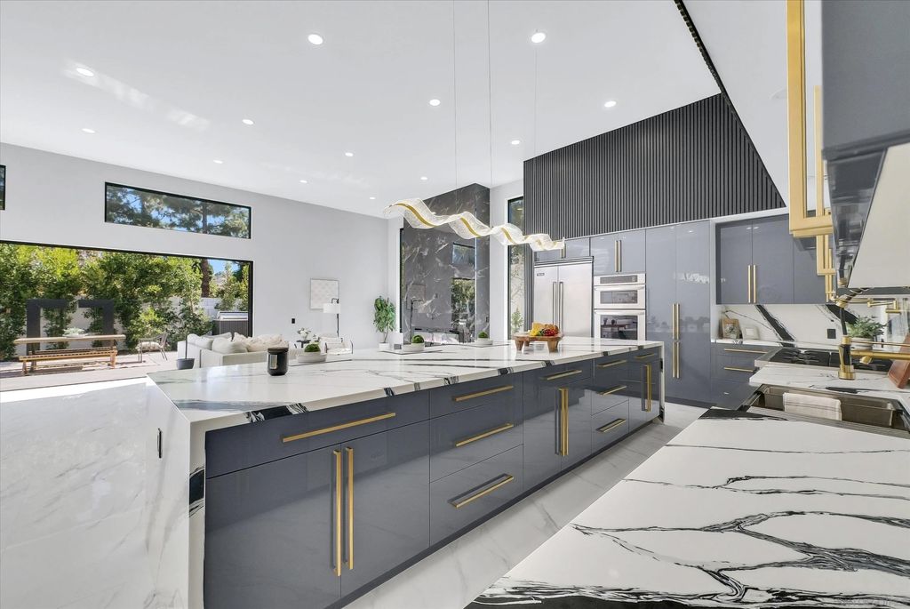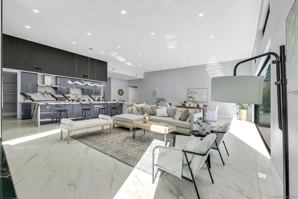 A stunning architectural masterpiece blending modern design with luxury comfort. This fully renovated single-story home showcases soaring ceilings, sleek porcelain floors, and an open-concept great room that flows seamlessly to an entertainer's patio through massive glass doors. The gourmet kitchen features custom cabinetry, waterfall marble counters, and designer lighting. The primary suite offers a spa-inspired bath with freestanding tub, rainfall shower, and LED backlit mirrors, plus a custom-built walk-in closet. Every detail"”from the linear LED fixtures to gold-accented hardware"”reflects sophisticated craftsmanship. Low-maintenance landscaping, sleek curb appeal, and a modern glass garage door complete this exceptional residence"”perfectly designed for today's lifestyle.