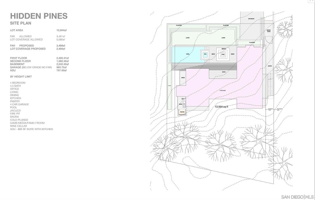 Welcome to Hidden Pines, a serene and tucked-away lot in one of Del Mar's most coveted neighborhoods. This rare offering blends seclusion and privacy with easy access to everything that makes Del Mar and North County San Diego so desirable. The Property Set on a 13,964 sq. ft. parcel and zoned R1-10, Hidden Pines presents an exceptional opportunity to design your dream coastal retreat. Conceptual renderings (not yet approved) envision a 3,488 sq. ft. custom residence with three bedrooms and three and a half baths, spacious living and dining areas, a gourmet kitchen with pantry/cellar, and a seamless flow to outdoor spaces designed for entertaining. Additional features include a below-grade 994 sq. ft. four-car garage and a 797 sq. ft. ADU suite with a full kitchen "” ideal for guests, extended family, or a private office. Planned resort-style amenities include a pool, jacuzzi, fire pit, sauna, and cold plunge, creating a true wellness retreat at home. Seller Credit To bring your vision closer to reality, the seller is offering a construction credit of $800 per square foot for all built space "” including the main home, garage, and ADU. With a total of 5,279 sq. ft. proposed, this equates to a credit of approximately $4.2 million. This extraordinary contribution allows you to focus on creating the finishes, details, and personal touches that will make this home distinctly yours. The Lifestyle Perched to capture sweeping Pacific Ocean views, Hidden Pines offers the perfect canvas to embrace Del Mar's coastal lifestyle. Step outside your door and onto the...See supplement The Lifestyle Perched to capture sweeping Pacific Ocean views, Hidden Pines offers the perfect canvas to embrace Del Mar's coastal lifestyle. Step outside your door and onto the trails of the Torrey Pines Reserve Extension. Within minutes, stroll the world-famous beaches of Del Mar, explore the dramatic beauty of Torrey Pines State Reserve, or experience the excitement of the iconic Del Mar Racetrack. Quick access to I-5 and the Solana Beach Train Station ensures effortless commuting or weekend escapes to San Diego, Orange County, or Los Angeles. Your Opportunity This is a rare chance to secure a piece of Del Mar's coastal charm "” an inspiring canvas for the home you've always imagined, supported by an unparalleled construction credit to make it possible.