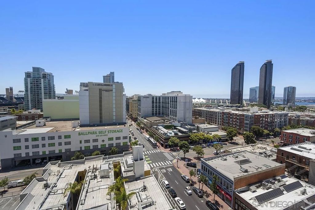 Welcome to your perfect perch in the sky! This highly sought-after southwest corner residence at Alta delivers awesome panoramic views of the San Diego Bay, Point Loma, and the glittering Downtown skyline. With freshly refinished wood floors, the open floor plan is framed by expansive windows offering natural light, a sleek kitchen with stainless appliances, modern cabinetry with frosted glass accents plus a one-of-a kind custom built-in buffet featuring cabinets, drawers; all with quartz counters. Both bedrooms include beautiful views, ceiling fans, and organized closets with frosted glass doors. The bathrooms feature marble countertops and slate tile flooring for a clean, modern finish. Additional features include an in-unit washer/dryer, powder room, storage cage, and a secured parking space, everything you need for effortless urban living. Alta is a building as unique as you are with distinctive architecture by Perkins and Company. Perfect for the active Downtown dweller, residents can take advantage of a 50' indoor/outdoor pool, spa, large fitness center, and a luxe communal club room with home theater and pool table. Additionally, Alta prides itself on featuring energy efficient appliances and mechanical systems for lower utility costs. Top-notch amenities, fabulous design, and professional, on-site community management combine for one of the best HOA values in all of Downtown San Diego! Situated in East Village on the edge of the city's historic Gaslamp Quarter, enjoy a premium location only steps away from Petco Park and convenient access to endless shopping, dining options, and night life.