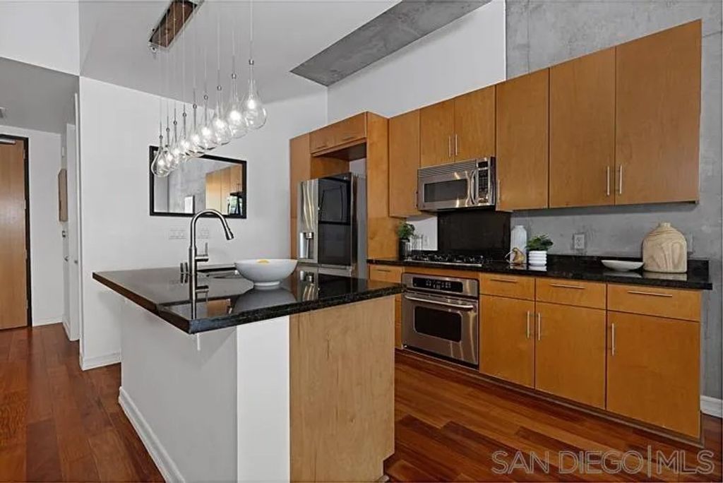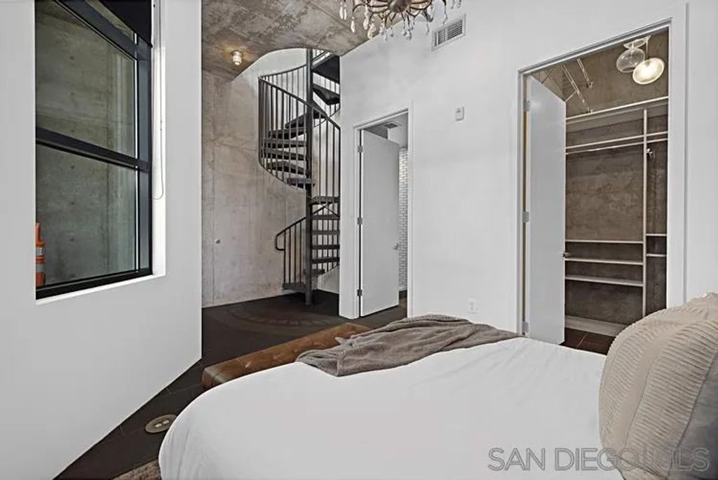 Rare Two Story Walk-Up Unit in the Highly Desirable M2i Building. This modern, reverse floor plan offers a unique living experience with high-end finishes throughout. The spacious primary bedroom features an oversized, fully custom walk-in shower, California Closets build-outs, and wide-plank tile flooring. A stunning spiral staircase leads to the second floor, where 12-foot ceilings and an open concept layout create an inviting atmosphere. Floor to ceiling windows provide abundant natural light, highlighting custom built-in shelving and exposed concrete accents. The kitchen is equipped with a premium LG fridge, complete with a custom ice maker, gas stainless steel cooking and modern fixtures. The private balcony offers city views and overlooks Jacaranda trees. One of the standout features of this unit is the direct access from the downstairs bedroom to the heart of East Village. Step outside your door and immerse yourself in one of San Diego's most vibrant and desirable neighborhoods, just steps away from trendy restaurants, shops, and the lively energy of the area. The building also boasts a rooftop deck with built-in grills and a fireplace, a newly remodeled fitness center, and a lush interior courtyard. With Petco Park, Michelin-starred restaurant Callie, and the Gaslamp Quarter just blocks away, this unit offers an exceptional blend of modern luxury and unbeatable location.