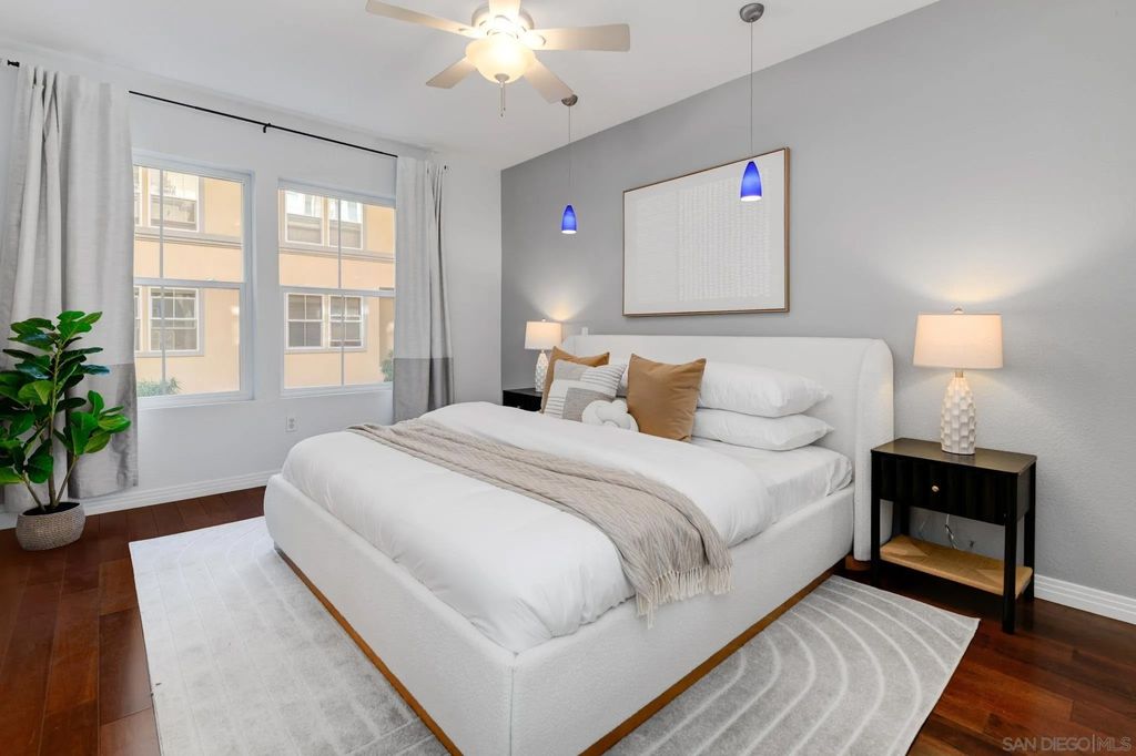 Experience the Best of Indoor-Outdoor Living in the Heart of the Marina District! This impeccably maintained 2-bedroom, 2.5-bathroom townhome at City Walk offers the perfect blend of style, privacy, and convenience. Captivating with its Mediterranean-inspired architecture and two expansive private patios, this rare residence is one of only 12 unique internal townhome-style units in the community. The main level features an open-concept living and dining area that flows seamlessly to both patios, perfect for embracing San Diego's indoor-outdoor lifestyle. Enjoy solid wood and porcelain tile flooring, in-unit laundry, and generous under-stair storage. The kitchen includes a gas cooktop and an oversized dining bar that opens to the living area, with access to an enclosed private terrace. Upstairs, both bedrooms are thoughtfully designed for comfort and both feature en-suite bathrooms. The spacious primary suite includes a walk-in closet with custom built-ins from The Container Store. This home is set within the beautifully landscaped City Walk, a community offering tranquil courtyards with fountains and waterfalls, fire pits, lounge areas, a fitness center, and reservable spaces with kitchens for private gatherings and all with low HOA dues. Located just steps from Pantoja Park, Seaport Village, Little Italy, Gaslamp Quarter, The SHELL, Petco Park, and trolley stations, this home offers walkable access to everything Downtown San Diego has to offer-while still providing a peaceful, residential atmosphere.
