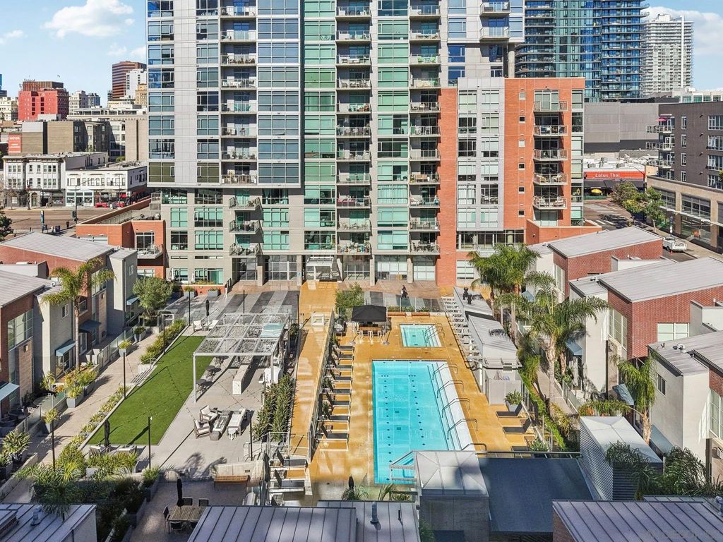 Experience elevated urban living in this beautifully updated residence at The Mark, one of East Village's premier luxury towers. Ideally located just steps from Petco Park yet positioned away from noise and traffic, this home offers the perfect balance of excitement and comfort. The Gaslamp Quarter, Little Italy, and San Diego's waterfront are all just moments away, placing the best of downtown at your doorstep. Inside, the open floor plan showcases sweeping city views. The spacious living area includes a built-in media console and a flexible dining space that can also serve as a workspace"”perfect for taking in the skyline while you dine or work. A covered balcony extends the living area outdoors with expansive city and peek-a-boo bay views. The generous bedroom offers room for a desk and features a walk-in closet with a custom California Closet system. The oversized spa-like bathroom is accessible from both the bedroom and living area. The open kitchen is ideal for entertaining, complete with stone countertops, Studio Becker soft-close cabinetry, stainless steel appliances, breakfast seating, and abundant storage. Notable upgrades include an HVAC system with UV filtration, Ecobee thermostat, newer countertops, newer refrigerator, and full-size LG front-loading washer and dryer. The Mark offers exceptional amenities - concierge, newly updated saltwater pool/spa, upgraded courtyard with pizza oven, BBQs, lounge areas, state-of-the-art fitness center, and conference room. VA approved, this home offers resort-style living in the heart of Downtown San Diego.