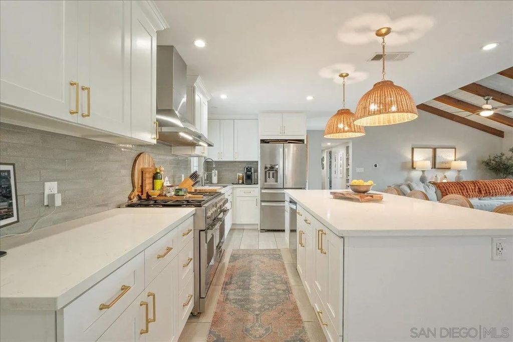 Welcome to this beautifully updated single-level 1960s home nestled in the highly desirable Del Cerro neighborhood of San Diego. Blending timeless character with modern luxury, this residence offers comfort, style, and exceptional functionality. The heart of the home is a fully remodeled chef's kitchen featuring a 6-burner Fulgor Italian gas range, double ovens, quartz countertops, and custom cabinetry. Two tastefully remodeled bathrooms, vaulted ceilings, elegant crown molding, and two fireplaces add warmth and architectural interest throughout. Original hardwood floors bring classic charm, while vinyl windows provide energy efficiency and abundant natural light. Thoughtfully designed custom closets enhance storage, and a versatile bonus room offers the perfect space for a home gym, hobby studio, or children's playroom. Outside, enjoy low-maintenance living with custom pavers and turf, ideal for relaxing or hosting guests. The pergola-covered patio creates an inviting outdoor retreat for dining, lounging, or entertaining year-round.