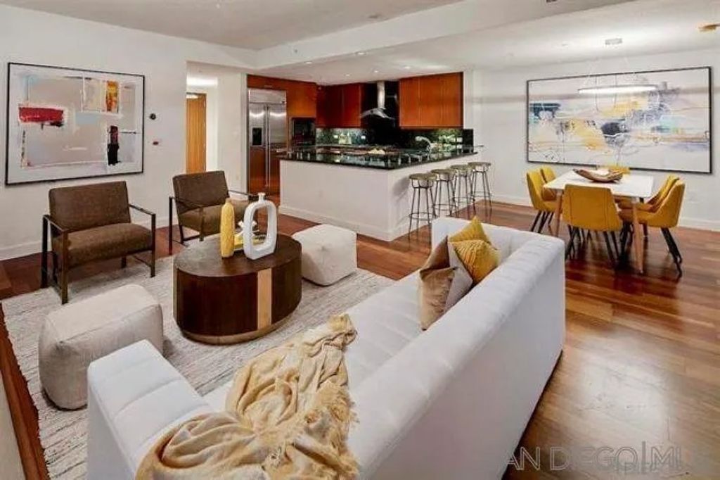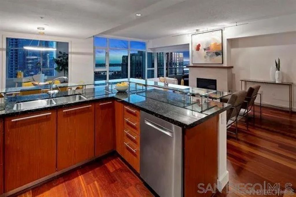 Elegant ocean and bay view residence in Grande South featuring the most desirable floorplan with two bedrooms plus a bonus room. Situated on the 18th floor, the home offers unobstructed southwest-facing views of San Diego Bay, the Pacific Ocean, and the city skyline. Refined interiors include a spacious primary suite, hardwood floors throughout, a cozy fireplace, Nest thermostats, battery-operated window shades, and a gourmet kitchen with a new GE Monogram refrigerator. The expansive balcony extends the living space and provides the perfect setting to enjoy panoramic views and sunsets. Grande South amenities include 24-hour concierge service, meeting room, party room and lounge with full kitchen and fireplace, visitor's suite for guests, landscaped gardens, private tree-lined courtyards, individual storage lockers, bicycle storage, an 80-foot outdoor swimming pool, whirlpool spa, sauna and steam rooms, changing rooms with lockers, and a fully equipped exercise room.