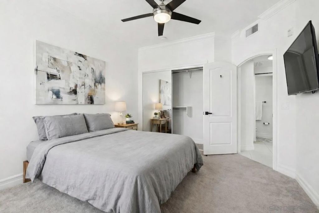 Located in the heart of desirable East Village, WALKING DISTANCE to everything: Little Italy, Balboa & Petco Park, the train, trolley, bay, and airport. Just steps from everything DOWNTOWN San Diego has to offer, including acclaimed RESTAURANTS, NIGHTLIFE, bars, breweries, and boutique shopping. VA APPROVED! Spacious, two bedrooms, two bathrooms, two parking spaces, two storage spaces, balcony and PRIVATE ROOFTOP DECK!!! Perfect for pet owners! This bright and immaculate top 6th floor condo offers floor-to-ceiling windows and exceptional natural light throughout. Rarely found downtown, the home features two private outdoor spaces, including a balcony off the living room and a spiral staircase leading to a private rooftop deck"”an incredibly rare offering for downtown living. The residence is pristine and modern, showcasing custom cabinetry, stainless steel appliances, and sleek quartz countertops. Additional highlights include TWO FULL PARKING SPACES (not tandem) and TWO SPACIOUS STORAGE UNITS, providing convenience that's hard to find in an urban setting.