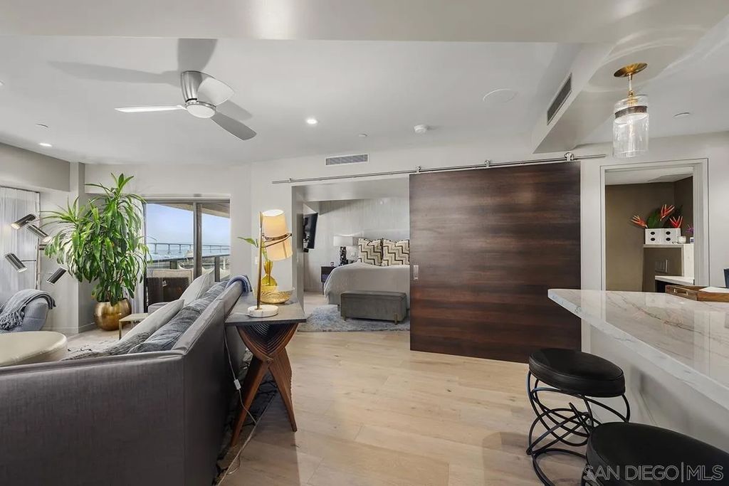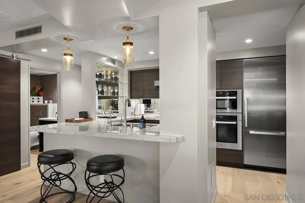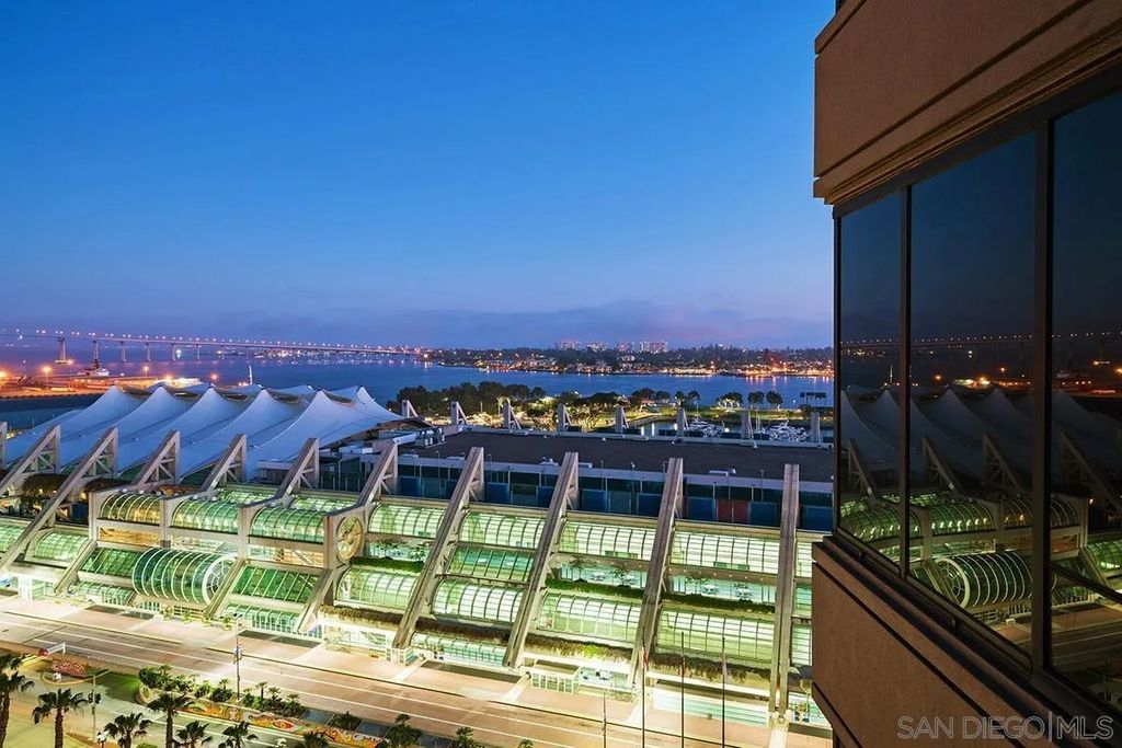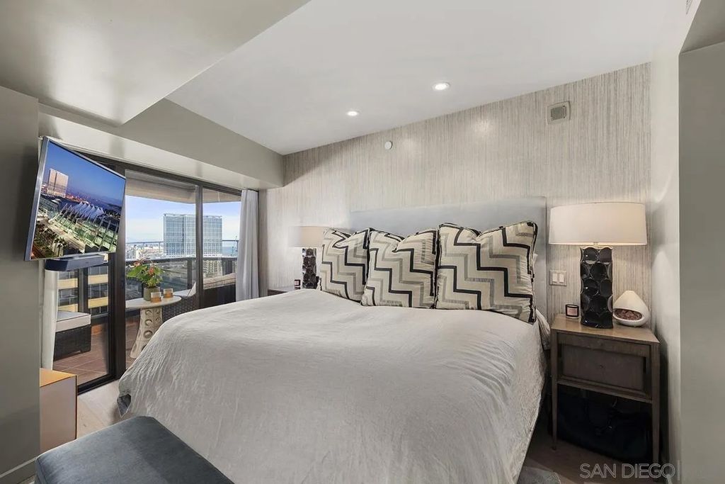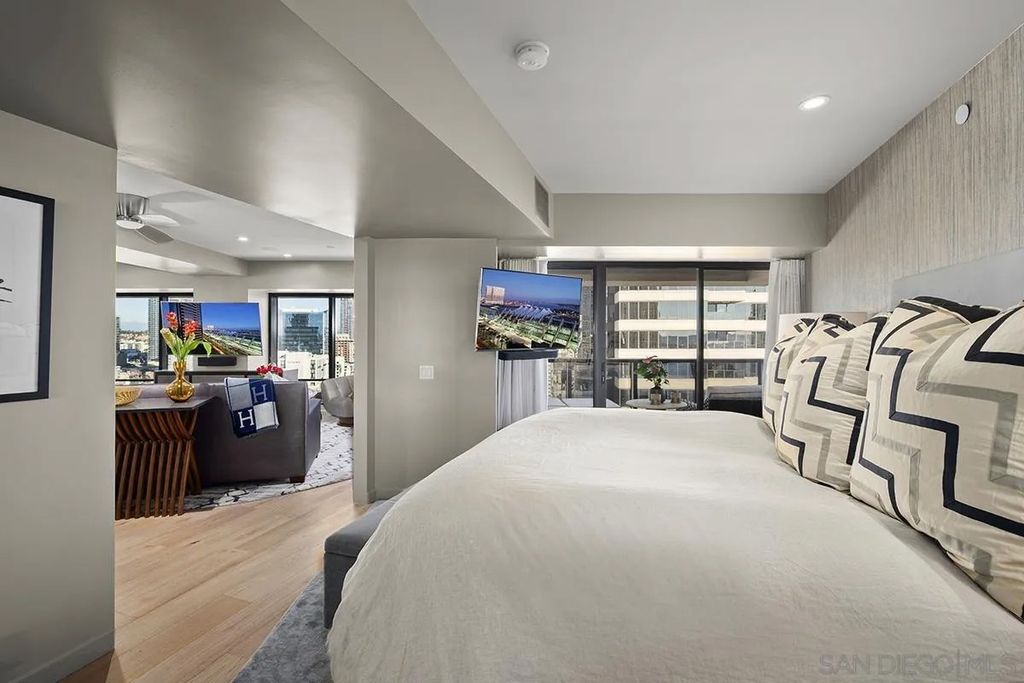 This is the finest 1-bedroom "re-imagined" condo ever seen in the Harbor Club; fully remodeled practically down to the studs! This beautifully curated residence offers a rare blend of luxury, privacy, and prime Marina District living plus one of the few with 1.5 bathrooms to boot. Positioned high enough to rise above neighboring buildings, the home captures sweeping views of the San Diego Bay and the iconic Coronado Bridge through walls of windows flooding the residence with natural light. The professionally decorated interior shows a sleek, modern kitchen appointed with high-end appliances, European-style cabinetry, mirrored backsplash, slab porcelain island, beverage chiller, and an eat-at bar accented by elegant drop lighting making it perfect for both everyday living and entertaining. The primary suite is a serene retreat featuring balcony access, a custom wall treatment, a new built-in closet, and a spa-inspired ensuite bathroom with dual vanity and a step-in rain shower with an additional handheld shower head. Rare for a one-bedroom residence, this home also offers a separate powder room, adding both convenience and sophistication for guests. Additional highlights include a French Oak hardwood flooring, Smart-controlled lighting, built-in sound system throughout, and a secure parking space with EV charger. This is truly a standout opportunity in the heart of the Marina District and luxury urban living at its finest. Residents of the Harbor Club are treated to an array of lavish, resort-inspired amenities that encompass a round-the-clock front desk service, a state-of-the-art gymnasium, an exquisite pool deck, a sociable club room, and a versatile library/business center, among numerous other perks. Nestled in the much-coveted Marina District, the Harbor Club boasts unparalleled ease in traversing the neighborhood on foot, granting effortless access to an array of transportation options, delectable dining establishments, retail therapy, the iconic ballpark, the pulsating Gaslamp Quarter, the artsy East Village, and the scenic Embarcadero - an idyllic setting for serene walks alongside the bay
