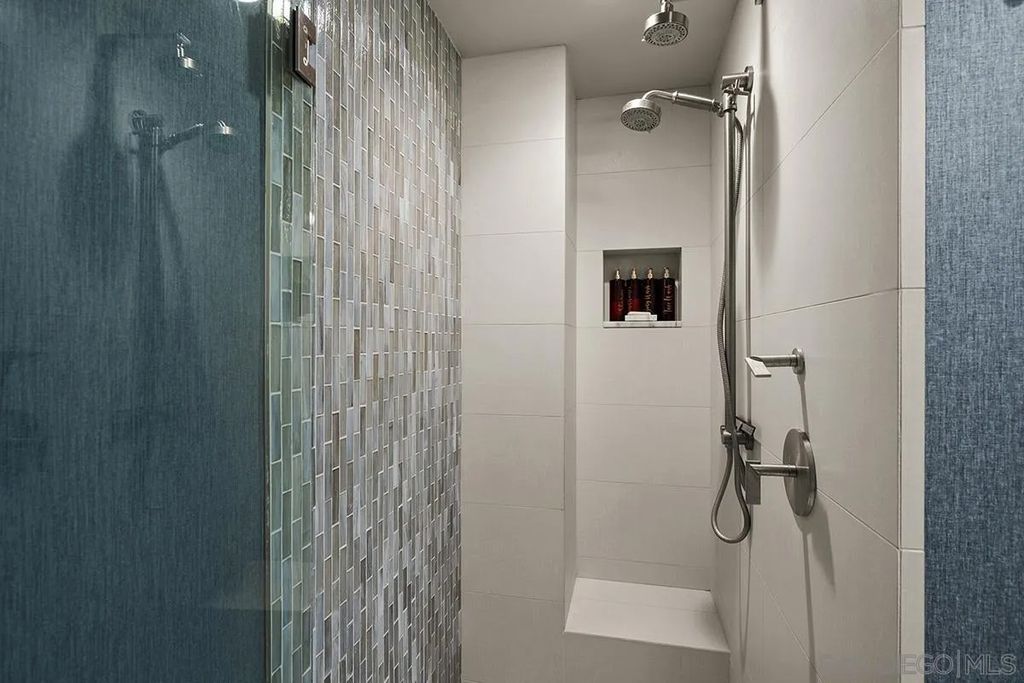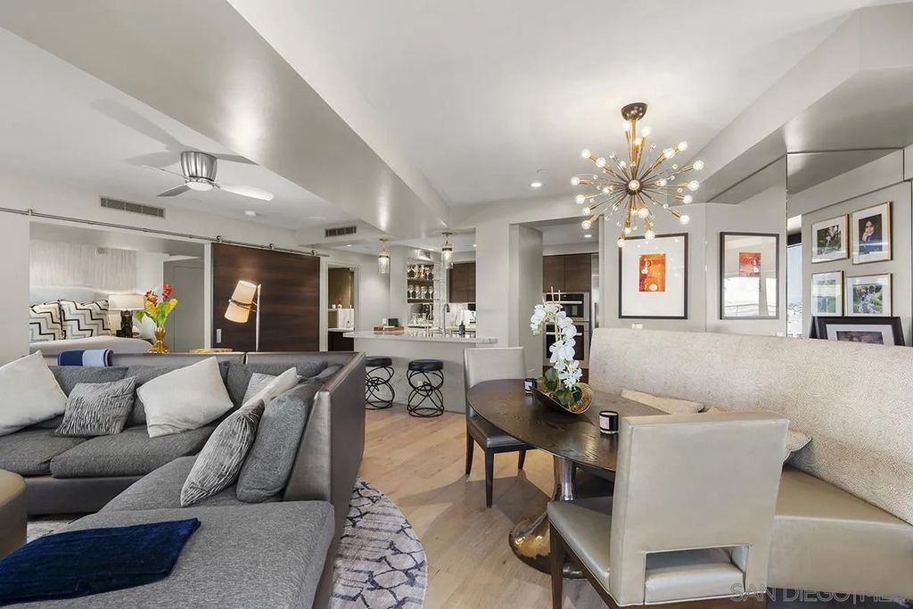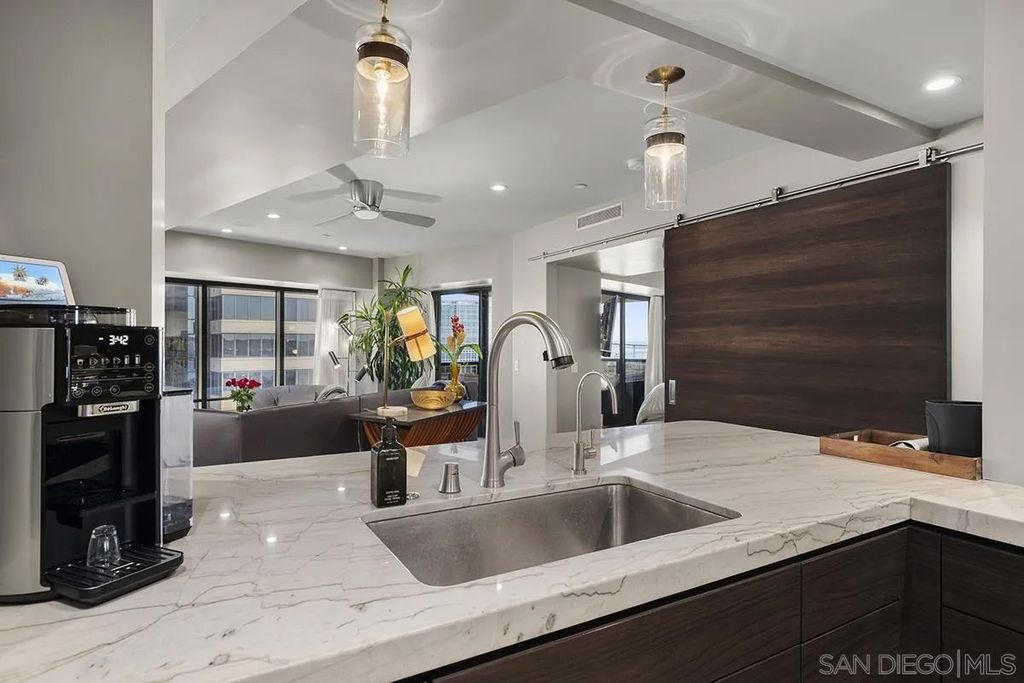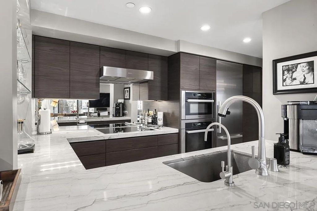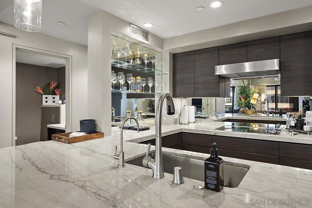 This is the finest 1-bedroom "re-imagined" condo ever seen in the Harbor Club; fully remodeled practically down to the studs! This beautifully curated residence offers a rare blend of luxury, privacy, and prime Marina District living plus one of the few with 1.5 bathrooms to boot. Positioned high enough to rise above neighboring buildings, the home captures sweeping views of the San Diego Bay and the iconic Coronado Bridge through walls of windows flooding the residence with natural light. The professionally decorated interior shows a sleek, modern kitchen appointed with high-end appliances, European-style cabinetry, mirrored backsplash, slab porcelain island, beverage chiller, and an eat-at bar accented by elegant drop lighting making it perfect for both everyday living and entertaining. The primary suite is a serene retreat featuring balcony access, a custom wall treatment, a new built-in closet, and a spa-inspired ensuite bathroom with dual vanity and a step-in rain shower with an additional handheld shower head. Rare for a one-bedroom residence, this home also offers a separate powder room, adding both convenience and sophistication for guests. Additional highlights include a French Oak hardwood flooring, Smart-controlled lighting, built-in sound system throughout, and a secure parking space with EV charger. This is truly a standout opportunity in the heart of the Marina District and luxury urban living at its finest. Residents of the Harbor Club are treated to an array of lavish, resort-inspired amenities that encompass a round-the-clock front desk service, a state-of-the-art gymnasium, an exquisite pool deck, a sociable club room, and a versatile library/business center, among numerous other perks. Nestled in the much-coveted Marina District, the Harbor Club boasts unparalleled ease in traversing the neighborhood on foot, granting effortless access to an array of transportation options, delectable dining establishments, retail therapy, the iconic ballpark, the pulsating Gaslamp Quarter, the artsy East Village, and the scenic Embarcadero - an idyllic setting for serene walks alongside the bay