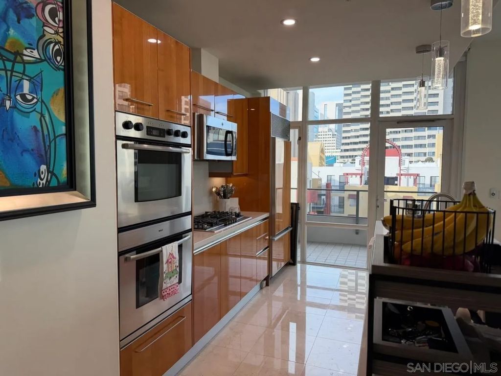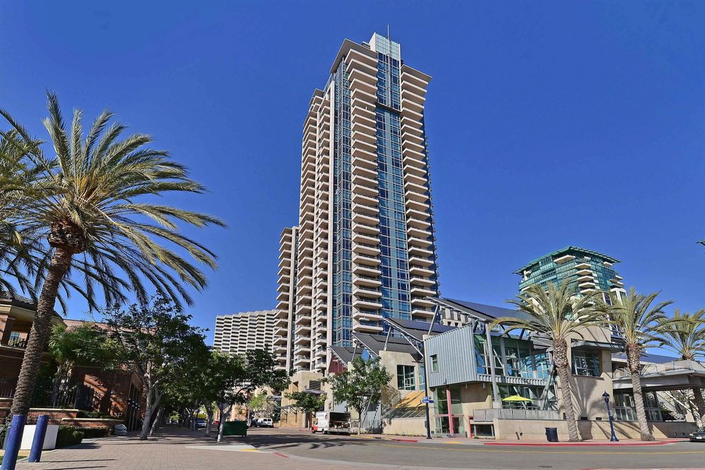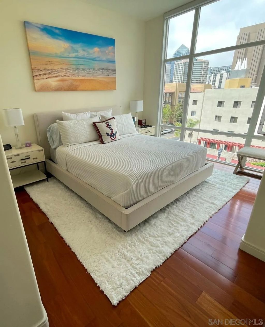 Luxury living at The Pinnacle. Bright NW corner 2-bed, 2-bath home with 10-ft floor-to-ceiling windows, motorized blinds, polished marble floors, and two private terraces offering sweeping 180-degree downtown views. Chef's kitchen with new quartz counters, Italian Snaidero cabinetry, high end appliances, Sub-Zero fridge, and wine cooler. Features dual-zone HVAC, in-unit laundry, two parking spaces, and storage. Resort-style amenities include a 95' lap pool, sauna and steam room, clubhouse, fitness center, concierge, and guest suite. Ideal Marina District location near San Diego Bay, Seaport Village, the Gaslamp Quarter, and Ralphs. This renovated model features a chef's kitchen with custom cabinetry, quartz countertops, and stainless steel appliances including a Sub-Zero refrigerator and wine cooler. Polished marble floors throughout, hardwood flooring in the bedrooms, and bathrooms finished with high-end materials and fixtures. 2 Bed/2Bath 1,297sf + Balconies 226sf = 1,523sf total.