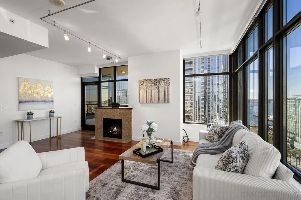 Don't miss this fabulous northwest corner residence at Electra, well maintained for the discerning buyer! Showcasing Bay, Point Loma, and cityscape views from the many windows as well as the private balcony: the ideal place for trademark sunset evenings. The desirable split-bedroom layout is complemented by engineered cherry wood flooring, track lighting, and an ambient fireplace in the living room, creating a comfortable retreat above the city. Enjoy sit down meals in the dining area while the kitchen features granite countertops, stainless appliances, and recessed lighting, making it perfect for both everyday living and entertaining. The primary suite enjoys gorgeous views and an ensuite bath with dual vanity, step-in shower, and deep soaking tub. The second bedroom offers a built-in executive desk area and easily functions as a guest room, office, or flex space. Additional highlights include custom Elfa closet organization throughout, a generously sized utility/laundry room, extra storage space, and two parking spaces (tandem). Offering a fabulous location in the coveted Columbia District, you will love being only a short walk to Waterfront Park, Seaport Village, The Headquarters, vibrant Little Italy, and much more. Offering a fabulous location in the coveted Columbia District, you will love being only a short walk to Waterfront Park, Seaport Village, The Headquarters, and the brand-new Rady's Shell at Jacobs Park, a unique live music venue and home of the San Diego Symphony! Also enjoy proximity to the future life science and biotechnology research development The Research and Development District (The RaDD) at the Embarcadero and the sustainable tech-focused Horton Plaza Redevelopment in the center of the city. Electra has the unique distinction of being built around the historical 1928 SDG&E Station B. Residents can take advantage of an array of services including a concierge, security, and guest parking spaces available by reservation through a simple mobile app. Unwind and relax in the steam room or sauna, resort-style pool and spa, fitness center, and Electra Park on the 5th floor surrounded by lush landscaping and a romantic outdoor fireplace and top-of-the-line barbecues.