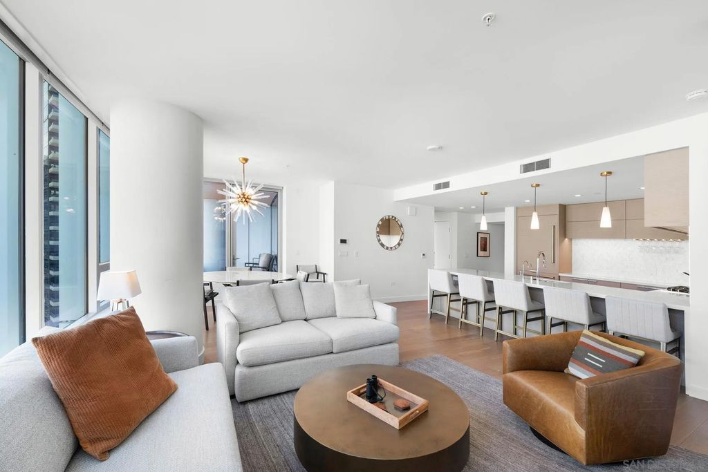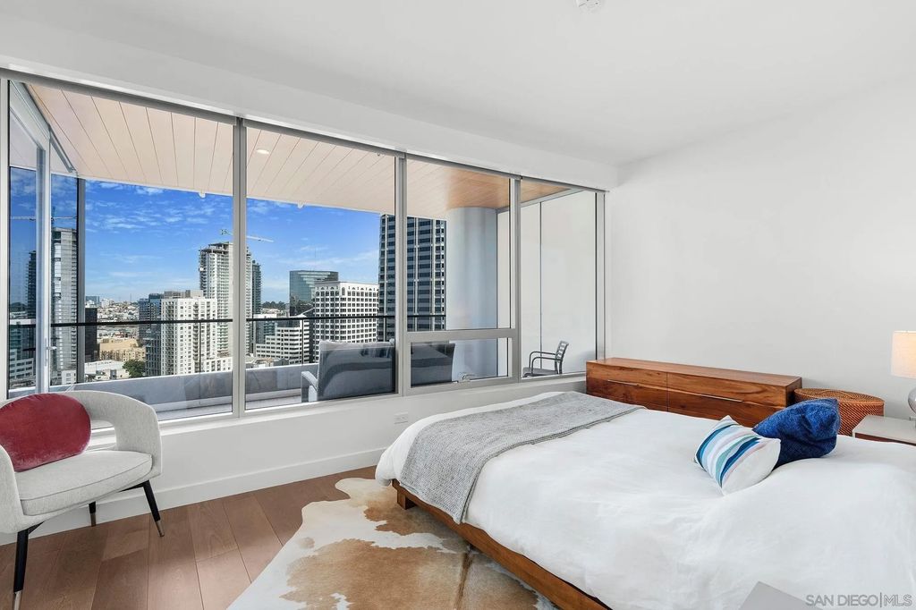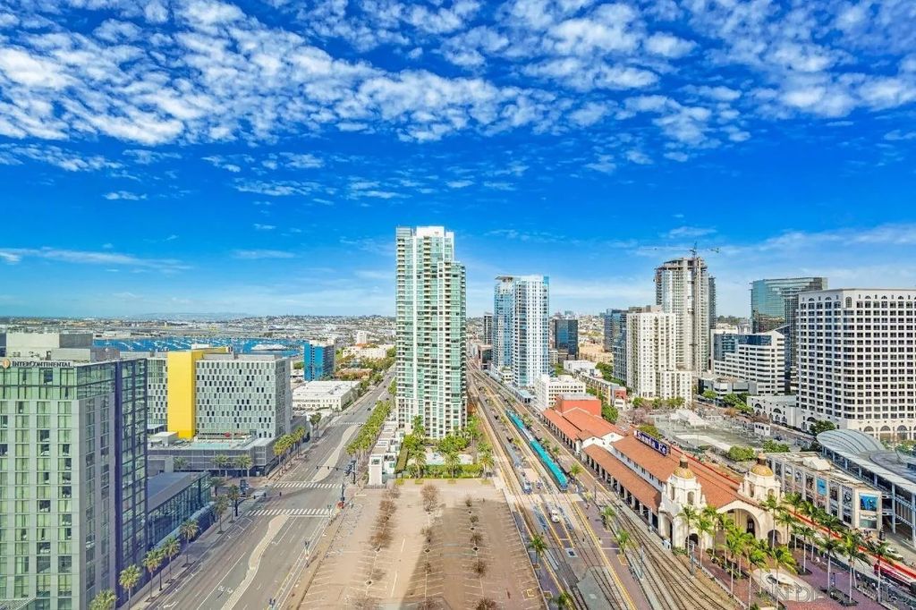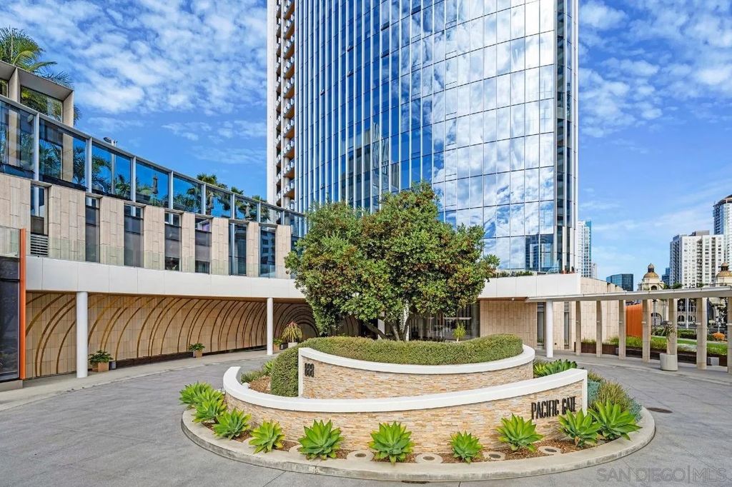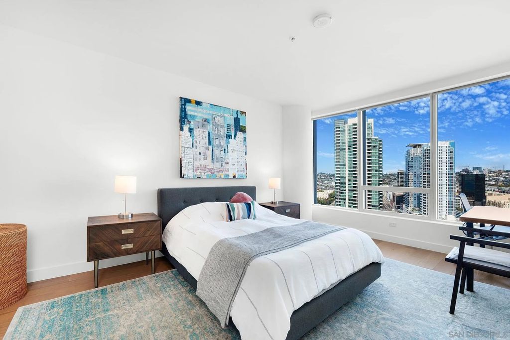 Experience modern luxury in this stunning 2-bedroom, 2-bathroom condo with sweeping views of the San Diego skyline, bay, and marina. Situated on a premier high floor in the prestigious Pacific Gate, this home combines elegance with comfort. Beautifully crafted details and modern finishes flow throughout, highlighted by wide plank hardwood floors and expansive floor-to-ceiling windows that invite natural light in. The residence features a private balcony perfect for morning coffee or an evening glass of wine, flowing open-plan living and dining spaces, and a chef-caliber kitchen with a breakfast bar. The master bedroom includes a five-fixture bathroom and a large walk-in closet, while the entry foyer offers a spacious coat closet and a convenient laundry closet. Whether for full-time living or a spectacular city escape, this home provides a rare opportunity to live atop San Diego with every amenity at your fingertips.