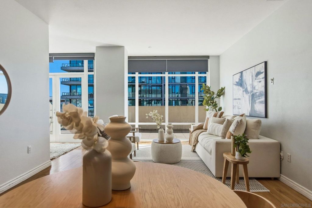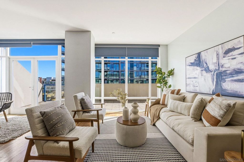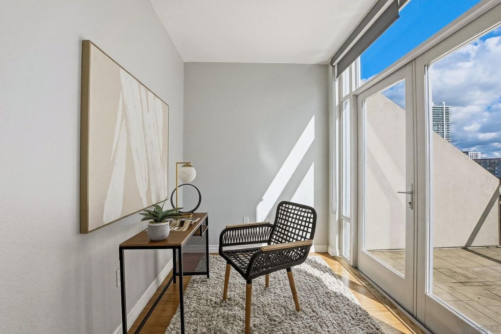 Welcome to elevated downtown living in this rare top-floor residence offering 2 bedrooms, 2 bathrooms, plus a dedicated space perfect for a home office. With no units above, this 1,294 sq. ft. home provides privacy, natural light, and seamless indoor-outdoor flow in the heart of the city. The open-concept layout connects the kitchen, dining, and living areas, flowing effortlessly onto an oversized private-use patio that spans the entire length of the unit. This is a unique and exceptional extension of the living space and ideal for entertaining, relaxing, or enjoying San Diego's year-round weather. Expansive windows fill the home with natural light, enhancing the bright and airy feel throughout. The oversized primary suite features a generous walk-in closet and well-appointed bath, while the secondary bedroom and full bath offer flexibility for guests or additional workspace. Additional highlights include in-unit laundry and two side-by-side parking spaces conveniently located near the elevator. Residents enjoy access to community amenities including a fitness center and a shared outdoor patio with grill. Ideally situated just a few short blocks from the energy of the Gaslamp Quarter and the Ballpark District, this home offers unbeatable access to dining, entertainment, and city life while still providing a private retreat above it all.