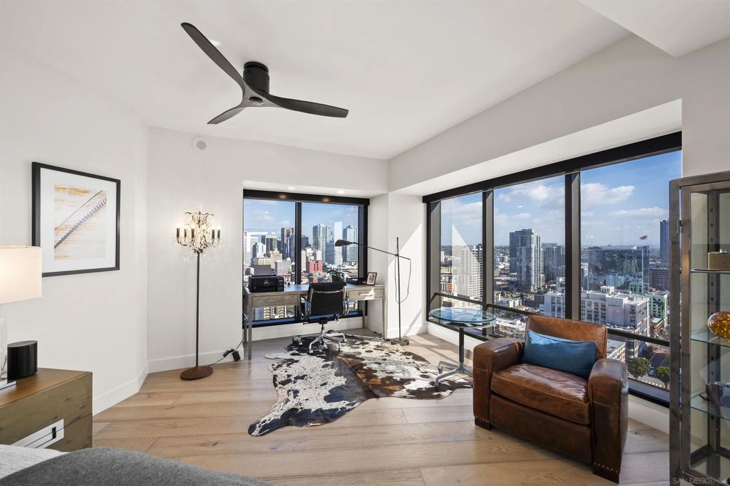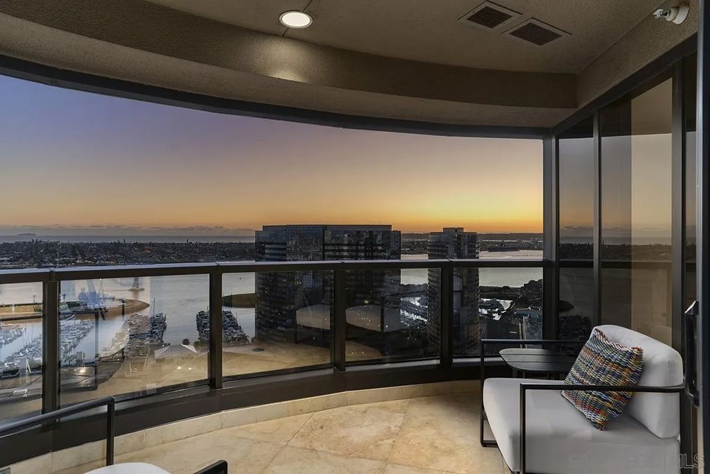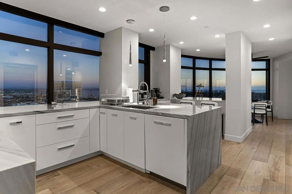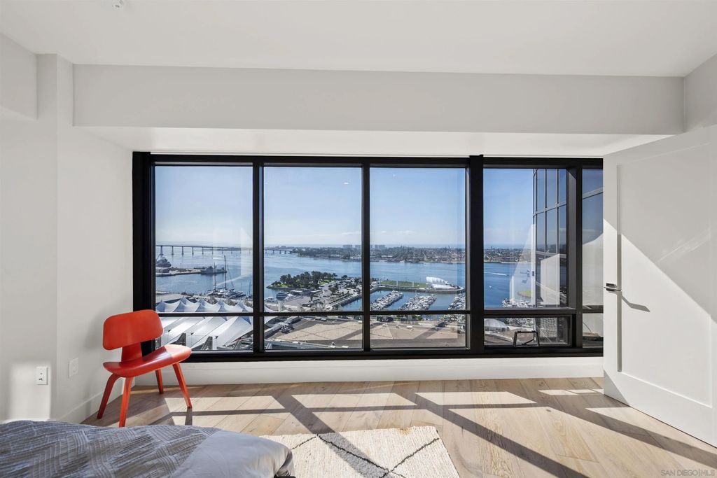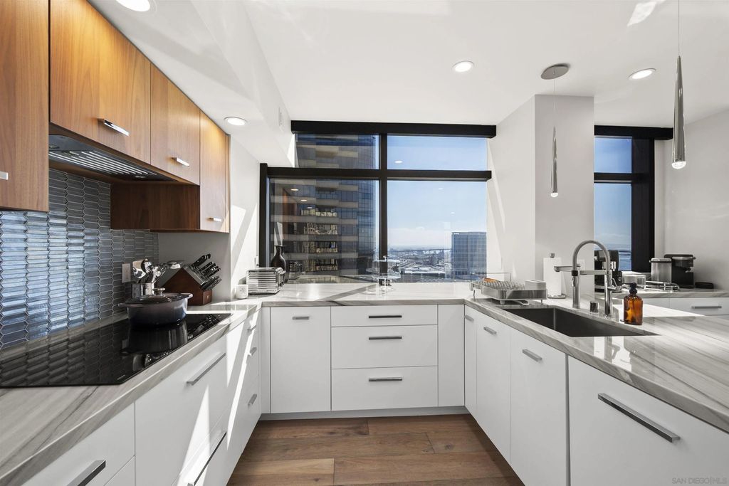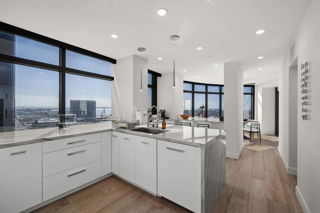 Spanning over half the 28th floor at Harbor Club, this three-bedroom residence has recently been completely reimagined into one of Downtown San Diego's most extraordinary homes. Floor-to-ceiling views stretch in every direction, from the harbor and Coronado to the city skyline and beyond. Hardwood floors flow through the open living areas, complemented by updated ceiling fans and recessed lighting that keep the spaces feeling clean and modern. The kitchen is the kind of room that stops you mid-conversation: crisp white cabinetry paired with warm walnut uppers, veined marble countertops, a striking blue hexagonal tile backsplash, and sweeping bay views through a dramatic curved window wall. A Sub-Zero refrigerator, wall oven, speed oven, and induction cooktop (all Wolf) make it as serious about cooking as it is about aesthetics, while a polished marble bar overlooking the water offers the best seat in the house. The expansive primary suite is a destination itself, with sweeping views, a spaciously organized walk-around closet and large bath. A dedicated powder room with artisan glass and a vessel sink add a boutique touch, while the third bedroom doubles as a home office. Storage in the unit is abundant. Two balconies extend the living space outdoors, and three side-by-side parking spaces (a rarity with Downtown condos) round out the offering. Residents of the Harbor Club are treated to an array of lavish, resort-inspired amenities that encompass a round-the-clock front desk service, a state-of-the-art gymnasium, an exquisite pool deck, a sociable club room, and a versatile library/business center, among numerous other perks. Nestled in the much-coveted Marina District, the Harbor Club boasts unparalleled ease in traversing the neighborhood on foot, granting effortless access to an array of transportation options, delectable dining establishments, retail therapy, the iconic ballpark, the pulsating Gaslamp Quarter, the artsy East Village, and the scenic Embarcadero - an idyllic setting for serene walks alongside the bay.