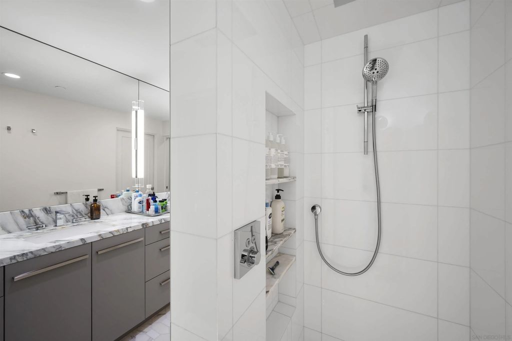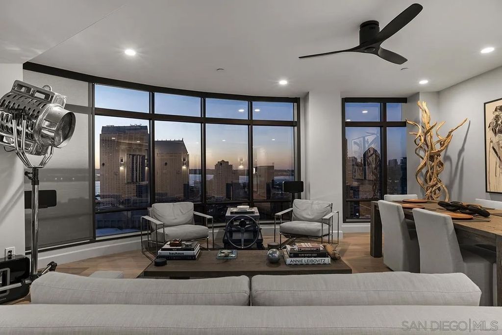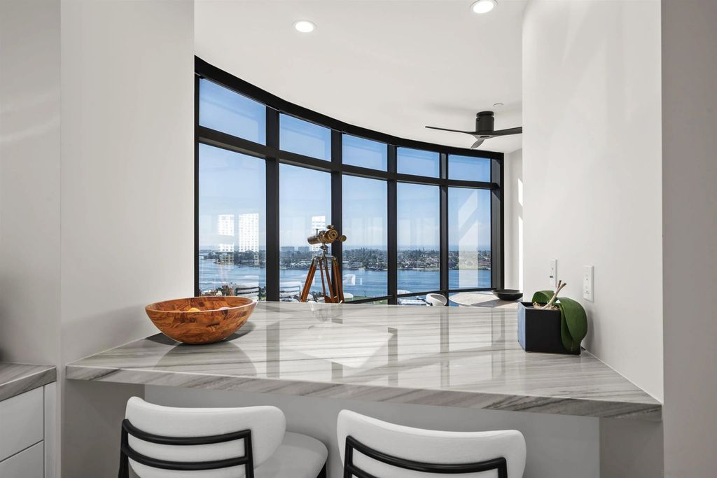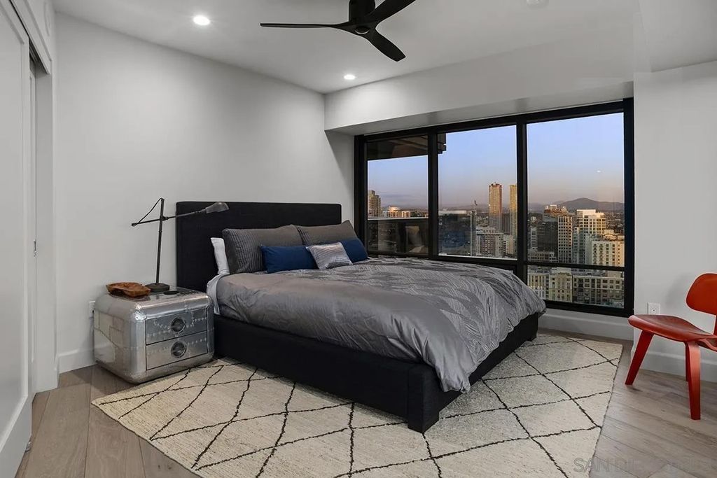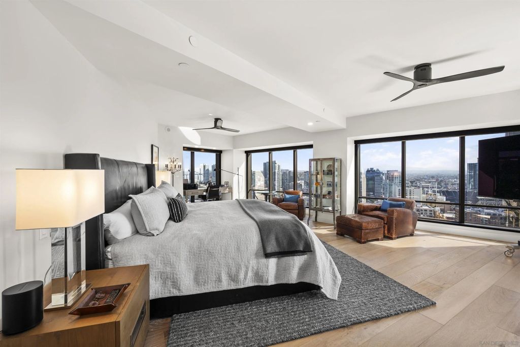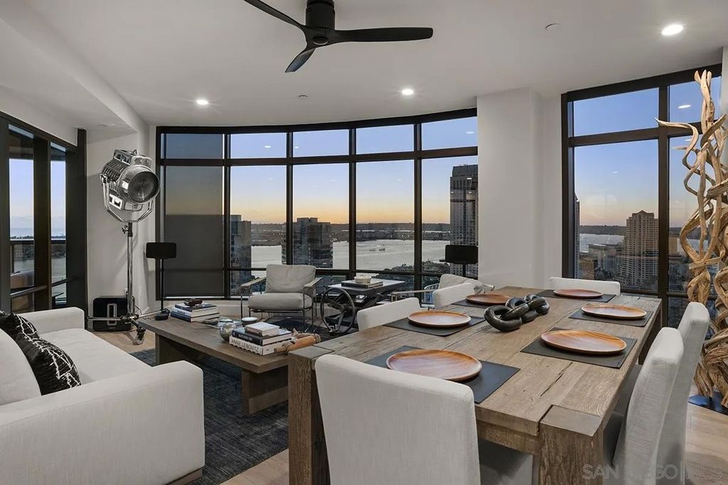 Spanning over half the 28th floor at Harbor Club, this three-bedroom residence has recently been completely reimagined into one of Downtown San Diego's most extraordinary homes. Floor-to-ceiling views stretch in every direction, from the harbor and Coronado to the city skyline and beyond. Hardwood floors flow through the open living areas, complemented by updated ceiling fans and recessed lighting that keep the spaces feeling clean and modern. The kitchen is the kind of room that stops you mid-conversation: crisp white cabinetry paired with warm walnut uppers, veined marble countertops, a striking blue hexagonal tile backsplash, and sweeping bay views through a dramatic curved window wall. A Sub-Zero refrigerator, wall oven, speed oven, and induction cooktop (all Wolf) make it as serious about cooking as it is about aesthetics, while a polished marble bar overlooking the water offers the best seat in the house. The expansive primary suite is a destination itself, with sweeping views, a spaciously organized walk-around closet and large bath. A dedicated powder room with artisan glass and a vessel sink add a boutique touch, while the third bedroom doubles as a home office. Storage in the unit is abundant. Two balconies extend the living space outdoors, and three side-by-side parking spaces (a rarity with Downtown condos) round out the offering. Residents of the Harbor Club are treated to an array of lavish, resort-inspired amenities that encompass a round-the-clock front desk service, a state-of-the-art gymnasium, an exquisite pool deck, a sociable club room, and a versatile library/business center, among numerous other perks. Nestled in the much-coveted Marina District, the Harbor Club boasts unparalleled ease in traversing the neighborhood on foot, granting effortless access to an array of transportation options, delectable dining establishments, retail therapy, the iconic ballpark, the pulsating Gaslamp Quarter, the artsy East Village, and the scenic Embarcadero - an idyllic setting for serene walks alongside the bay.