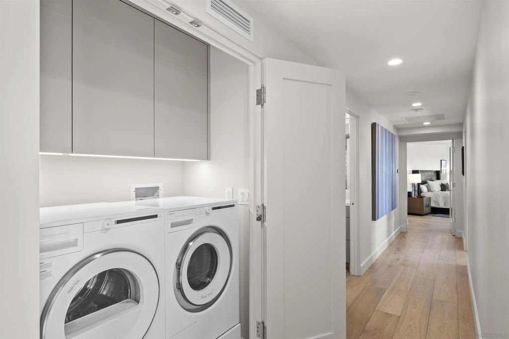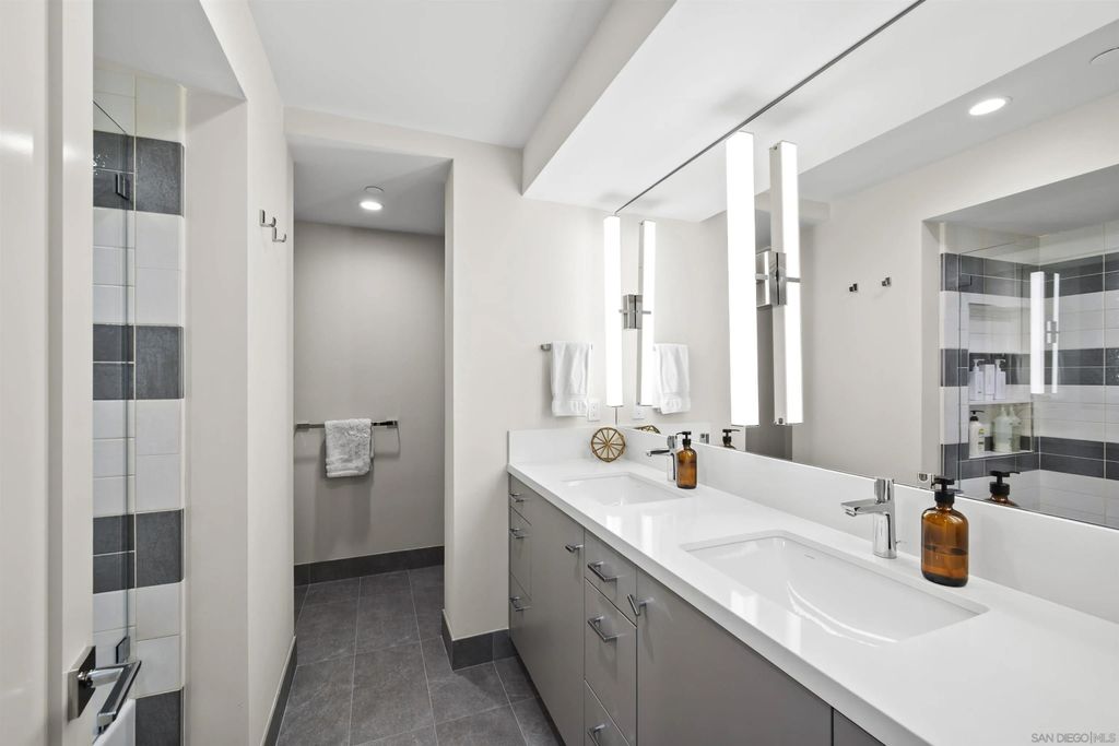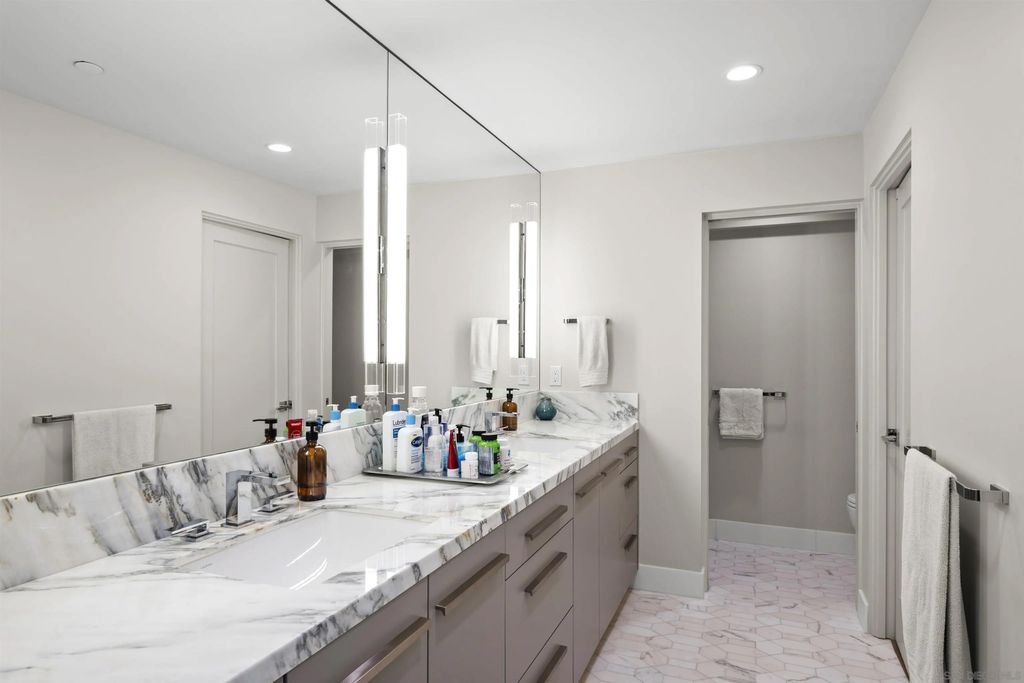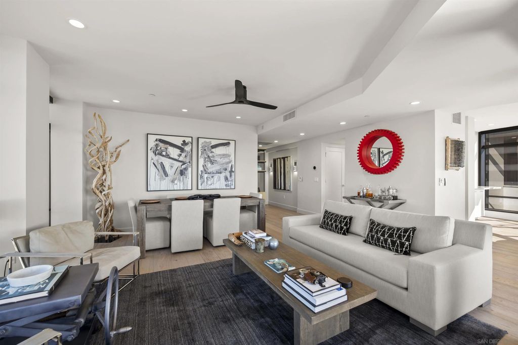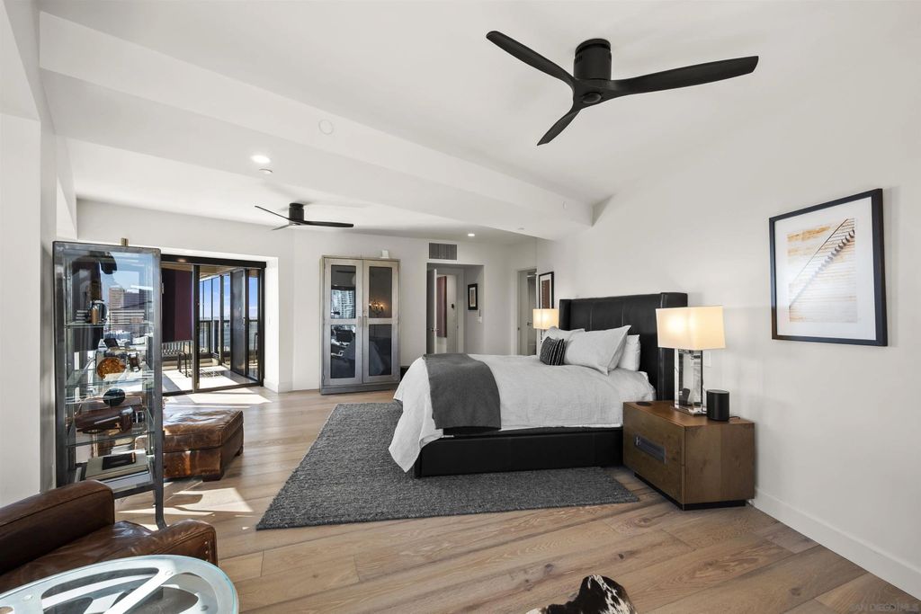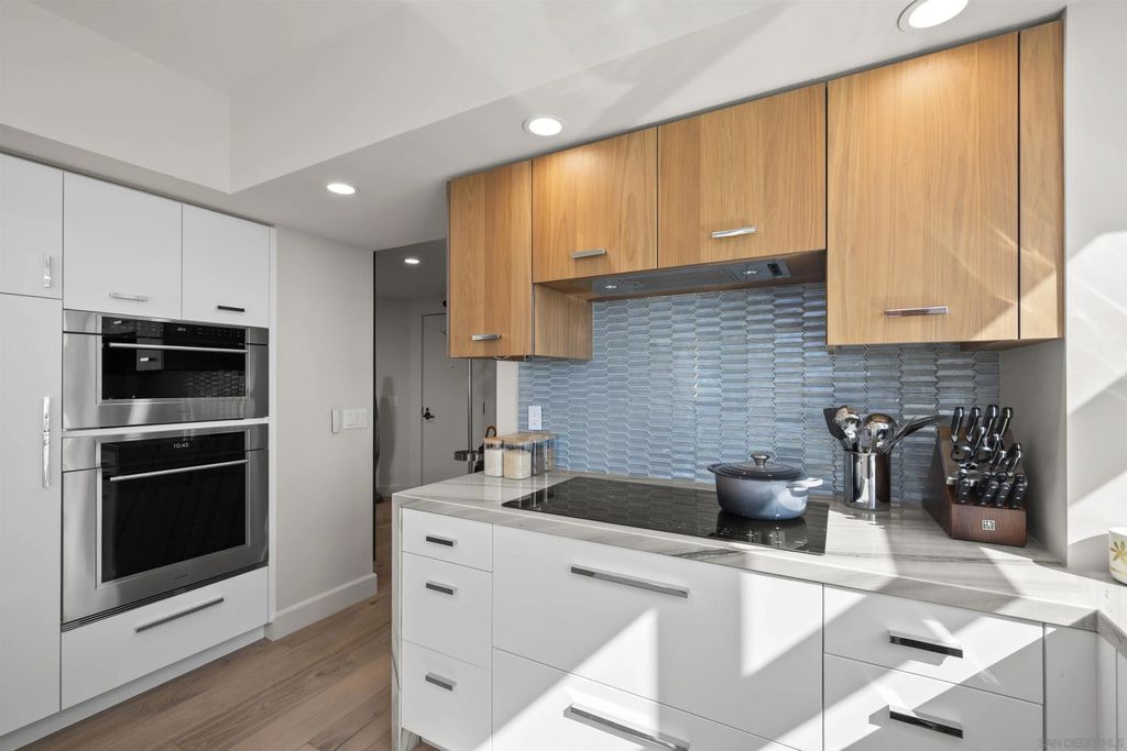 Spanning over half the 28th floor at Harbor Club, this three-bedroom residence has recently been completely reimagined into one of Downtown San Diego's most extraordinary homes. Floor-to-ceiling views stretch in every direction, from the harbor and Coronado to the city skyline and beyond. Hardwood floors flow through the open living areas, complemented by updated ceiling fans and recessed lighting that keep the spaces feeling clean and modern. The kitchen is the kind of room that stops you mid-conversation: crisp white cabinetry paired with warm walnut uppers, veined marble countertops, a striking blue hexagonal tile backsplash, and sweeping bay views through a dramatic curved window wall. A Sub-Zero refrigerator, wall oven, speed oven, and induction cooktop (all Wolf) make it as serious about cooking as it is about aesthetics, while a polished marble bar overlooking the water offers the best seat in the house. The expansive primary suite is a destination itself, with sweeping views, a spaciously organized walk-around closet and large bath. A dedicated powder room with artisan glass and a vessel sink add a boutique touch, while the third bedroom doubles as a home office. Storage in the unit is abundant. Two balconies extend the living space outdoors, and three side-by-side parking spaces (a rarity with Downtown condos) round out the offering. Residents of the Harbor Club are treated to an array of lavish, resort-inspired amenities that encompass a round-the-clock front desk service, a state-of-the-art gymnasium, an exquisite pool deck, a sociable club room, and a versatile library/business center, among numerous other perks. Nestled in the much-coveted Marina District, the Harbor Club boasts unparalleled ease in traversing the neighborhood on foot, granting effortless access to an array of transportation options, delectable dining establishments, retail therapy, the iconic ballpark, the pulsating Gaslamp Quarter, the artsy East Village, and the scenic Embarcadero - an idyllic setting for serene walks alongside the bay.