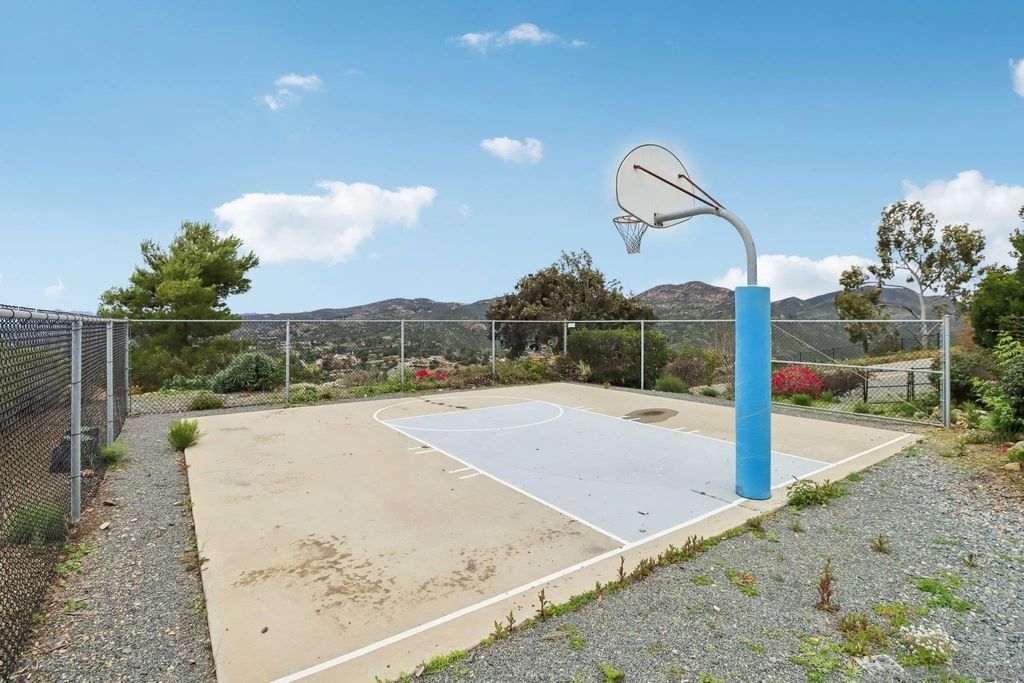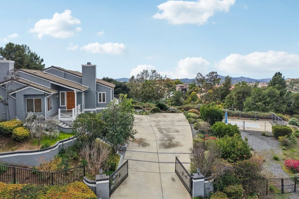 Stunning 5-bedroom, 4.5-bathroom El Cajon estate with panoramic mountain views, situated on a private 1-acre gated lot. Offering 3,947 sq ft, this expansive single-family home with attached 2-bedroom guest suite and separate entrance is ideal for multigenerational living or rental income potential. The home features a dramatic vaulted-ceiling great room with wall-to-wall windows, gas fireplace, and view balcony, plus a spacious family room with wet bar, built-ins, and a walk-out to the large west-facing deck with unobstructed views. The chef's kitchen includes dual cooking options (electric range and gas grill), wall oven, warming drawer, walk-in pantry, oversized refrigerator, and breakfast bar"”perfect for entertaining. The private primary suite offers a gas fireplace, dual closets, and spa-style bath with jetted tub and walk-in shower. Additional highlights include solar power, central HVAC, central vacuum, wine storage, built-in BBQ, fire pit, spa, private basketball court, and abundant storage throughout. Parking is exceptional with a 3-car attached garage, dual driveways, and space for 10+ vehicles. Located minutes from shopping, dining, and freeway access, this gated El Cajon view home offers privacy, flexibility, and resort-style living.
