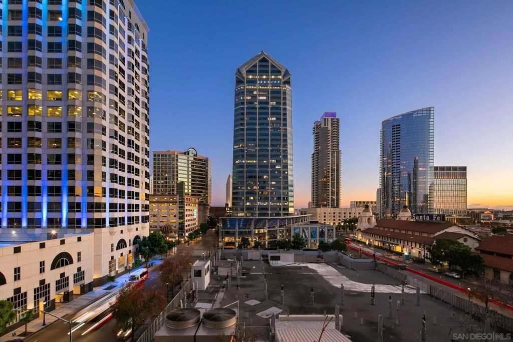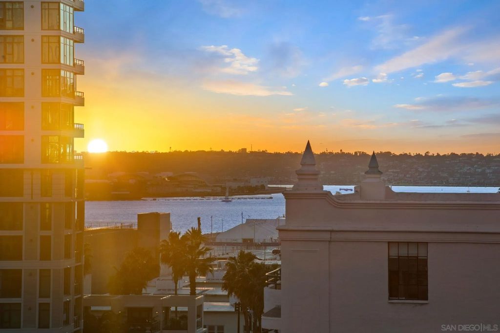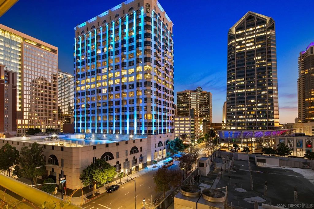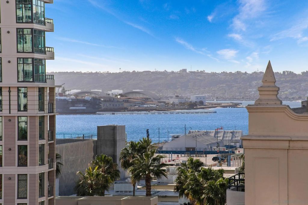 Prime southwest corner residence at Treo in the prestigious vibrant Columbia District/Little Italy, showcasing sweeping panoramic views of the downtown skyline and sparkling bay and waterfront. Offering approximately 1,441 square feet, this beautifully remodeled 2-bedroom, 2-bath plus 3rd room den/office floor plan is elevated by its desirable corner positioning and two private balconies that capture water and city views plus natural light throughout. Designed as a true turnkey opportunity, every detail has already been thoughtfully curated. Luxury vinyl plank flooring flows seamlessly throughout the home, complemented by a stunning remodeled kitchen with sleek quartz countertops, tile backsplash, designer cabinetry and stainless steel appliances. The upgraded bathrooms feature modern finishes and clean, contemporary design. Fresh interior paint enhances the light and airy aesthetic. Two secured parking spaces and dedicated storage add exceptional convenience. Ideally positioned in one of Downtown San Diego's most walkable neighborhoods, residents enjoy effortless access to the Waterfront Park, Little Italy's renowned dining scene, the Embarcadero, Seaport Village, Santa Fe Depot, and premier shopping and entertainment. Treo offers resort-style amenities including a lap pool and spa, state-of-the-art fitness center, resident lounge, outdoor BBQ area, on-site management, and secured entry. With its prime location, impeccable condition, and exceptional lifestyle appeal, this residence truly embodies the best of urban luxury living.
