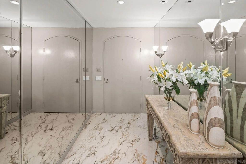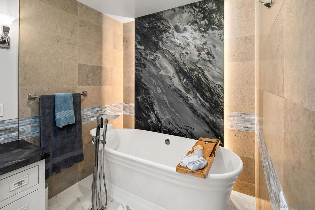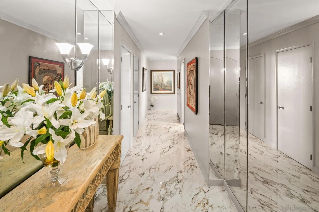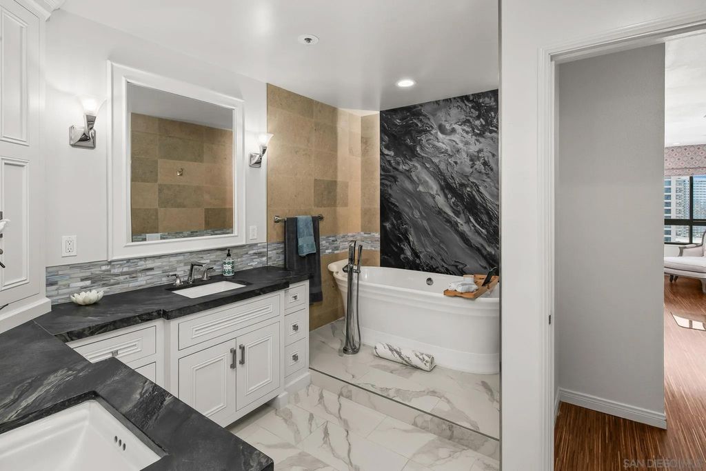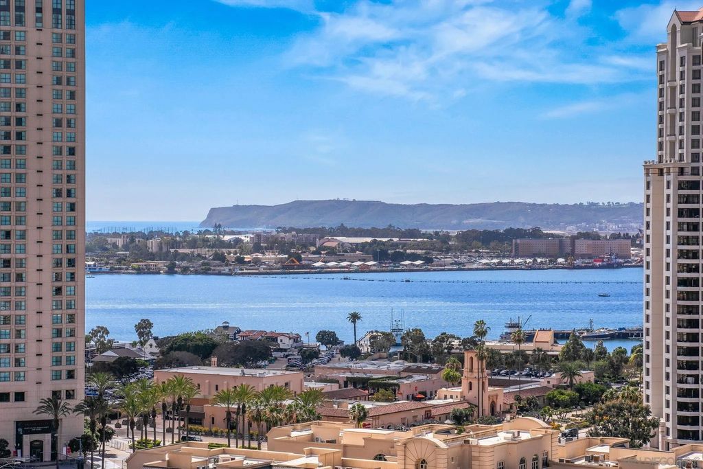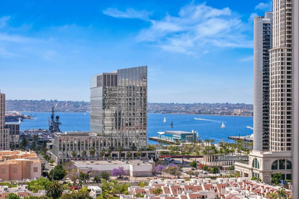 Ocean views set the tone, defining a refined retreat in the heart of San Diego where modern design meets the ease of luxury high-rise living. Set above the city, in the iconic Meridian, this expansive 2 bedroom, 2 bath residence captures sweeping panoramas across the downtown skyline to the Coronado Bridge, San Diego Bay, and beyond to the Pacific Ocean"”creating a striking backdrop from sunrise to sunset. Thoughtfully designed with modern European influences, this residence showcases an open-concept layout enhanced by custom cabinetry, refined finishes, and a sleek, well-appointed kitchen with premium appliances and leathered granite surfaces. The primary suite offers a spa-inspired retreat with black leathered quartzite countertops, a standalone soaking tub, quartzite and tile walk in shower, heated towel rack, relaxing and serene, while the second bedroom"”currently configured as a home office"”provides flexibility to suit a variety of lifestyles. A private terrace invites seamless indoor-outdoor living, perfectly positioned to capture the remarkable views. An extraordinary residence to relax or entertain. The Meridian, one of downtown San Diego's most distinguished residential towers, located in the highly sought after Marina District, offers a refined, secure, and effortless lifestyle"”ideal for those seeking sophistication, comfort, and panoramic views in the heart of downtown San Diego. Residences are thoughtfully designed with expansive floor plans, generous ceiling heights, and floor-to-ceiling windows that frame sweeping views of the San Diego Bay, Pacific Ocean, city skyline, and distant mountains. Enjoy resort-style living with a wide variety of elevated amenities, including 24-hour concierge and 24 hour valet service to owners and their guests, two fitness centers with sauna and steam rooms, and an expansive outdoor deck featuring a heated pool, spa, cabanas, firepit lounge, and landscaped gardens. The building is celebrated for its attentive staff, offering a level of service that redefines everyday living.
