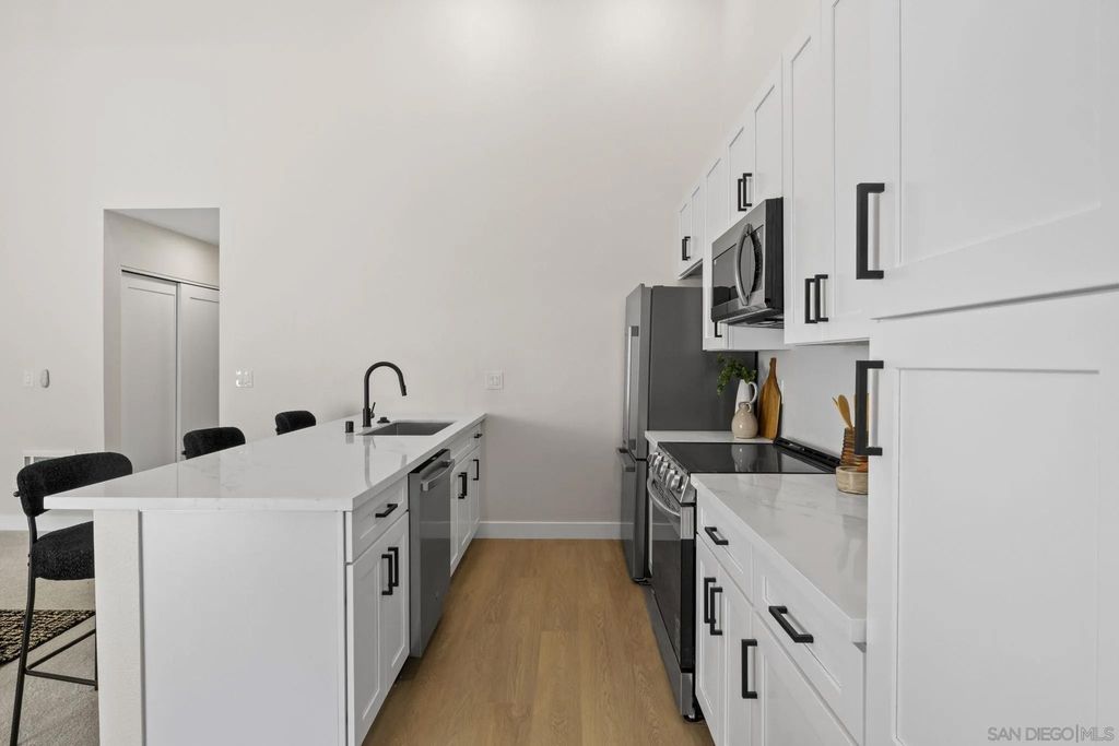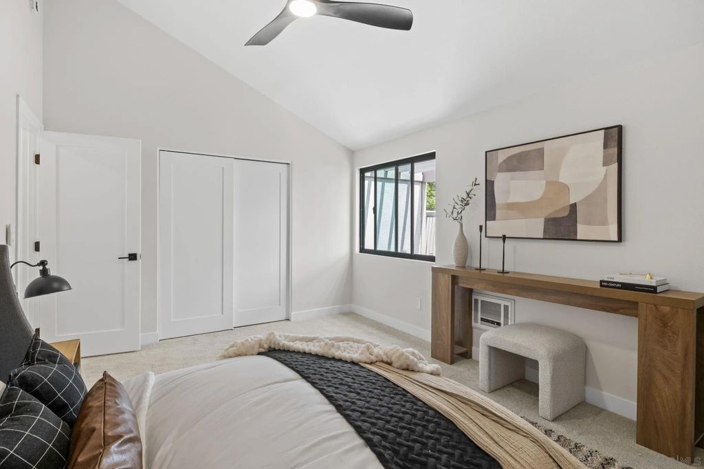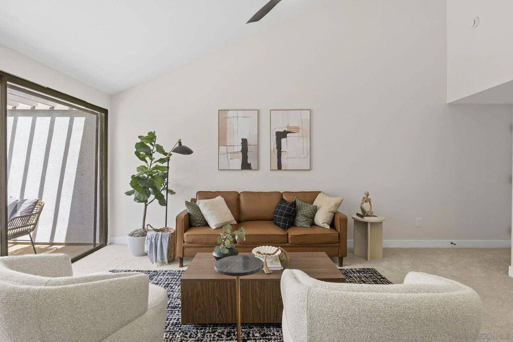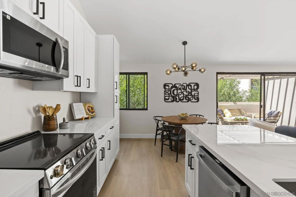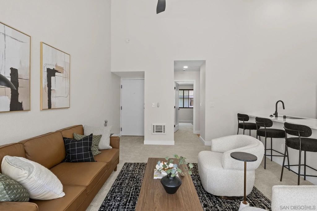 VA Approved! Beautifully remodeled upper-unit condo in the heart of University City with no neighbors above and vast vaulted ceilings throughout. This stylish, move-in ready home showcases a brand-new kitchen with white shaker cabinetry, quartz countertops, new appliances, and a modern backsplash. Thoughtful upgrades include new windows, a new sliding door, and new lighting and fixtures throughout. The bathroom has been fully refreshed with a new vanity, quartz counters, and a custom tile shower. The spacious bedroom is complemented by multiple closets for exceptional storage. Garage parking adds convenience, and the central location puts you just minutes from shopping, restaurants, major freeways, and all that University City has to offer. Enjoy the pool and of being next to restaurants and shopping.