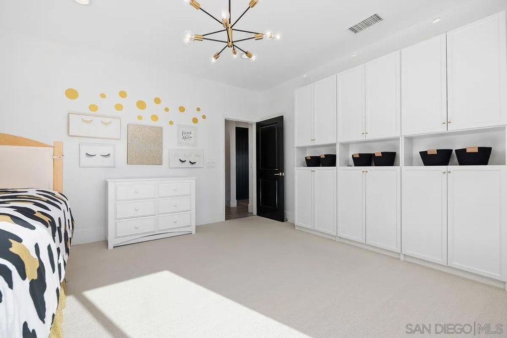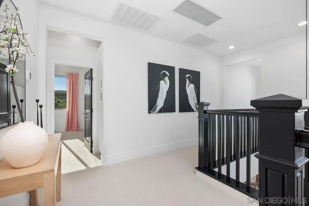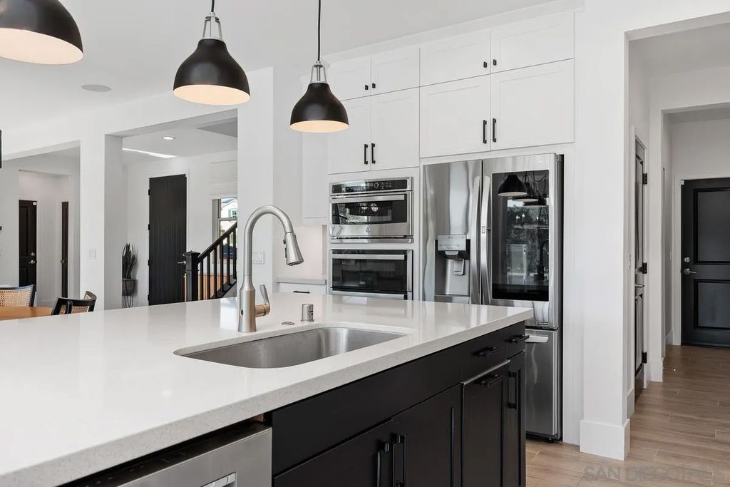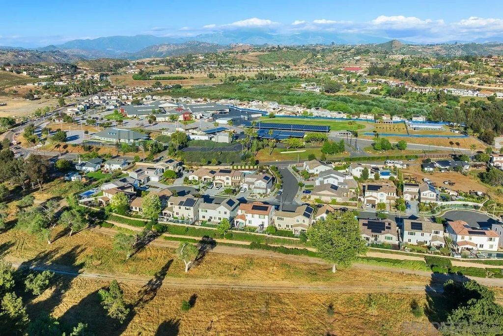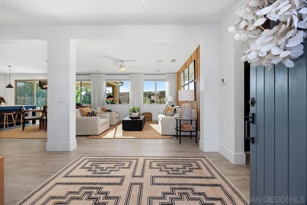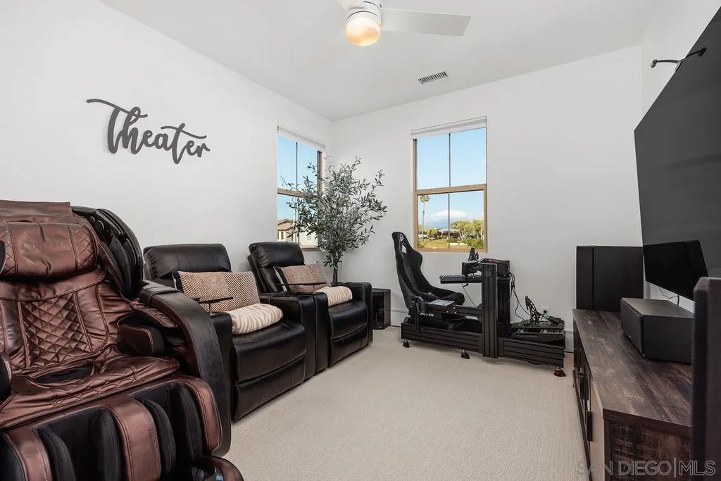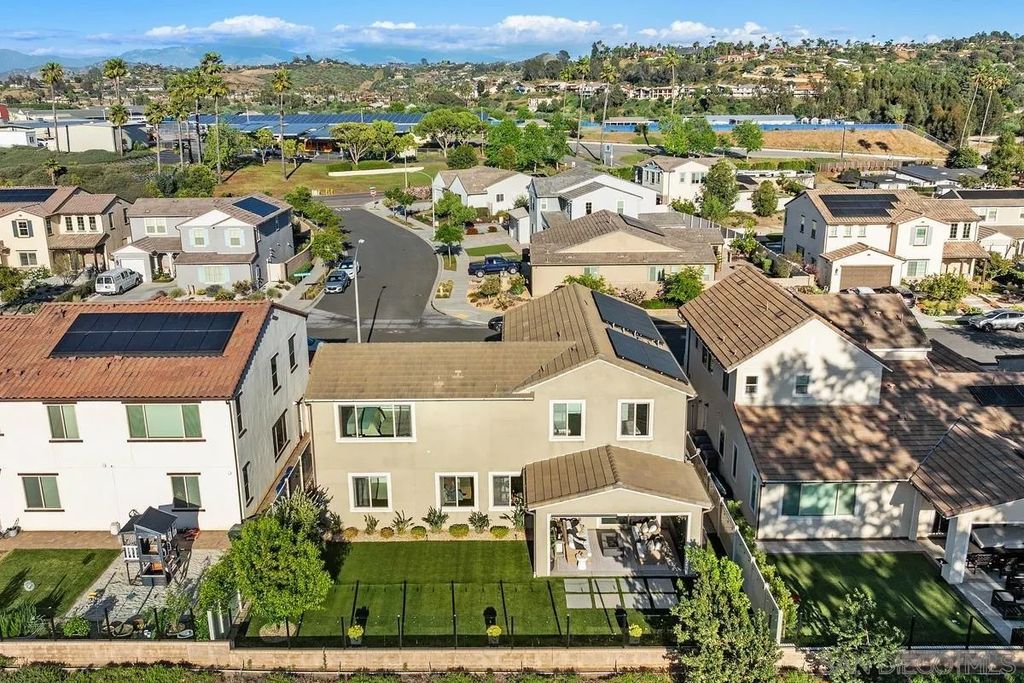 Exuding sophistication and model-home perfection, this exceptional residence in the coveted S.L. Rey community of Bonsall offers refined living at its finest. Thoughtfully designed, the home features 4 spacious bedrooms upstairs and a versatile main-level bonus room ideal for a private office or guest retreat. At the heart of the home, the chef-inspired kitchen showcases quartz countertops, an expansive island, soft-close cabinetry, a walk-in pantry, and a butler's pantry with custom built-ins for seamless organization. Premium upgrades include a hands-free faucet, newer double oven and microwave, and stylish pendent lights. The living space is enhanced with surround sound and a designer feature slat wall, while upstairs offers plush, like-new carpeting, a statement staircase with stunning designer chandelier suspended from the second story ceiling, upgraded ceiling fans, and smart motorized blinds. Additional high-end features include 7-inch baseboards, smart lighting controls, A/C, OWNED solar, and a tankless water heater for optimal efficiency and comfort. Step into a beautifully curated outdoor retreat featuring low-maintenance turf, mature fruit trees, and tranquil greenbelt views-an ideal setting for both relaxation and entertaining.The epoxy-finished 3-car garage, along with rain gutters and French drains, reflects the home's attention to detail. Enjoy close proximity to top-rated schools and over 100 acres of scenic walking, biking, and equestrian trails"”all with no Mello-Roos. A rare opportunity to own a truly turnkey home where luxury, comfort, and lifestyle meet