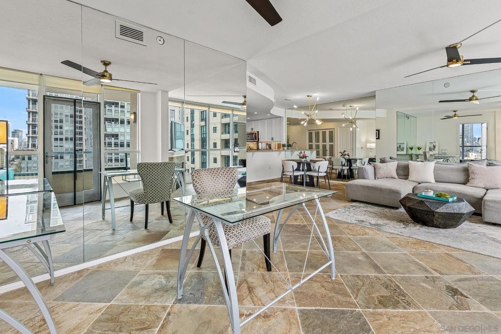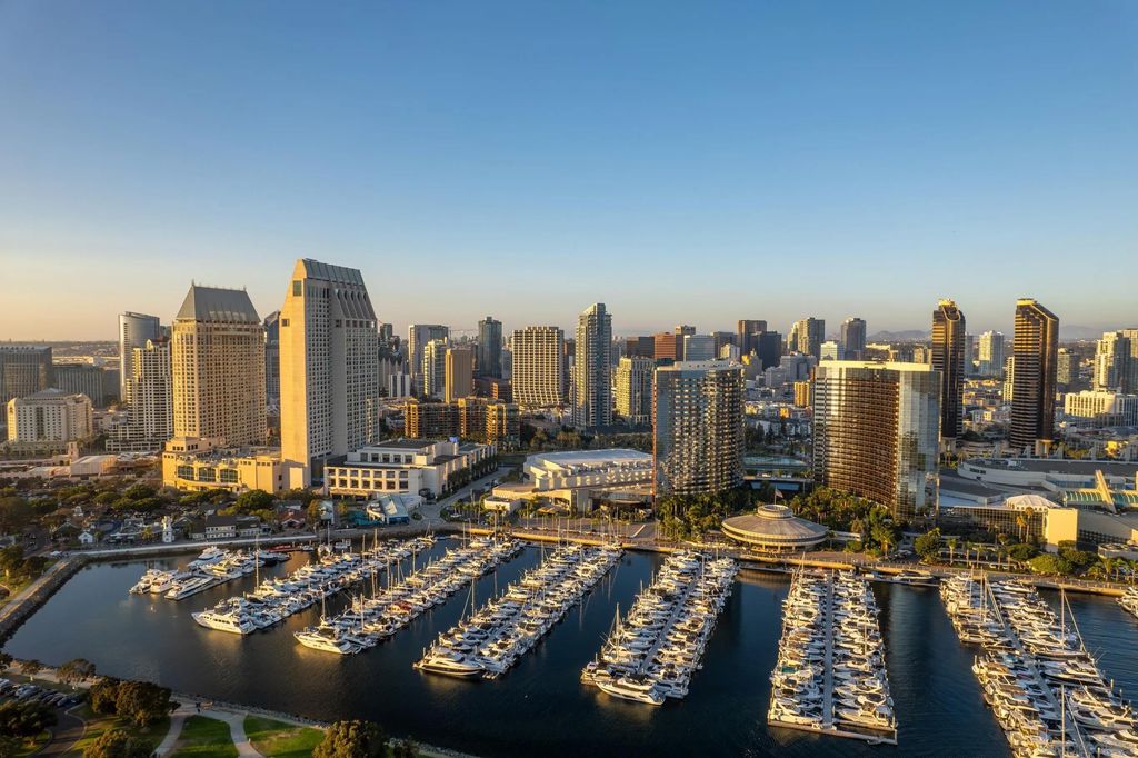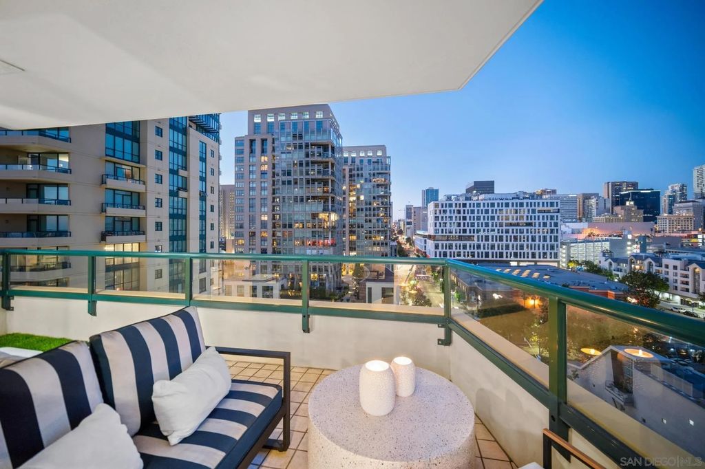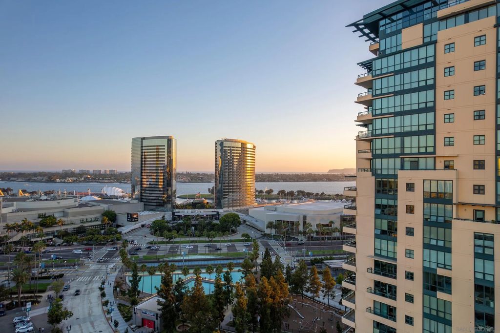 Spacious & bright corner unit with incredible panoramic views of downtown from every window! Located in the heart of the Marina District, this chic condo boasts floor-to-ceiling windows, a well-designed layout to include a versatile den with access to the balcony, perfect for a home office, fitness area, or a creative studio. The stone-surround gas fireplace sets the mood for romance while the open kitchen boasts stainless steel appliances, crisp white cabinetry, and granite counters. The primary bedroom features a large walk-in closet, blackout shades, access to the patio, and an ensuite bath with a shower/tub combo and plenty of cabinet storage. Additional features include a second bathroom with a walk-in shower and an in-unit laundry closet large enough to accommodate a full-sized washer and dryer! Upgrades include premium light fixtures, ceiling fans, blackout blinds, new modern doors and fresh paint throughout. Enjoy beautiful sunset views of Downtown from your large private patio. Horizon residents enjoy year-round socials for the entire community. Resident amenities include a gym, pool, spa, conference room, lounge, remodeled lobbies and some common areas, storage unit, EV chargers, guest parking, and 24-hour gated security. Ideally situated just steps to The Rady Shell and Seaport Village, adjacent to an off-leash dog park, with a short stroll to a Padres games and concerts at Petco Park. You're also moments to Little Italy, the Gaslamp Quarter and San Diego's incredible calendar of events. *** Horizon residents enjoy year-round socials for the entire community. Resident amenities include a gym, pool, spa, conference room, lounge, remodeled lobbies and some common areas, storage unit, EV chargers, guest parking, and 24-hour gated security. Ideally situated just steps to The Rady Shell and Seaport Village, adjacent to an off-leash dog park, with a short stroll to a Padres games and concerts at Petco Park. You're also moments to Little Italy, the Gaslamp Quarter and San Diego's incredible calendar of events.