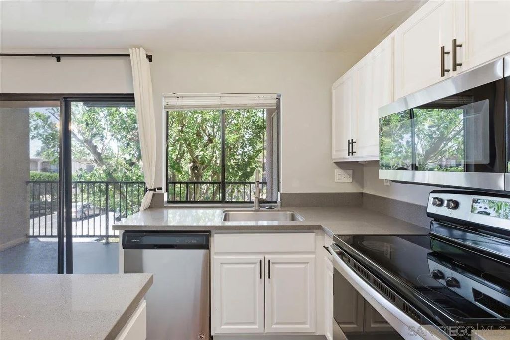 Step into your large 2br 2bath corner unit condo tucked away in a private community in San Carlos. You're just a few minute drive to Cowles Mtn for great hiking and sunsets! This unit offers a split floorplan with thoughtful finishes. Kitchen has quartz countertops with white cabinetry and stainless steel appliances. The bedrooms and living area has been freshly repainted. Both bathroom showers were updated along with newer vanity lights and mirrors. New vinyl plank installed in the primary ensuite bath. The community offers a pool with spa and clubhouse. The Balcony off the main dining has a large tree offering lots of shade in the summer months. Wall space heaters in each room. Wall AC unit in the main living area. One parking space. Laundry room on each floor of the building.