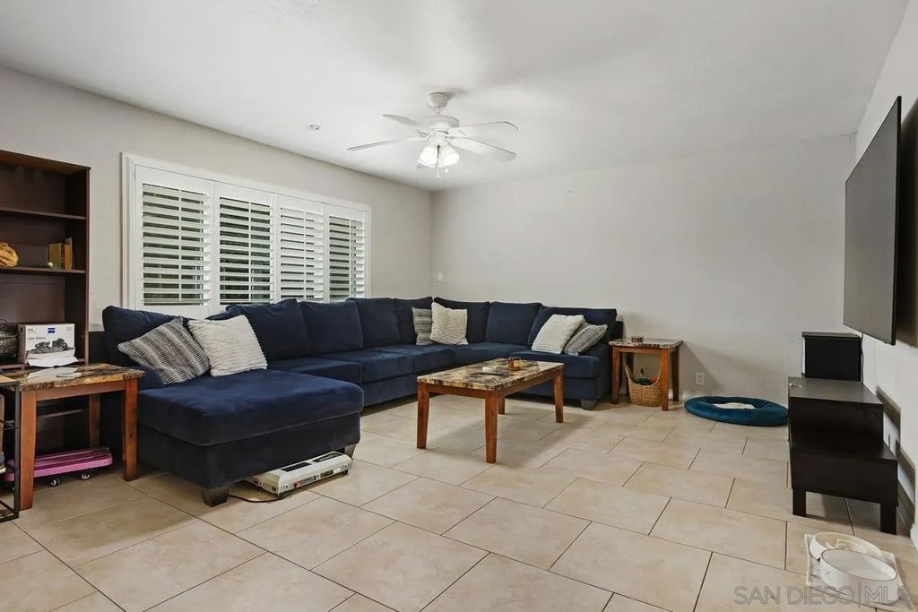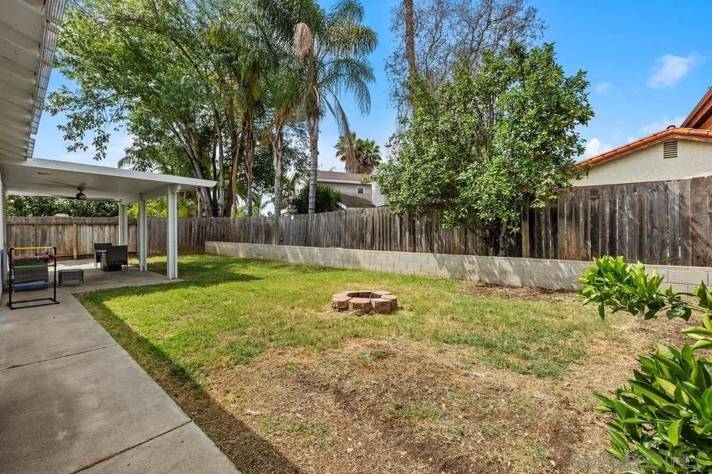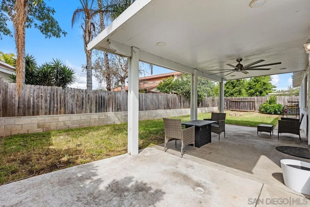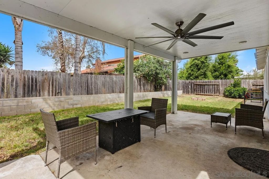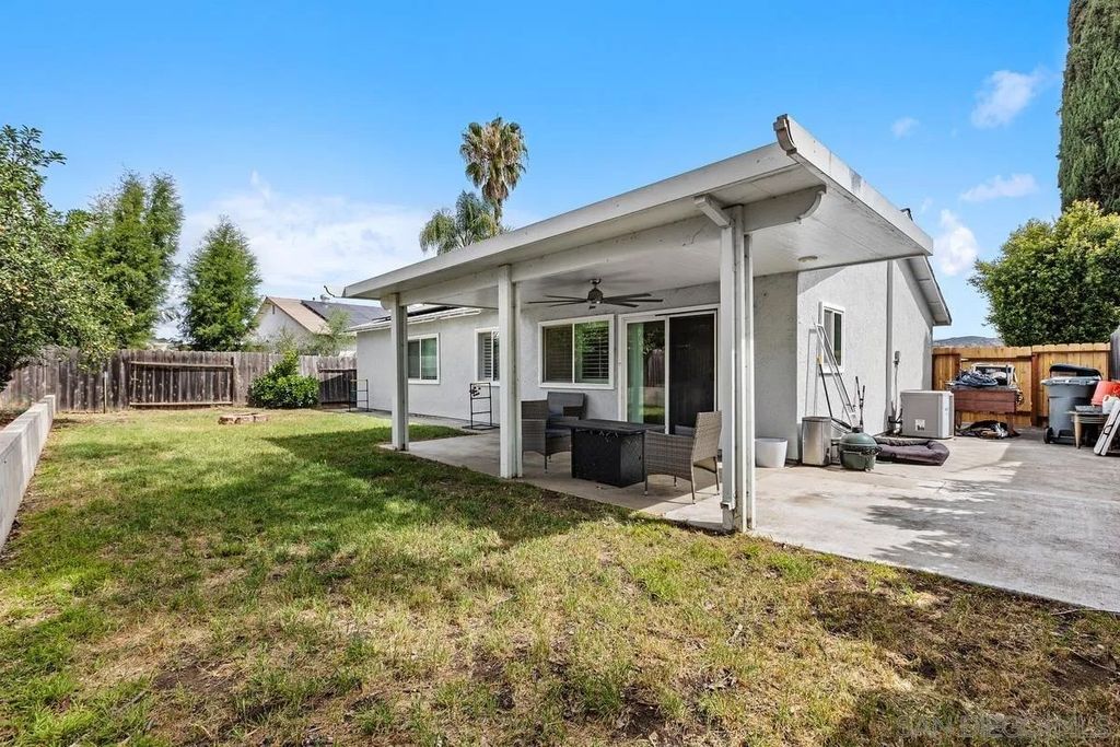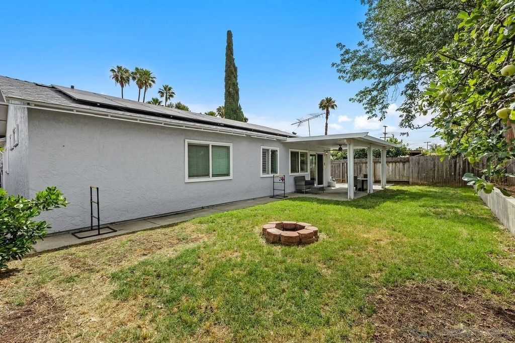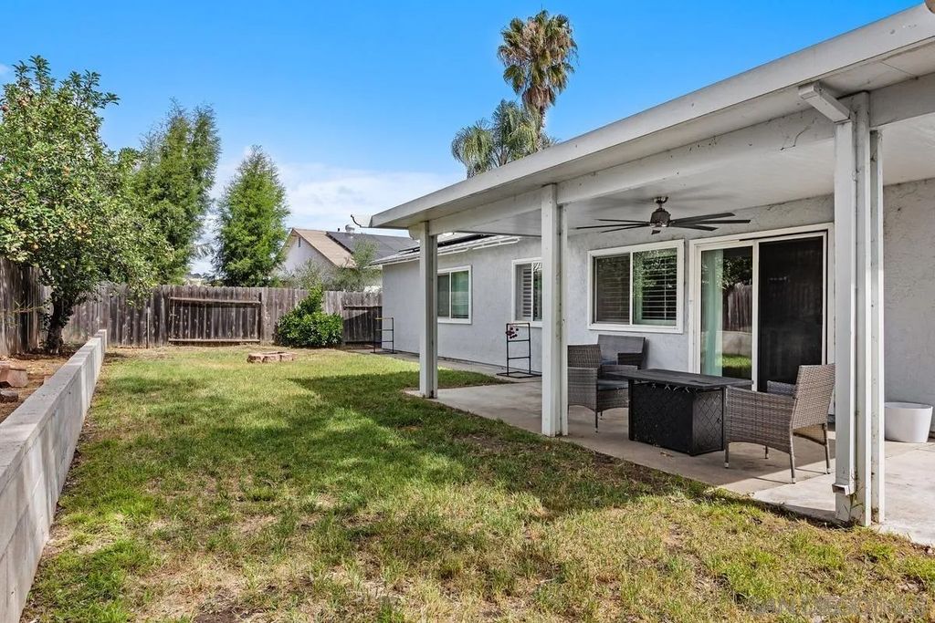 This charming single-level home offers 3 bedrooms and 2 updated bathrooms, ideally situated on a quiet street. Inside, you'll find a spacious living room that flows seamlessly into an open-concept kitchen - perfect for both everyday living and entertaining. Tile flooring enhances the main living areas, while newer laminate flooring adds warmth and comfort to the bedrooms. The primary suite features a generously sized walk-in closet, and both bathrooms have been recently renovated. Window shutters and ceiling fans throughout the living spaces add comfort and style. The home is equipped with dual-pane vinyl windows for energy efficiency, a new roof installed in 2022, and a leased solar system added in 2023. Step outside to enjoy a flat, usable backyard complete with a covered, lighted patio, some fruit trees, and a grassy area which is ideal for gatherings or relaxing evenings. A large side yard offers additional flexibility for storage or recreation. The front exterior welcomes you with a spacious porch and attractive landscaping highlighted by roses and succulents, creating inviting curb appeal.
