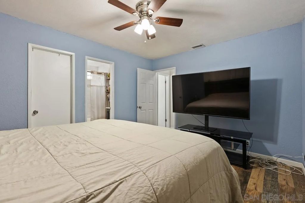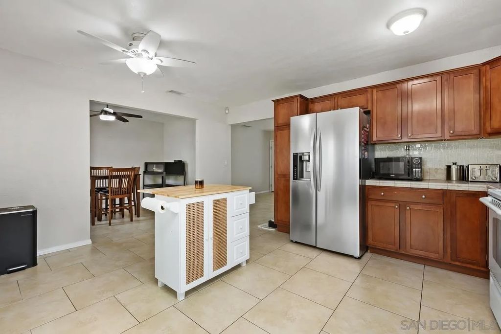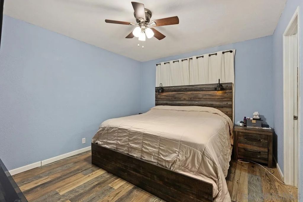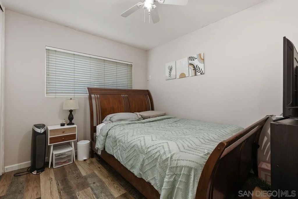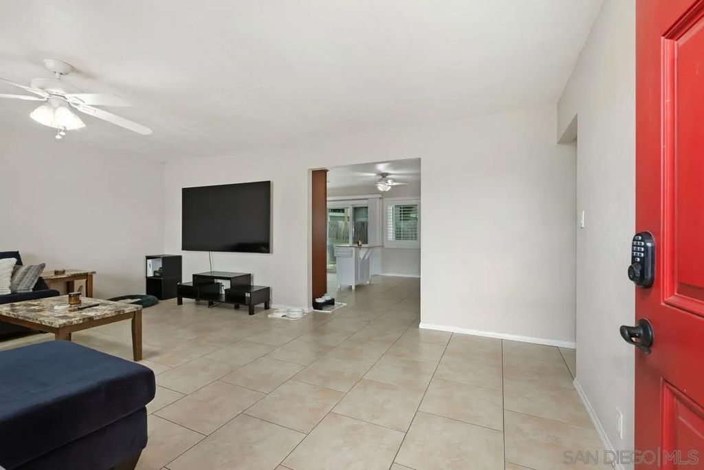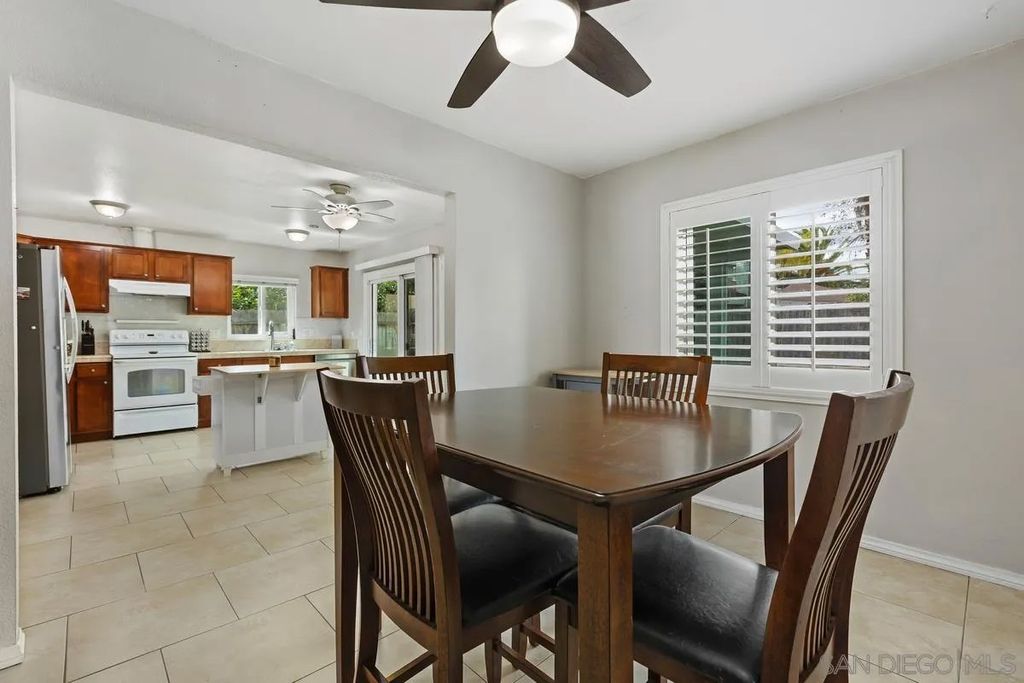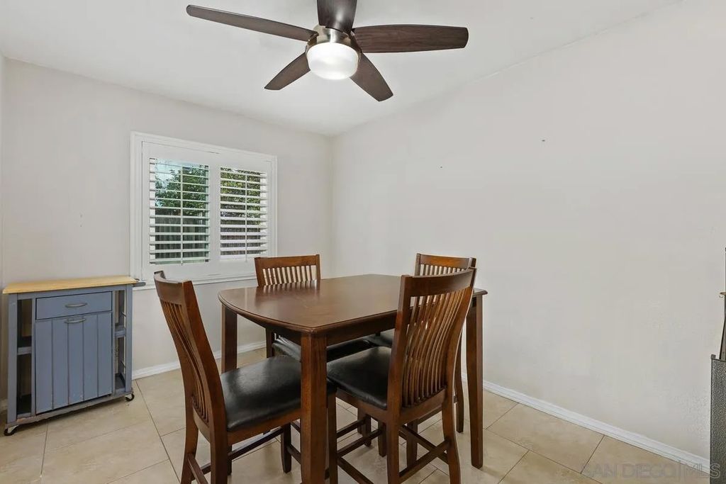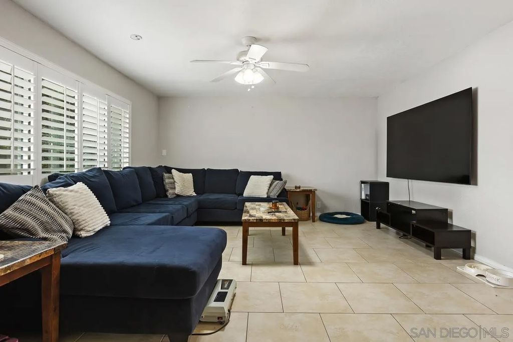 This charming single-level home offers 3 bedrooms and 2 updated bathrooms, ideally situated on a quiet street. Inside, you'll find a spacious living room that flows seamlessly into an open-concept kitchen - perfect for both everyday living and entertaining. Tile flooring enhances the main living areas, while newer laminate flooring adds warmth and comfort to the bedrooms. The primary suite features a generously sized walk-in closet, and both bathrooms have been recently renovated. Window shutters and ceiling fans throughout the living spaces add comfort and style. The home is equipped with dual-pane vinyl windows for energy efficiency, a new roof installed in 2022, and a leased solar system added in 2023. Step outside to enjoy a flat, usable backyard complete with a covered, lighted patio, some fruit trees, and a grassy area which is ideal for gatherings or relaxing evenings. A large side yard offers additional flexibility for storage or recreation. The front exterior welcomes you with a spacious porch and attractive landscaping highlighted by roses and succulents, creating inviting curb appeal.