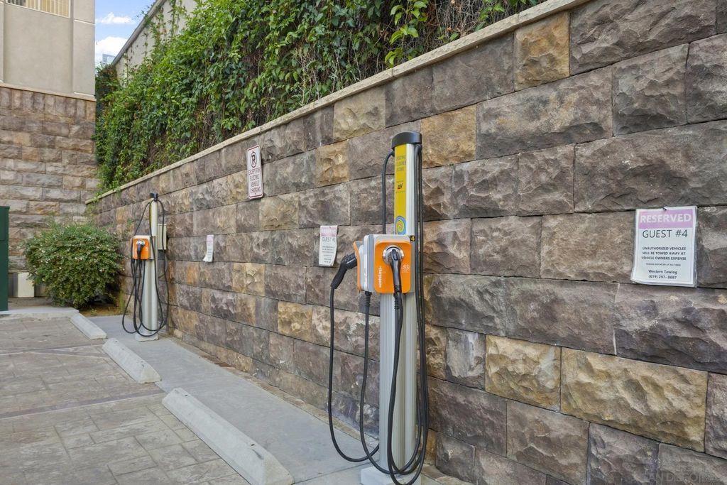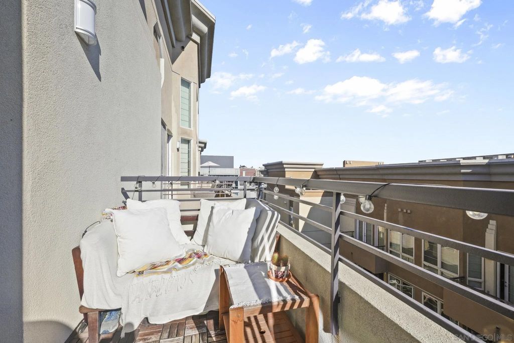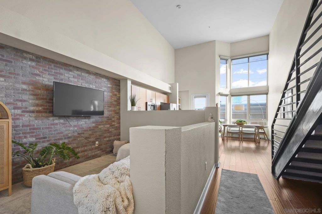 Rare top-floor loft in East Village. Two-story condo features soaring ceilings, dramatic floor-to-ceiling windows, and abundant natural light throughout. The open layout offers urban character with a brick accent wall, engineered hardwood floors, and a spacious kitchen with granite countertops and a gas range. Enjoy skyline views from your balcony, plus upgraded motorized shades with both light-filtering and blackout options. This is a true loft. Ideal for buyers seeking volume, light, and something beyond the typical downtown condo. In-unit washer and dryer, storage cage in garage, and turnkey ready to move in. Union Square offers resort-style amenities: a gym, hot tub, sauna, community room, and electric car charging. Ideally located adjacent to City College, restaurants, local breweries, and Petco Park. Easy freeway access (5, 94, 163). With major redevelopment underway in East Village, now is the time to buy. VA approved and ready for its next owner - come live the loft life today!